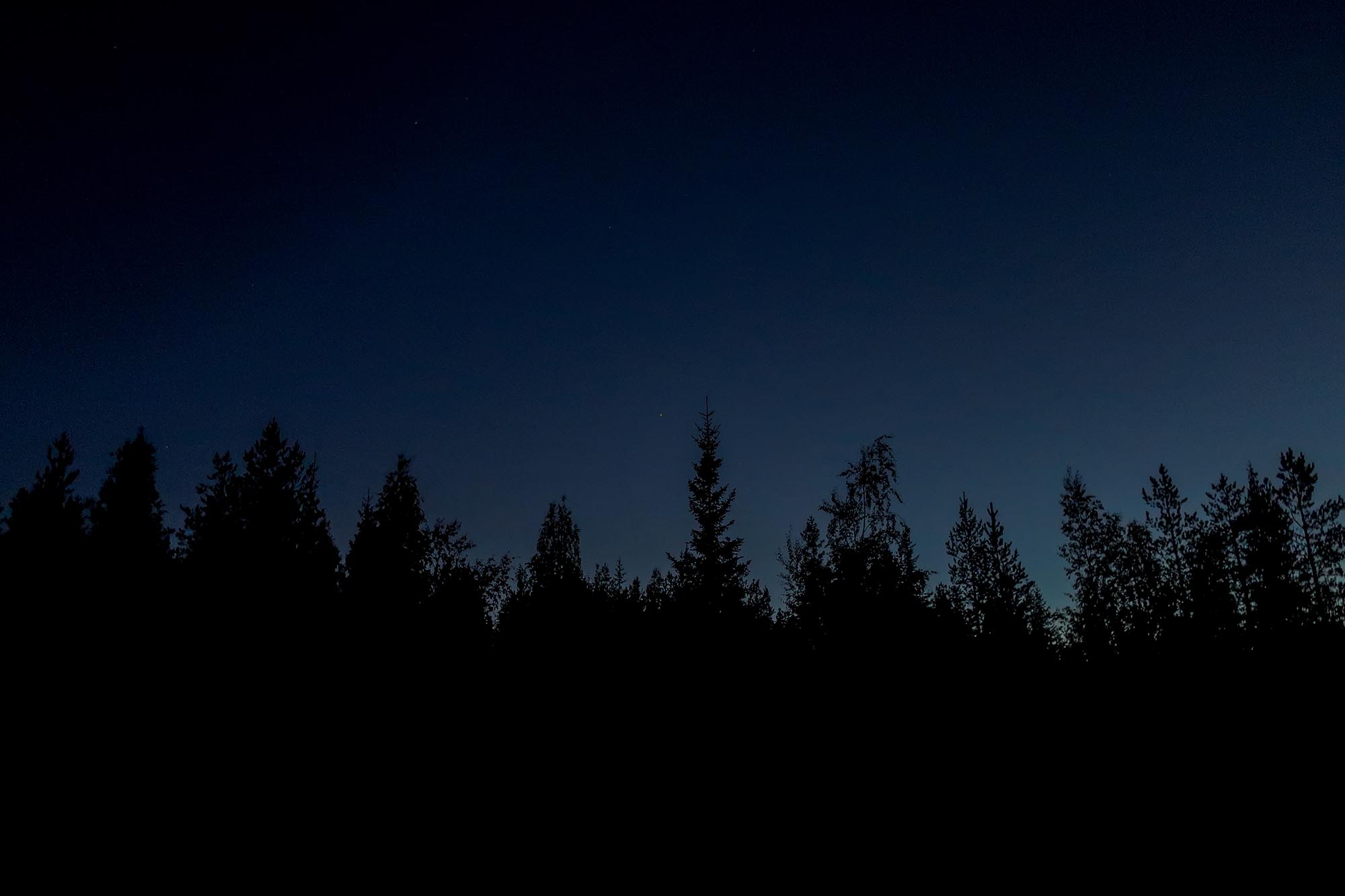 Det slutar med att vi övernattar i tälten. Vi slår upp tälten precis innan mörkret lägger sig. Det mesta av kvällen satt vi vid elden. Kokade den efterlängtade pannan med kaffe och såg stjärnorna uppenbara sig en efter en. Vi spanade efter stjärnkonstellationer, flygplan och satelliter. Och tänk om vi skulle kunna få se norrsken under natten, de senaste veckorna har norrskenet visat sig i stora delar av norra Sverige. Plötsligt är det något som lyser mellan tallarna och det är månen, det visade sig att det var fullmåne den 10 september så månen blev vår nattlampa, dock dröjde det innan den hade höjt sig över trädtopparna.