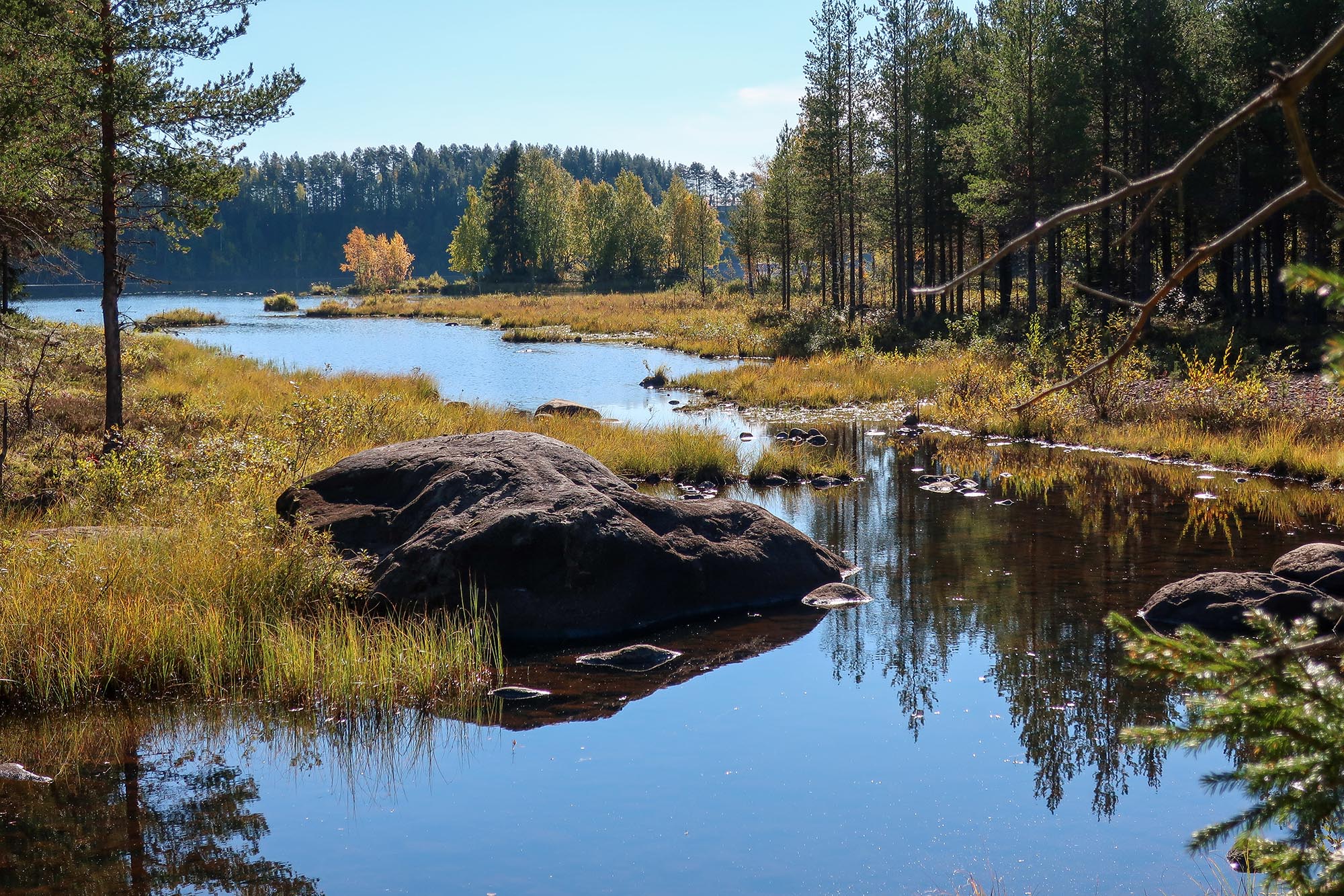 Det fanns några platser som vi alla var överens om att kan räknas till de vackraste i den delen av ekoparken vi vistades i. En var myren vid boplatslämningen som lyste gul mellan tallarna. En annan var utsikten från Kainoberget. Visserligen var den till stor del skymd av uppväxande träd men de glimtar man kunde se om man hittade ett bra ställe att stå på gav en utsikt över skog, myr och vatten. Men den utsikt som var vackrast av alla var nog vyn från stenbänken vid spegeldammen med solens strålar speglade i vattnet tillsammans med de höstfärgade träden.