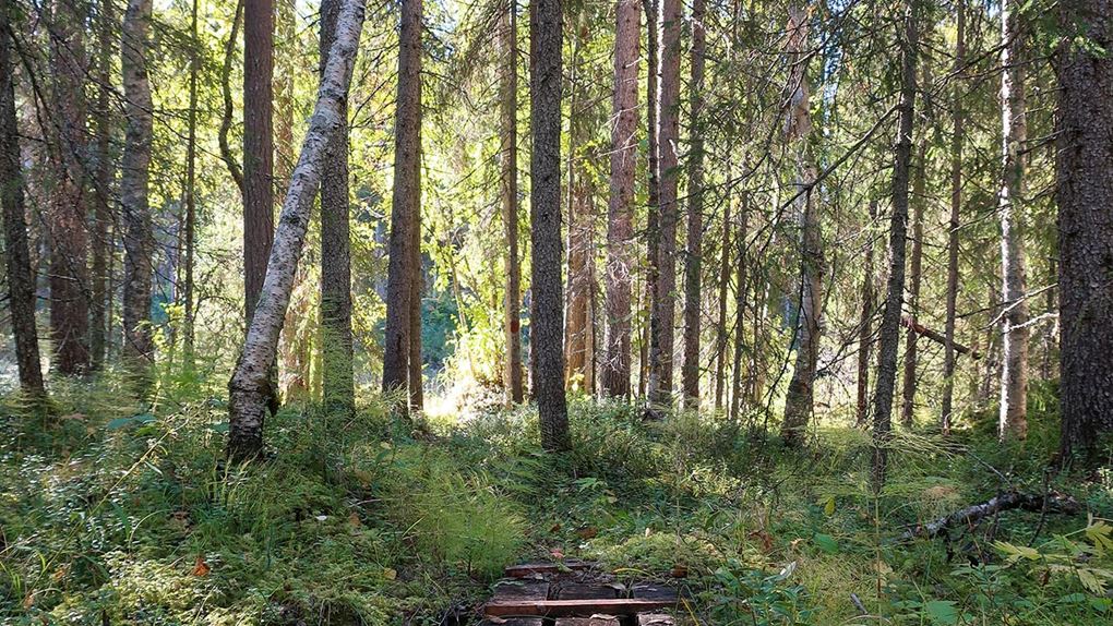 Sophie tog fram kartan på Naturkartan och det visade sig att vi gick mot Padjerimberget och att vi skulle valt den andra vägen för att komma till Kainoberget. Så det är bara att vända om. Men nu utan väskor gick det lättare och på den här vägen var det lite mindre knott av någon anledning. Det prasslade till i ett träd och vi såg en ekorre hoppa mellan grenarna, vi försökte fota den men det var hopplöst att fånga en ekorre högt uppe i en gran i motljus och det blev mest skuggor av trädets grenar.