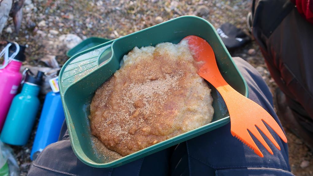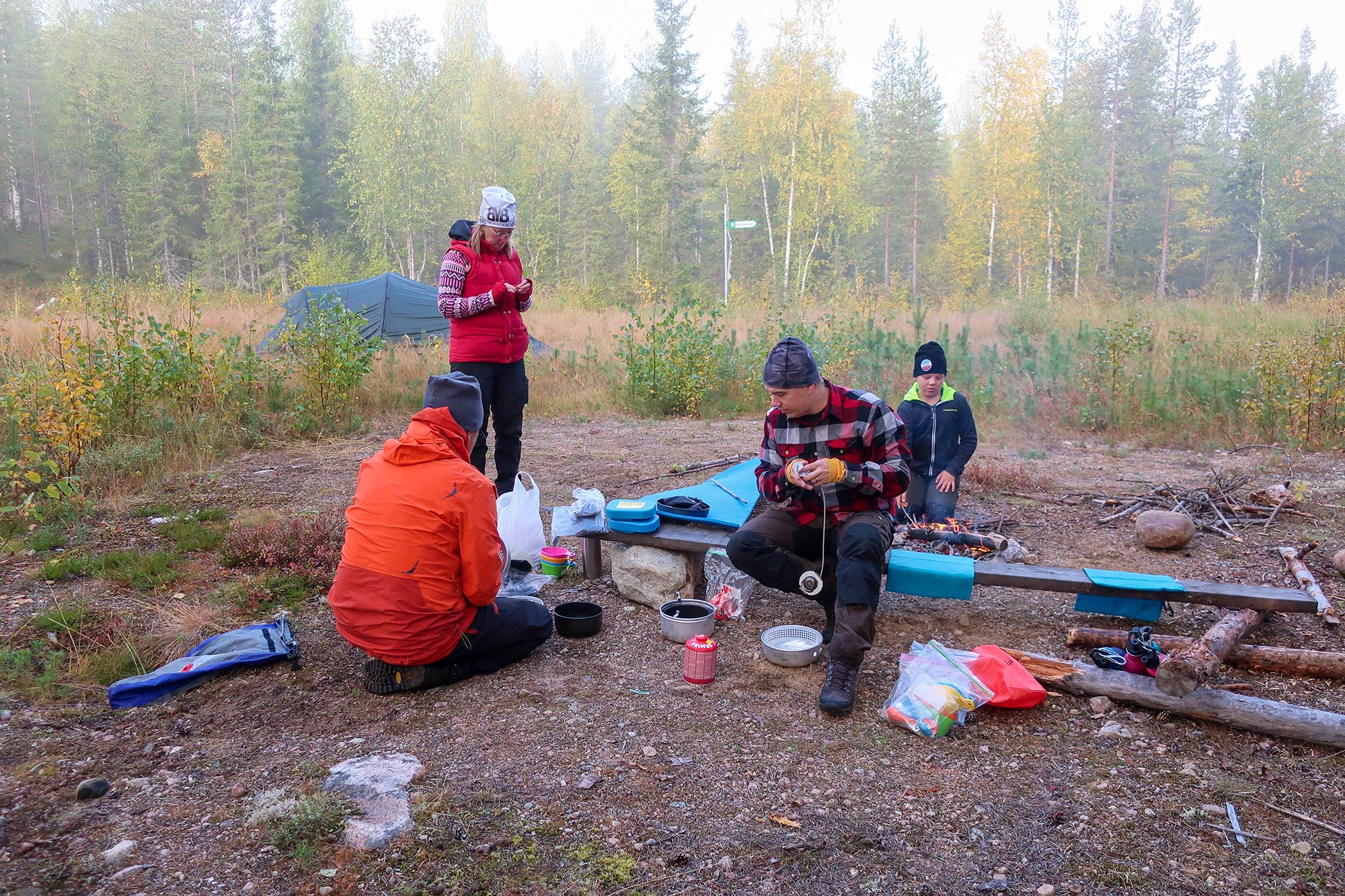 När vi steg ut ur tälten möttes vi av en skog fylld med en tät morgondimma och den omsvepte vår lilla lägerplats med en fantasieggande atmosfär. Joel och Oscar gjorde upp eld och barnen satt sig vid elden medan vi vuxna packade ihop lite i tälten innan vi gjorde frukosten. Det blev havregrynsgröt med mycket kanel och socker, te och mackor med jordnötssmör och kaffe.
