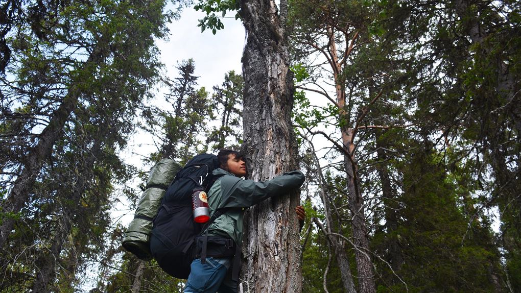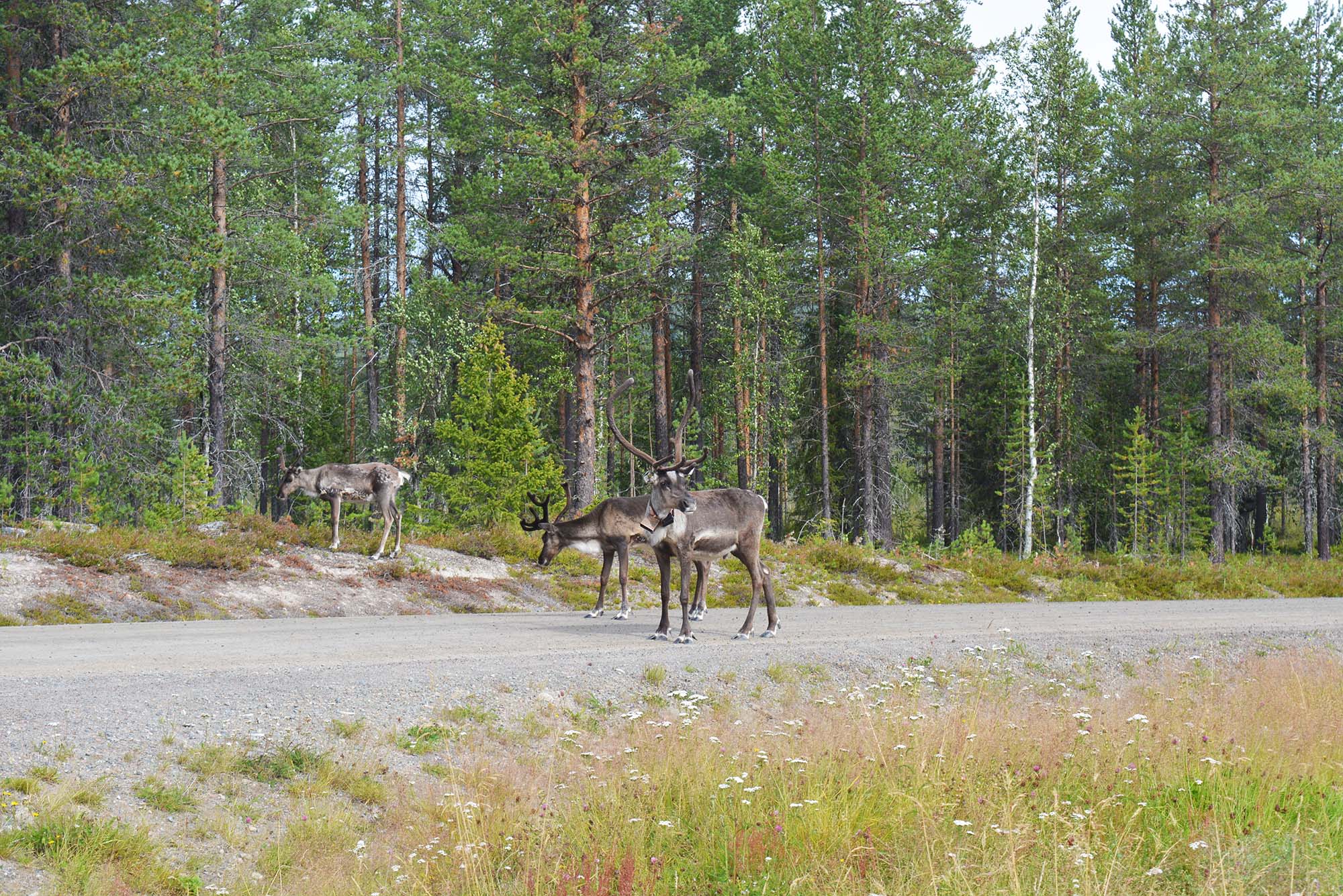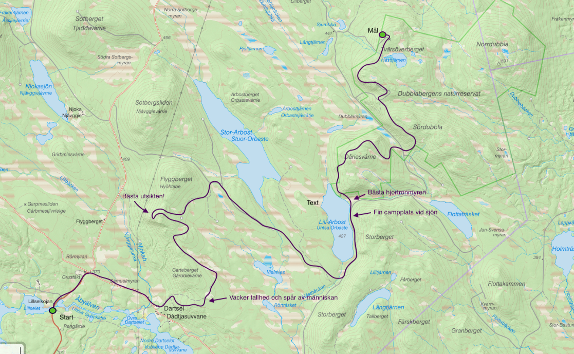 Tämligen trötta väl framme i Dubblabergen omslöts vi av mörker och en tystnad som ackompanjerades av Åbyälvens forsande vatten. När vi tidigt nästa morgon gav oss iväg välkomnades vi av klingandet och klapprandet från en renhjord. En av renarna som betraktade oss från andra sidan vägen lyste med sin snövita päls. Enligt samisk kultur kommer den vita renen med ett budskap av något slag, så detta var en spännande start på vår vandring i Dubblabergen. Vi gick vidare in i skogen och fick känna historiens vingslag där vi gick mellan fångstgropar och stenrösen. Traskandes över en tallhed funderade vi över vilka som ursprungligen trampat upp dessa stigar, vilka som levt i torpen, vad de tänkt och känt.
