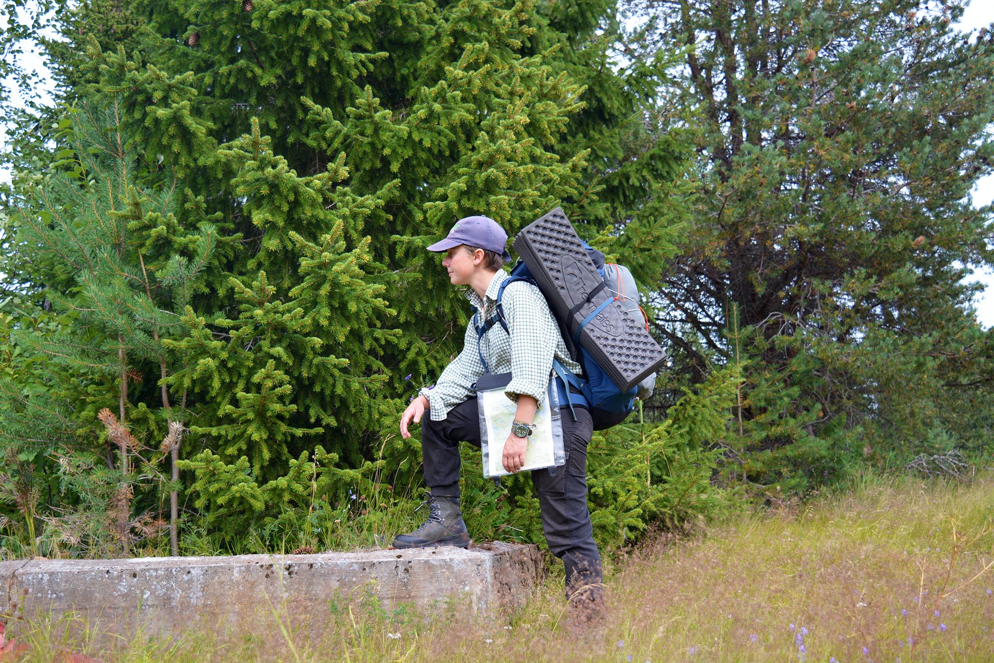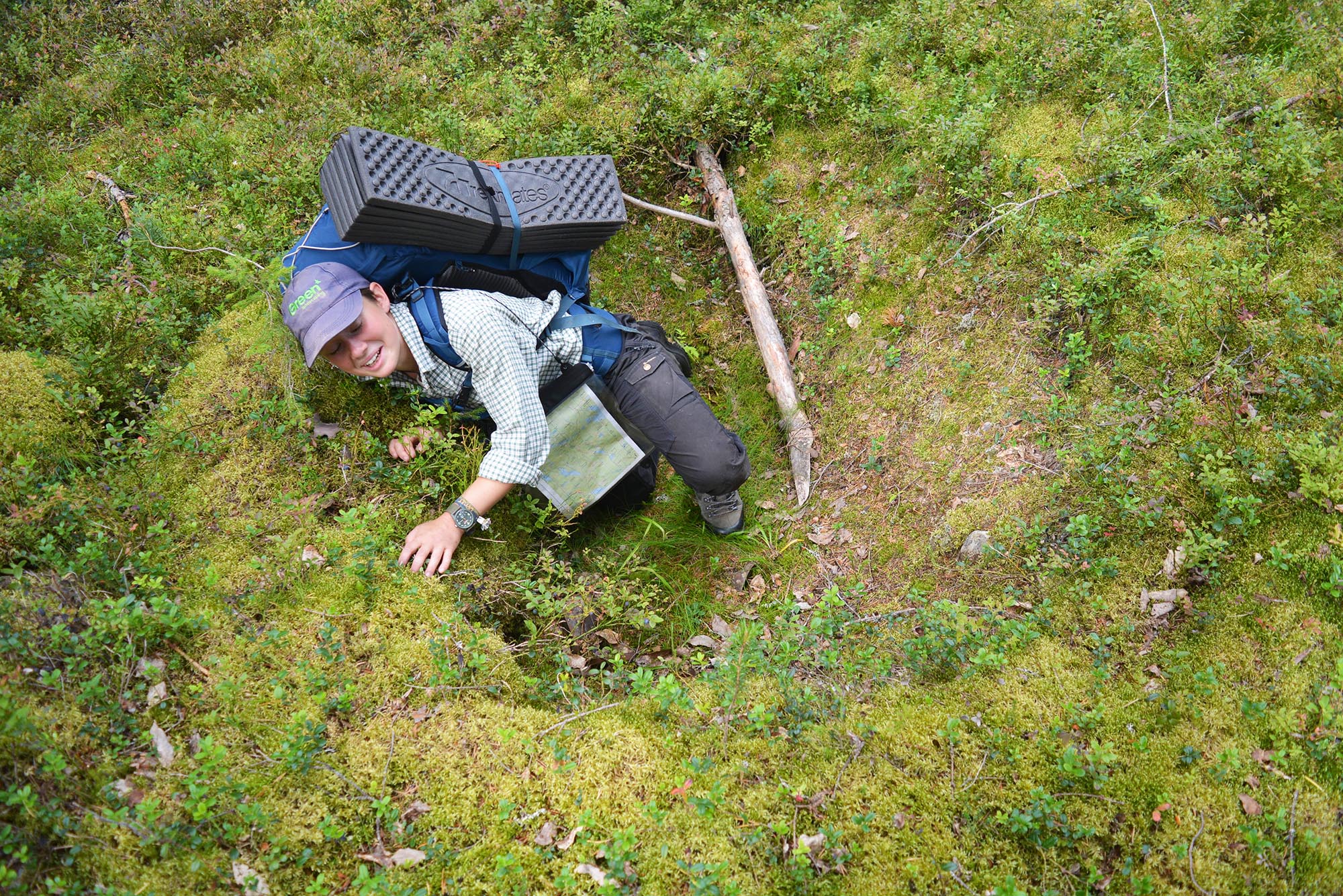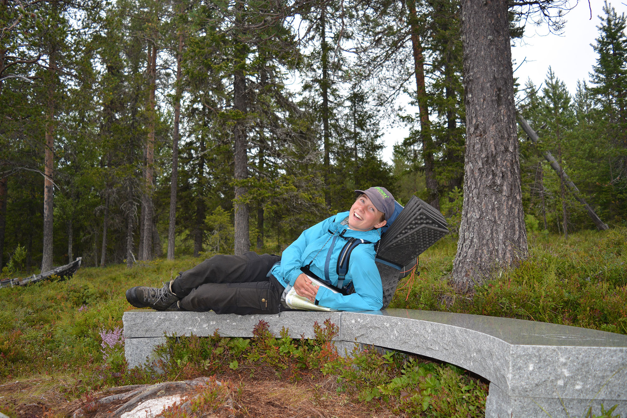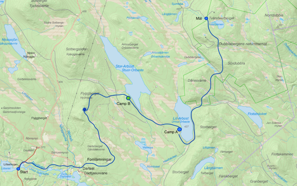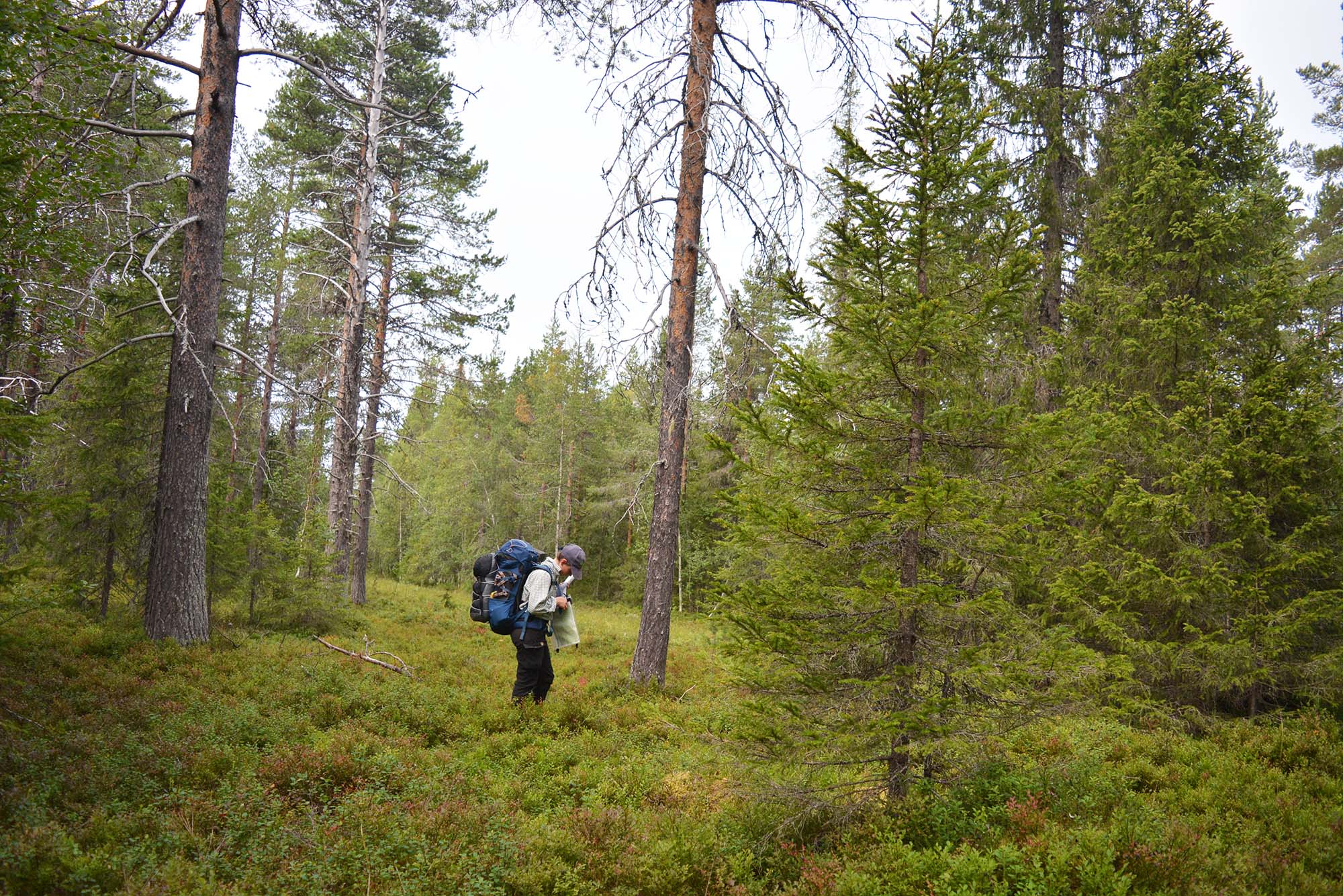 Det dröjde inte länge innan stigarna mynnade ut i snår, och vi fick sätta kurs med karta och kompass i högsta hugg. Att vara oberoende av leder och istället att orientera sig med den kartkunskap vi fått under vår friluftslivutbildning på Dalslands folkhögskola var befriande och riktigt skoj. I Dubblabergen är det gott om toppar och dalar, så det vi gjorde var att följa höjdkurvorna för att orientera oss. Detta kommer också med en insikt om hur logik och resonemang inte alltid räcker till och den planerade vägen är inte alltid rätt. Då gäller det att lyssna på vår alldeles egna inre kompass, nämligen magkänslan.