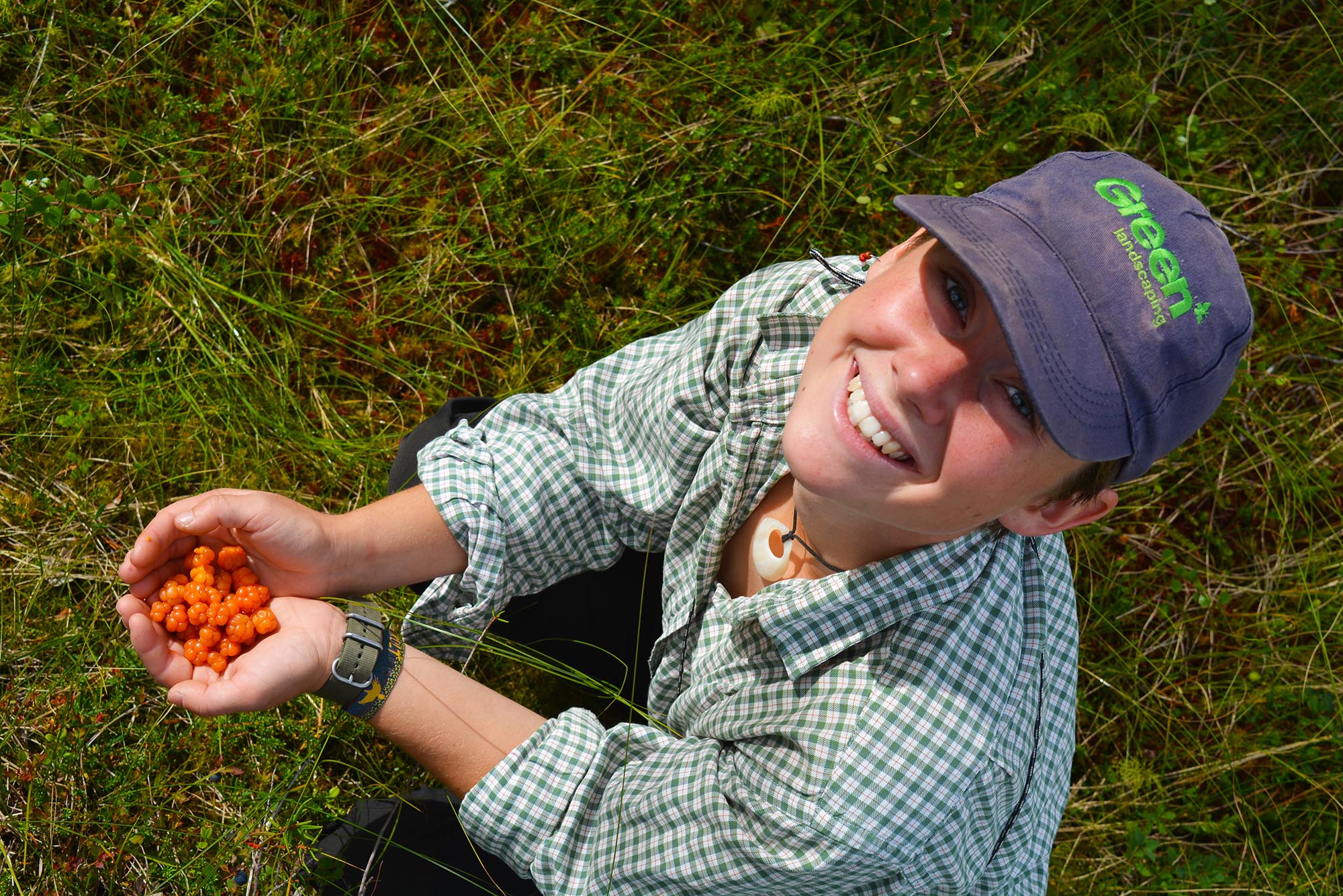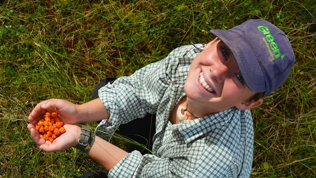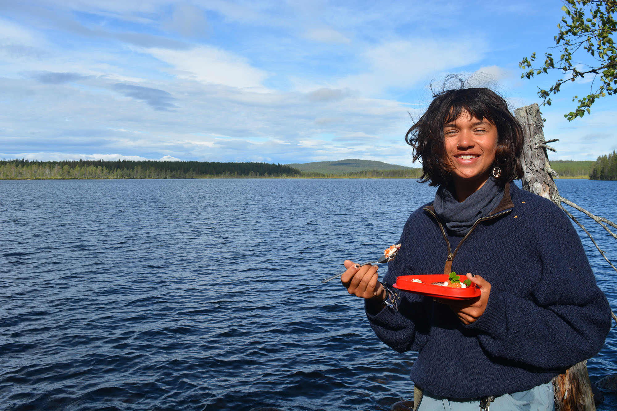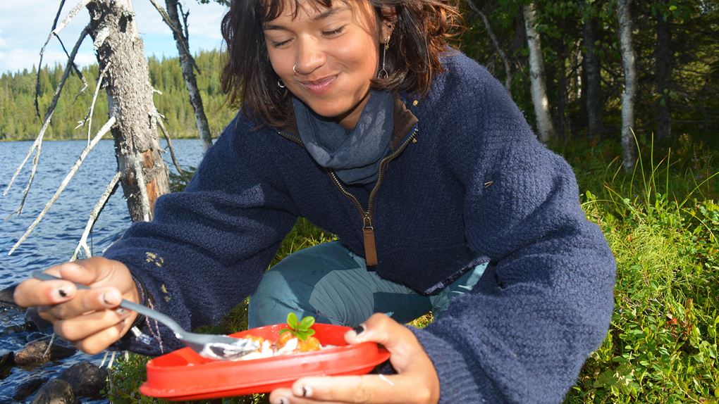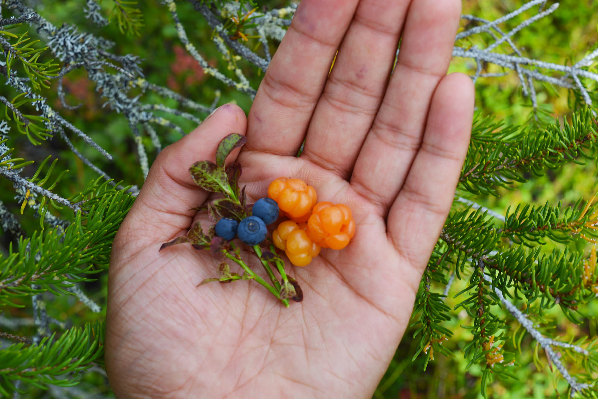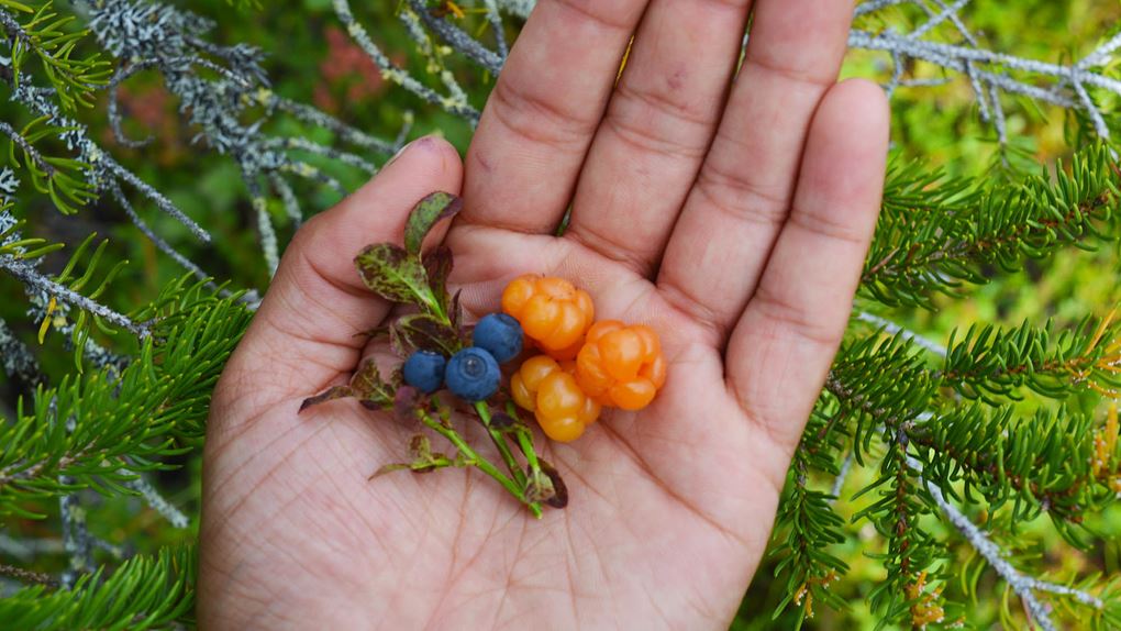 För fikafolk var ekoparken ett magiskt skafferi. Vid varje snackspaus kunde vi fylla händerna med skogens godsaker. Blåbär, lingon och hjortron. Vi båda kan inte låta bli att le när vi tänker tillbaka på då vi såg de första hjortronen på myren, upp mot berget. De lyste som små solar i den våta mossan. “Det här är det första hjortronet i mitt liv!” utbrast Salima.
