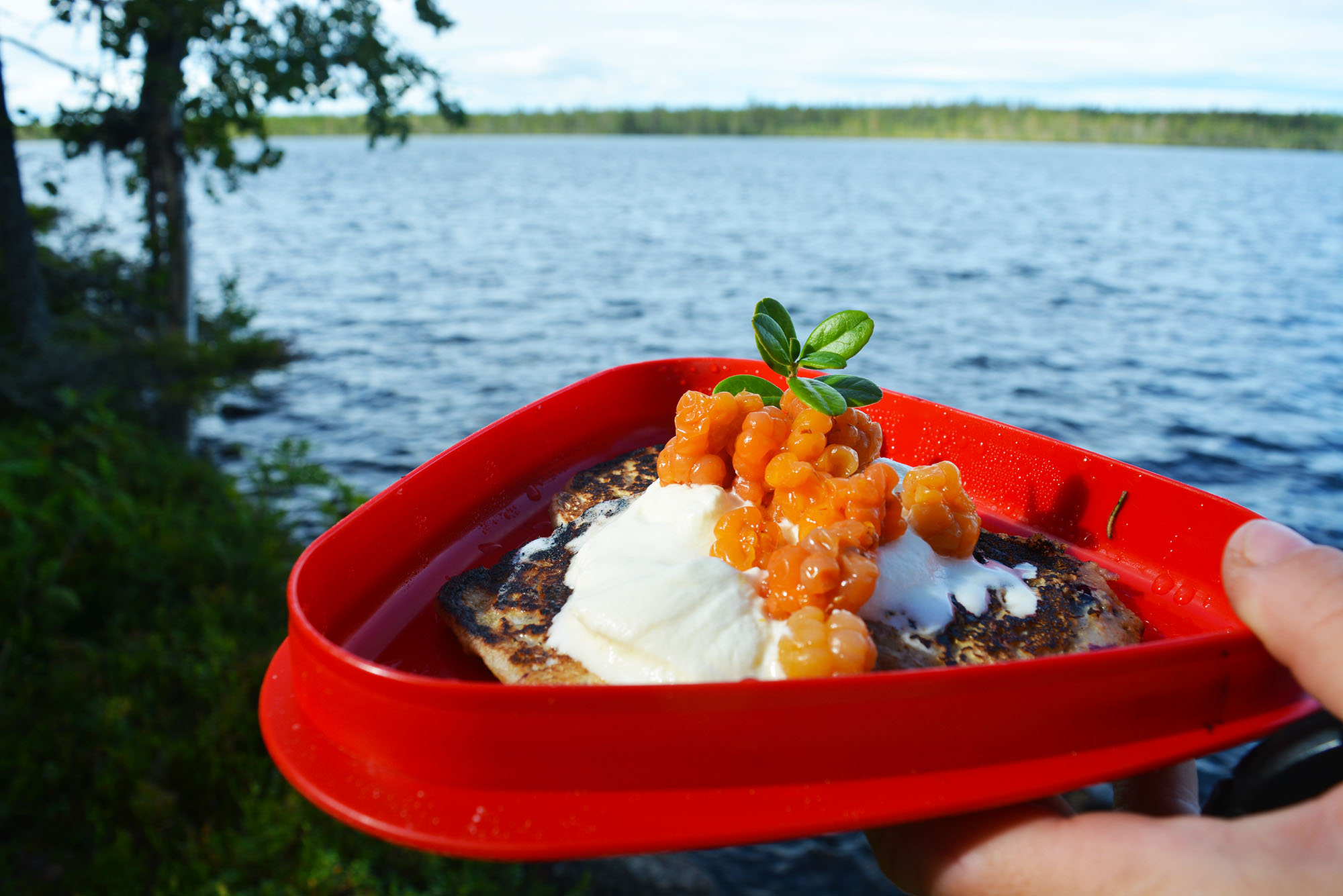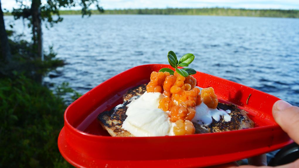 Efter en god nattsömn i tält, lite norr om ekoparkens stenbänk vid en vacker tjärn, lyxade vi till det med en ännu godare pannkaksfrukost. Frukosten följdes av bärmumsande och ett uppfriskande morgondopp.