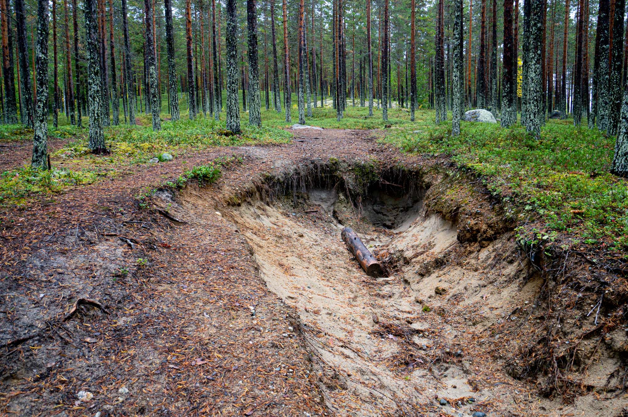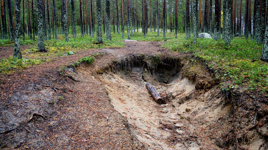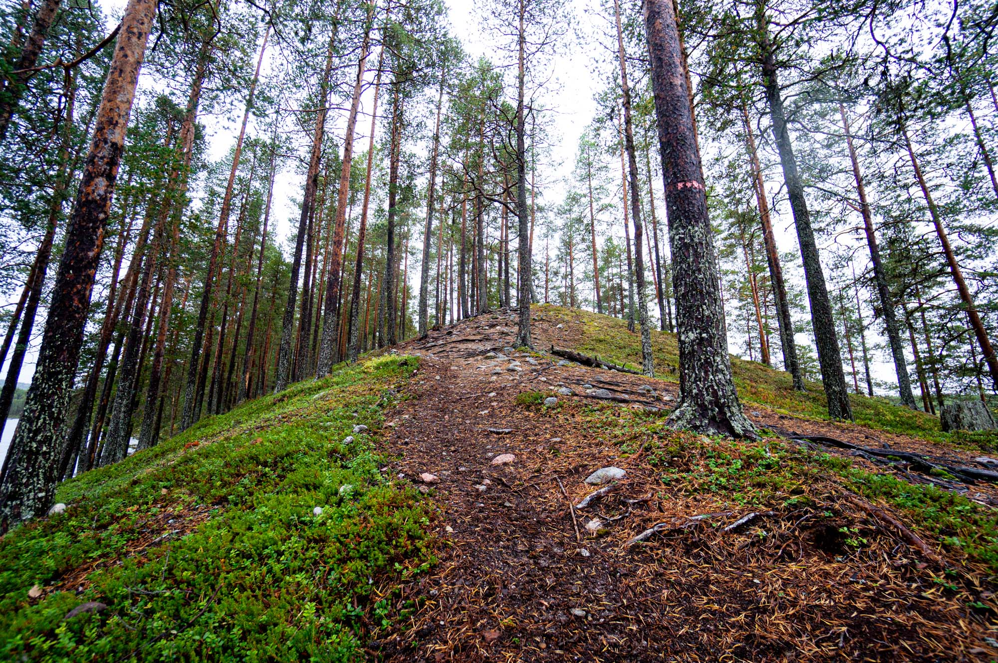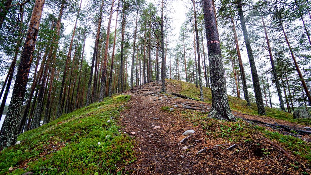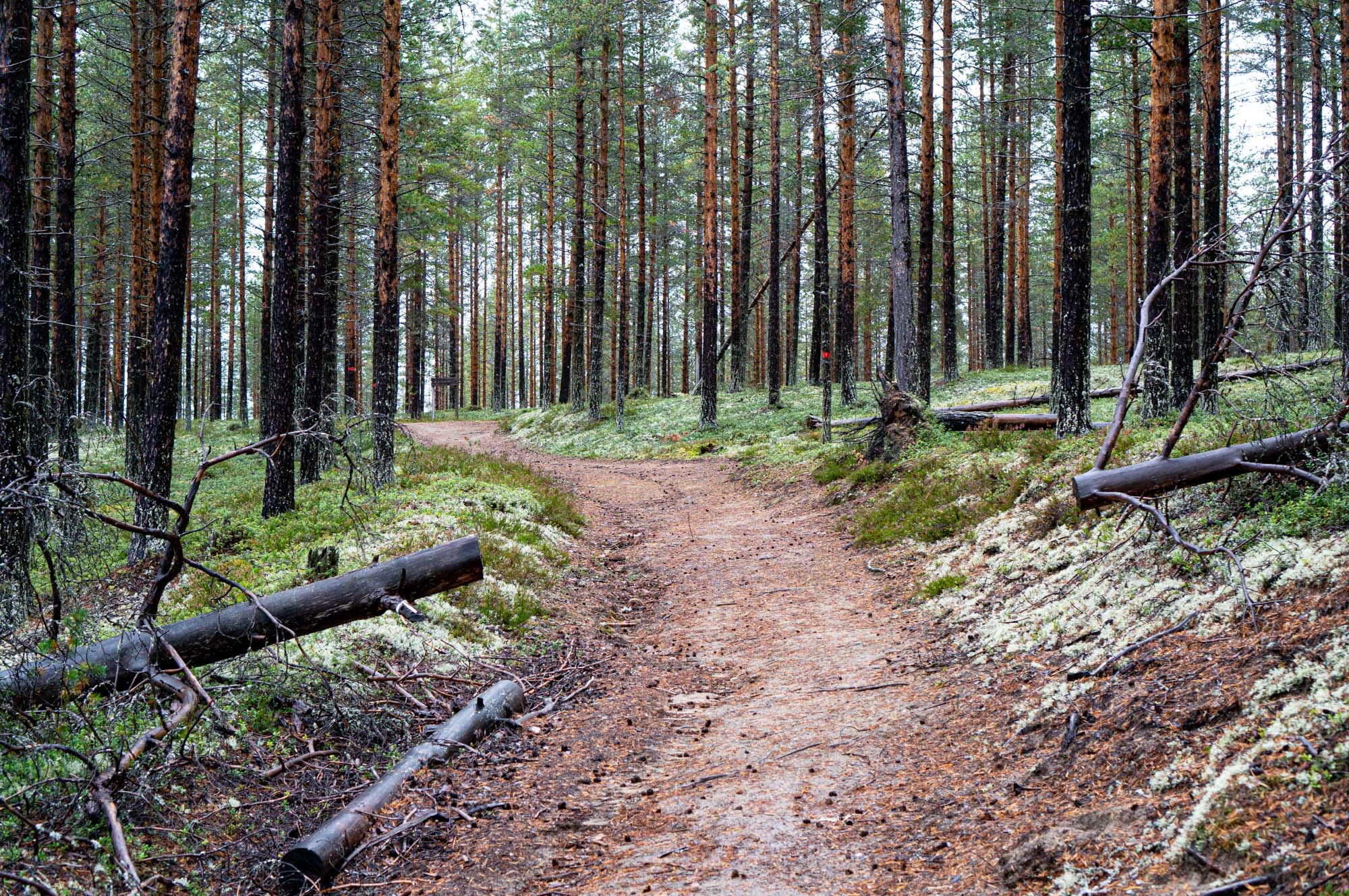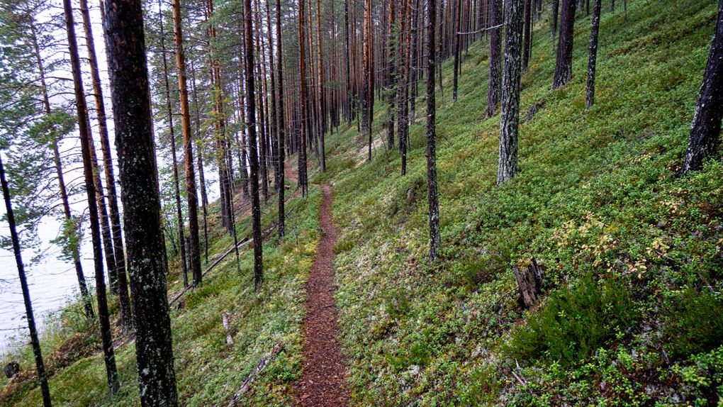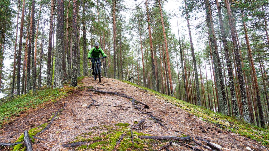 Isälvsleden snirklar sig upp och ner hela tiden i mitten på kammen. Lagom utmanande, men jag måste erkänna att jag var tvungen att leda cykeln uppför några av de brantaste partierna. Nerför var det bara att släppa på men det krävdes koncentrerad cykling då rötterna på stigen hade blivit hala av de senaste dagarnas regnande. Den känsliga terrängen innebär att det krävs kontrollerad inbromsning för att undvika stoppsladdar som kan skada stigen.