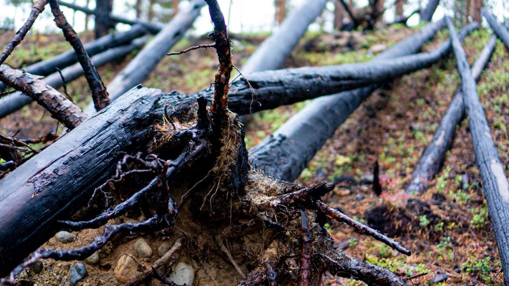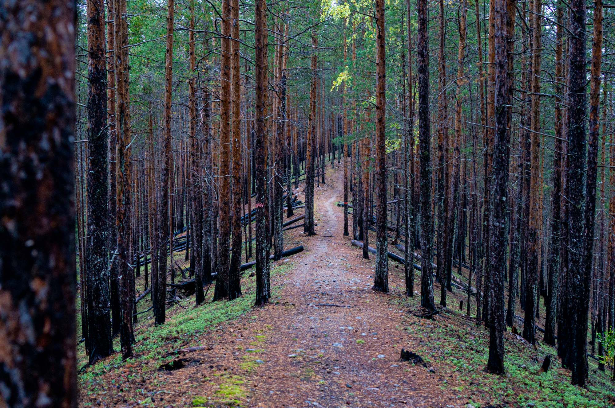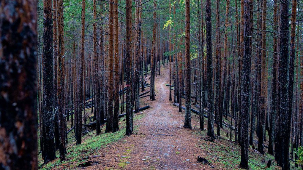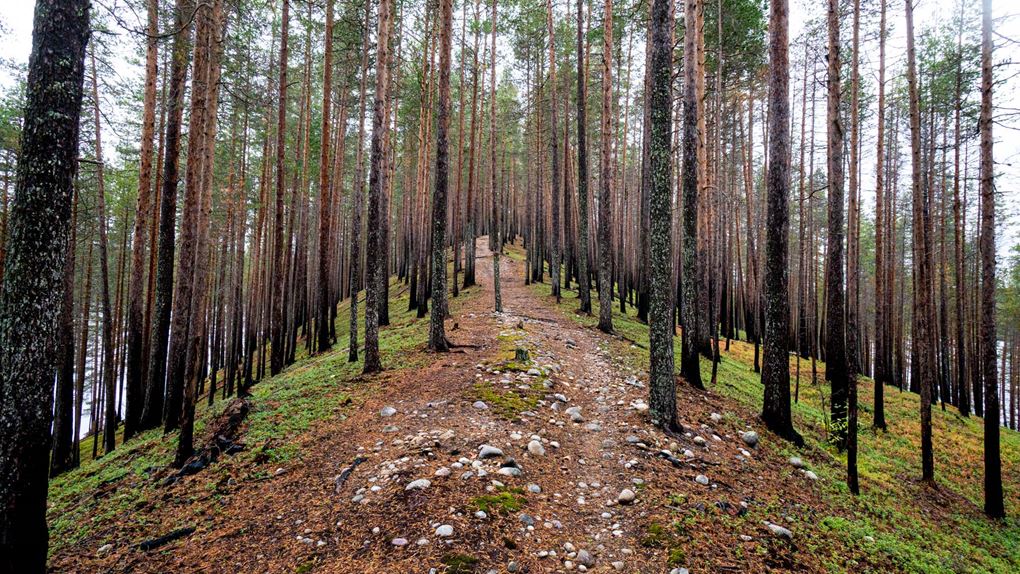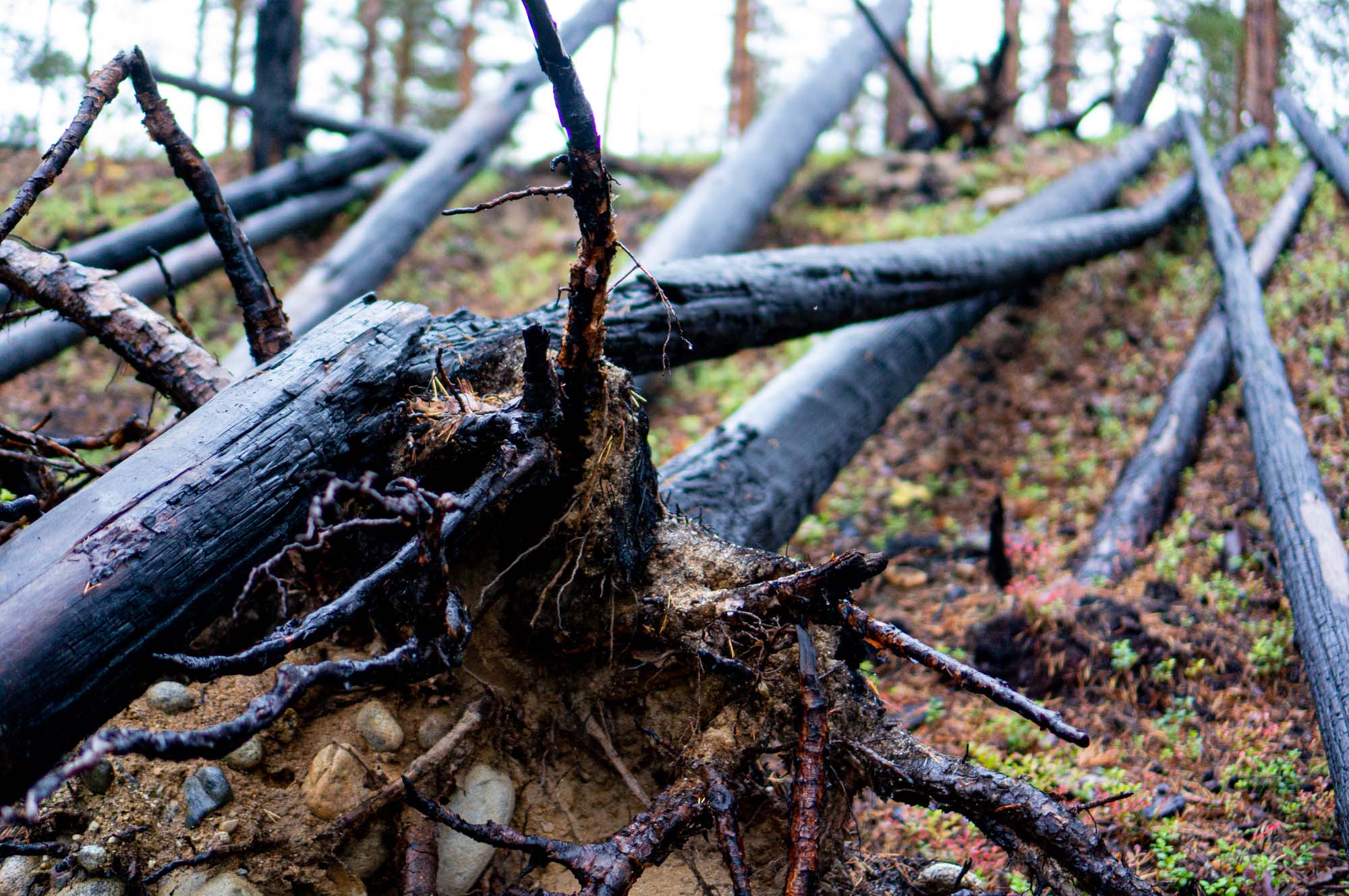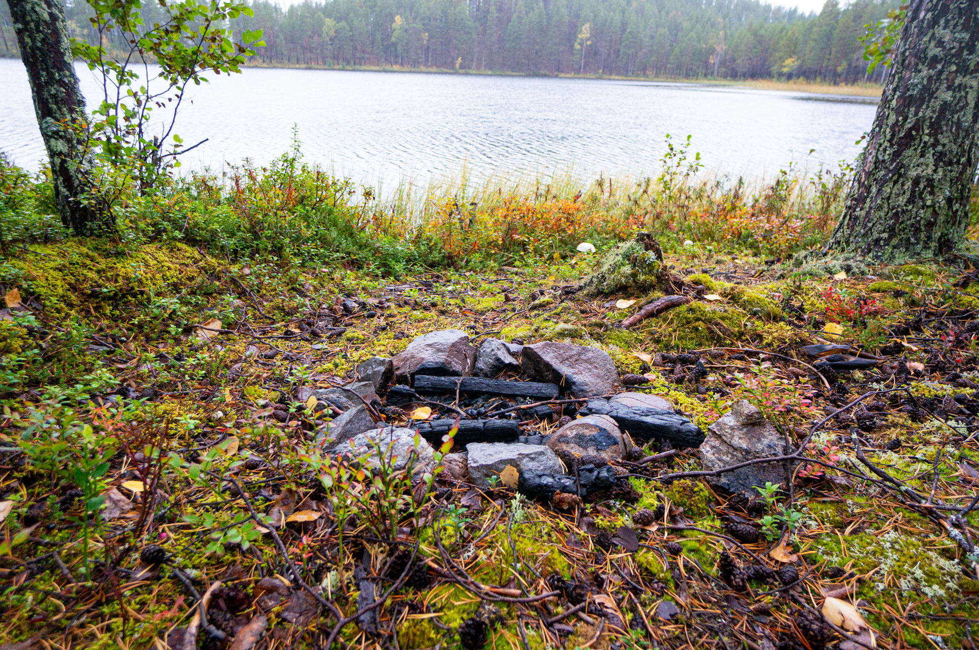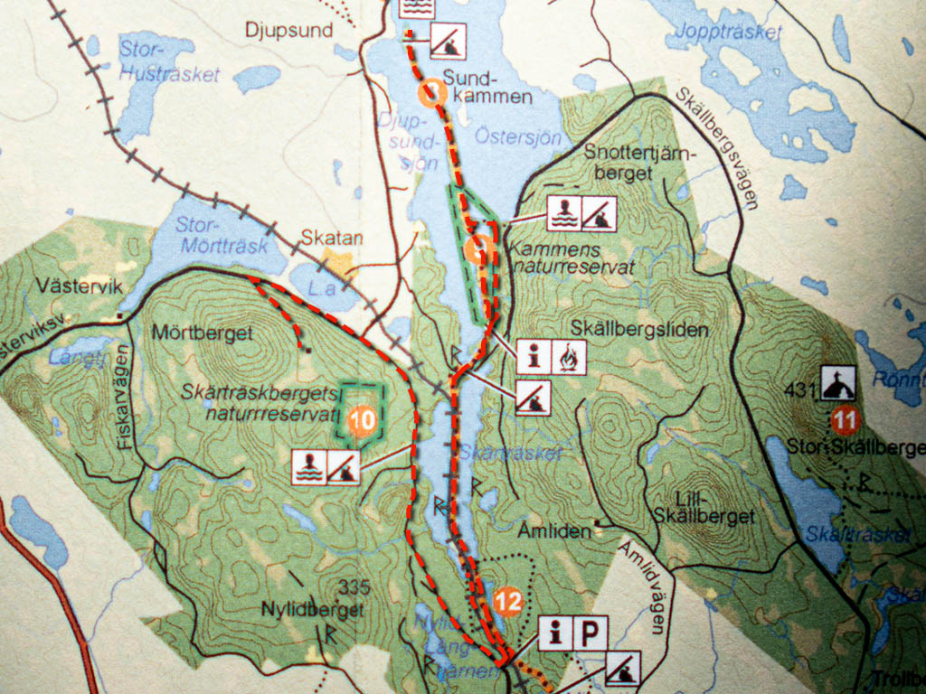 Området på Sundkammen har utsatts för brand och resultat såg dramatiskt ut med tallarnas svarta bark och de förkolnade trädstammar som låg i blåbärs- och lingonriset, känslan förstärktes av storlommens melankoliska läte. Jag stannade till vid slutet på Sundkammen, där låg den båt förtöjd som möjliggör en fortsättning på leden mot Åmsele. Jag valde dock att vända tillbaka och cyklade sedan mot Mörtberget.
