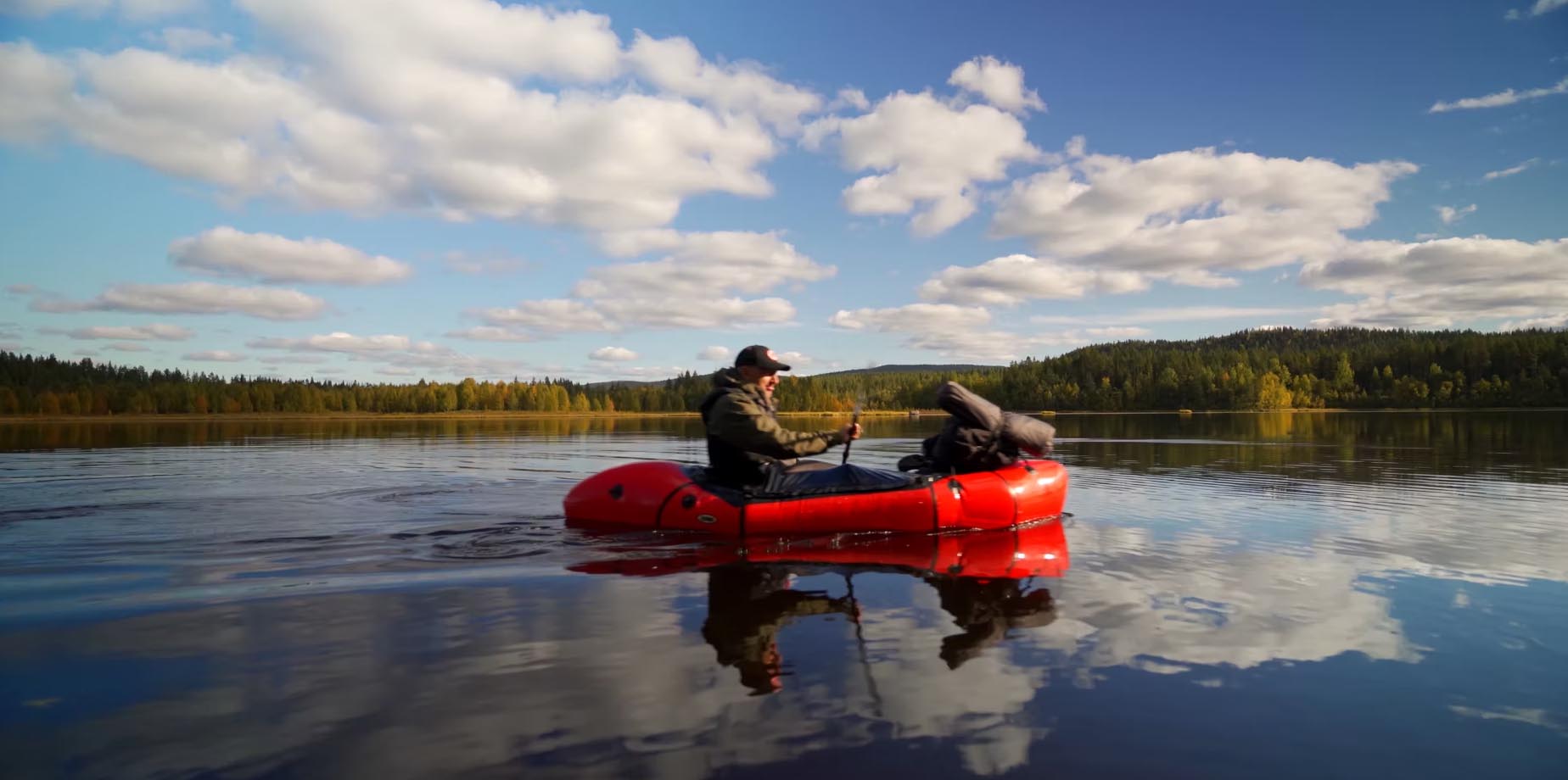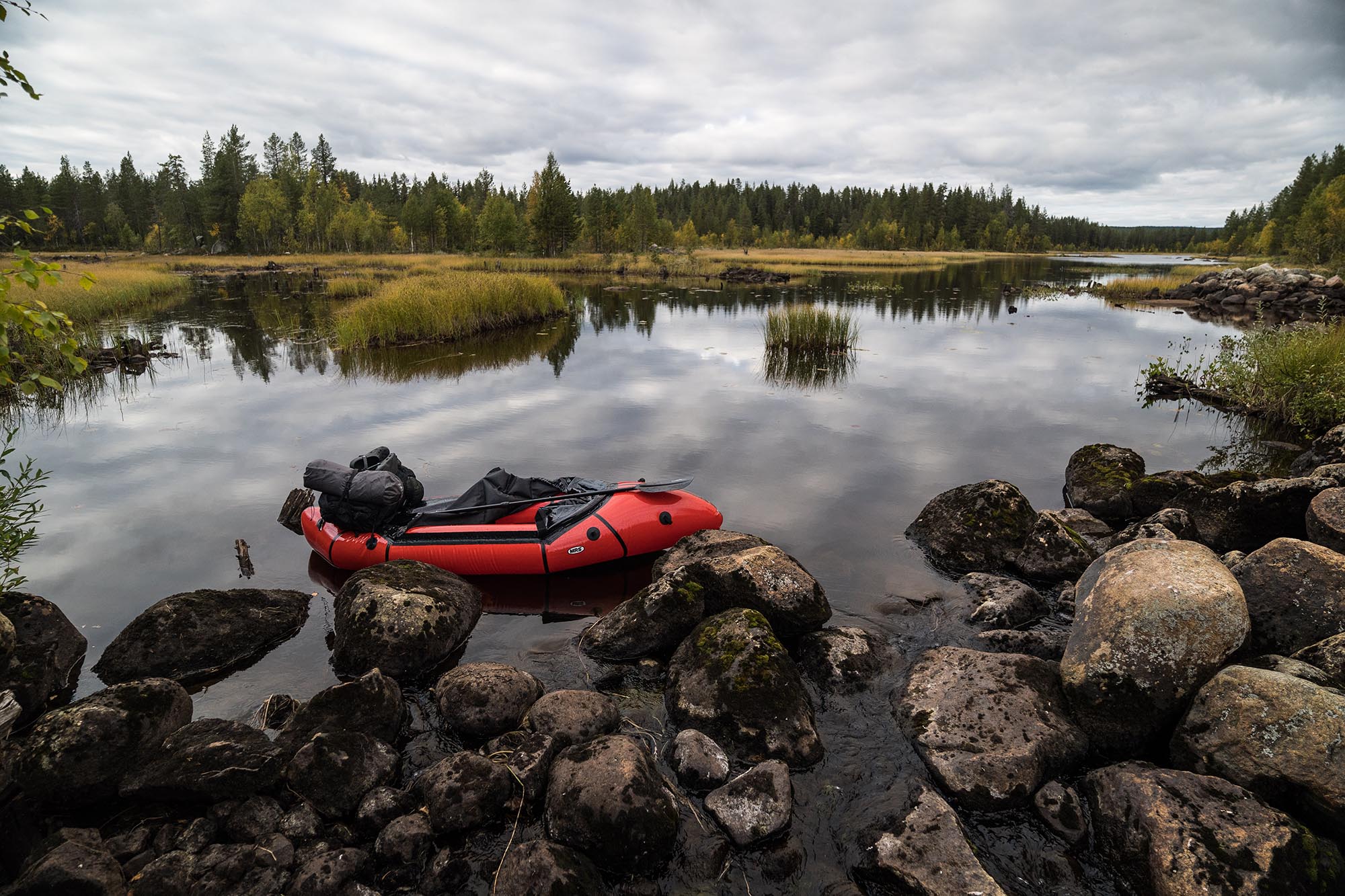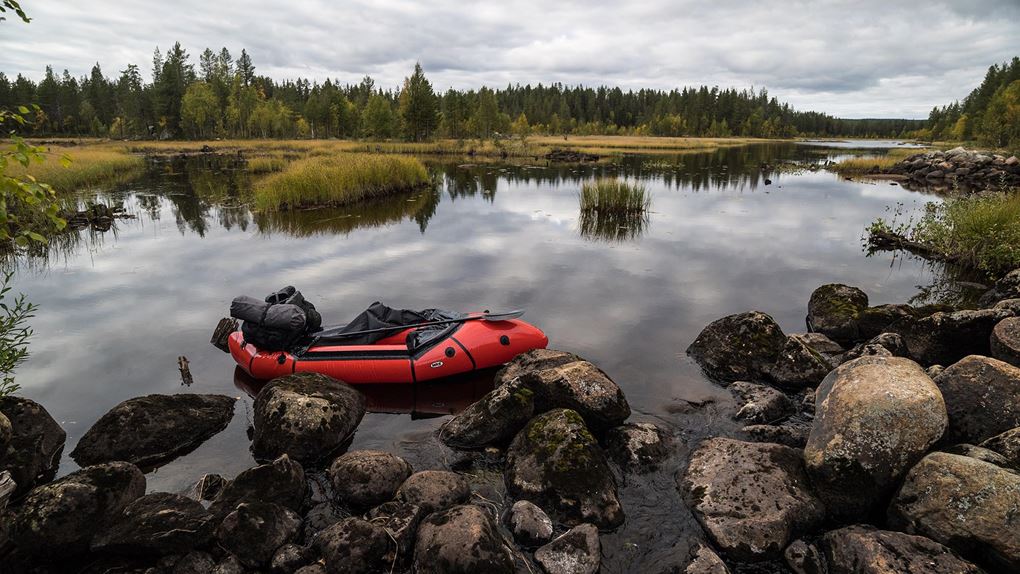 Vid tvåtiden har jag tillryggalagt runt 8 km, och är framme vid kanten av sjön Vuollávrre. Jag blåser upp min packraft, och efter en snabb lunch paddlar jag iväg längs den vindlande sjön. Längs stränderna lyser den vackert höstgula björkskogen.