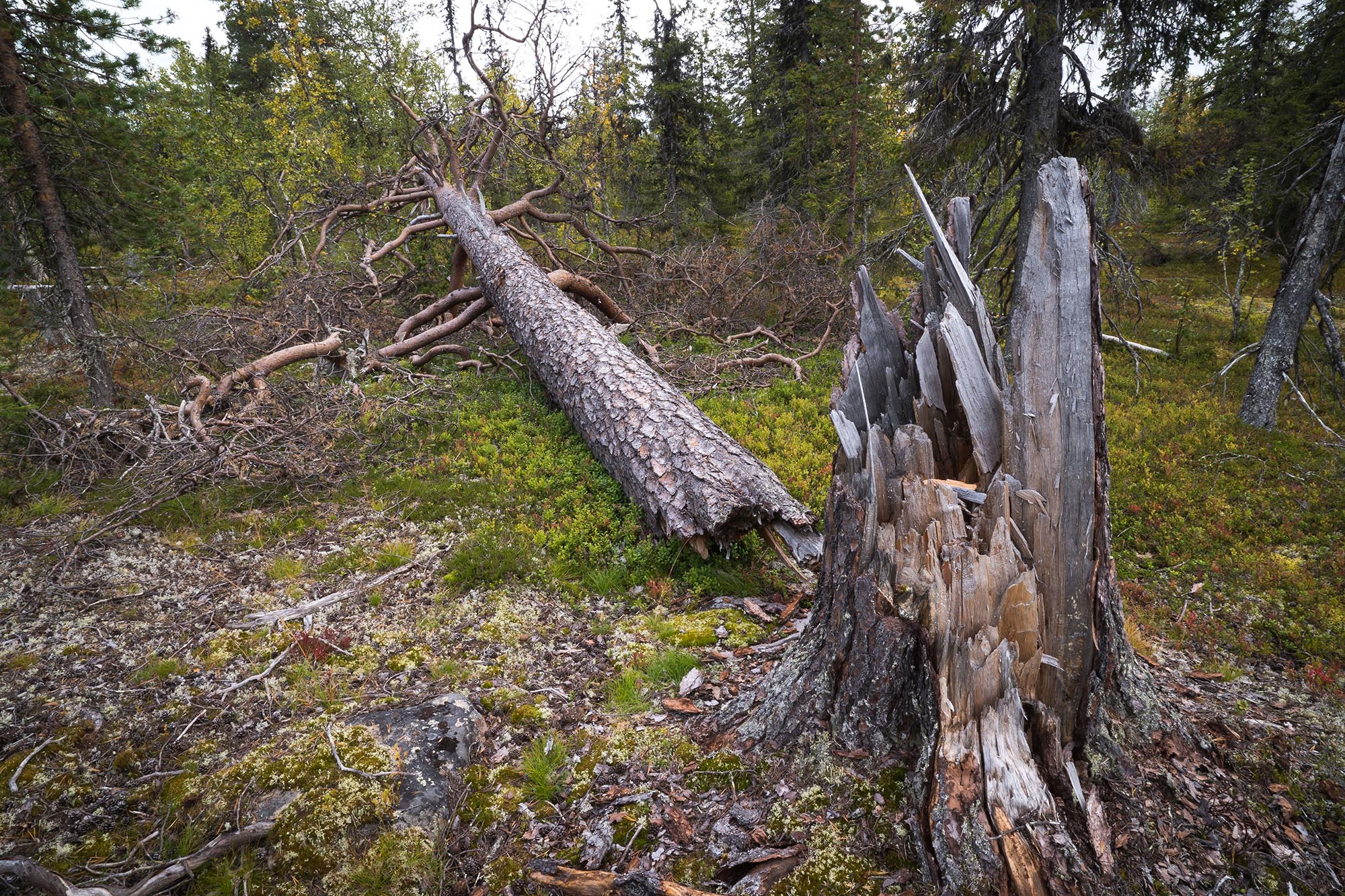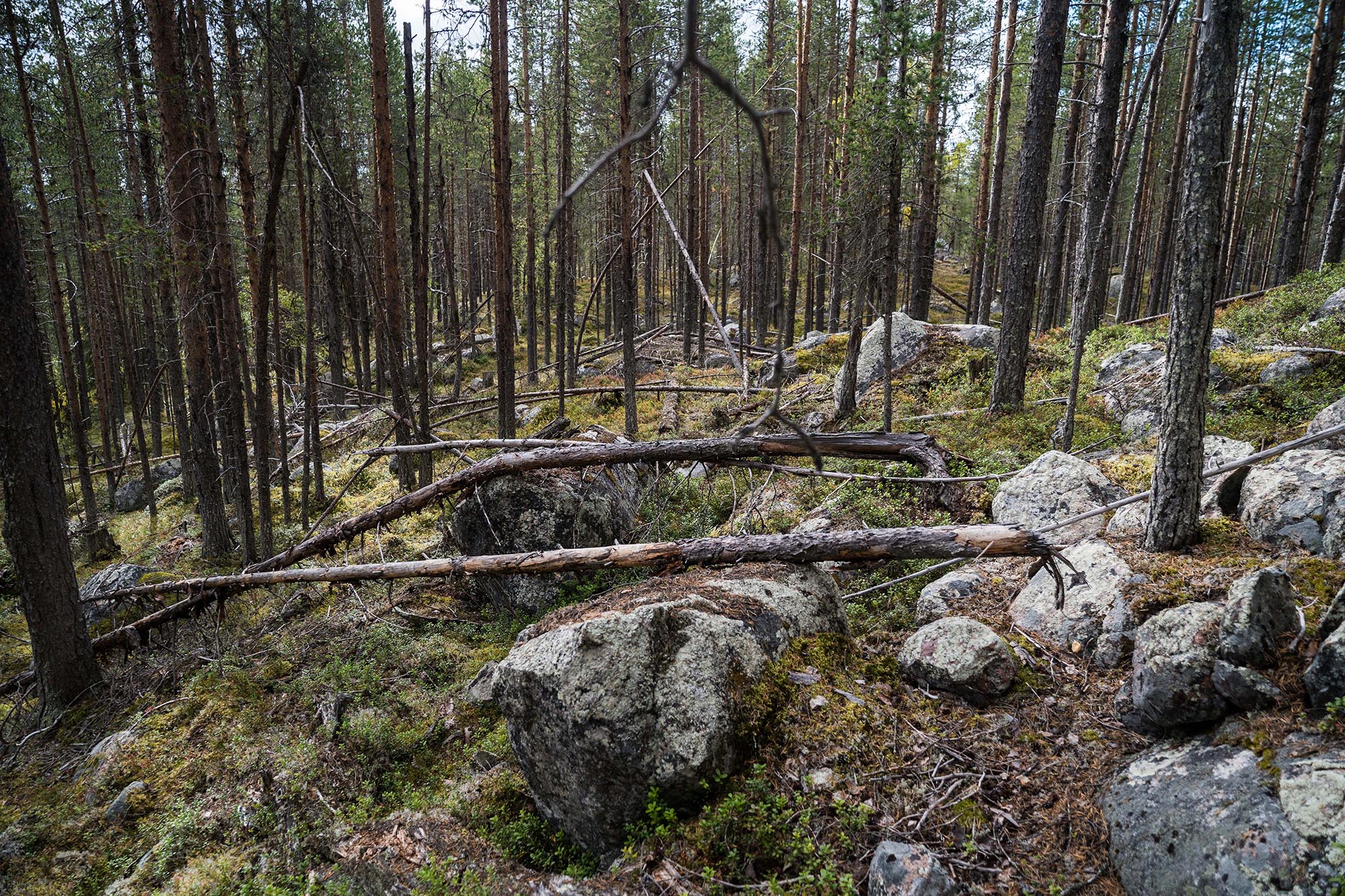 Sedan bär det av igen. Idag går färden mot nordost. Det är en omväxlande förmiddagsvandring - över små trolska myrar, längs en vacker skogsbäck och över branta tallbeklädda åsar. Jag går skrå på sidan av berget Subekvárre. Här är moränen av den grövre kalibern, och den vindfällda skogen ger intrycket av att de lokala jättarna har spelat ett parti plockepinn på berget i närtid.