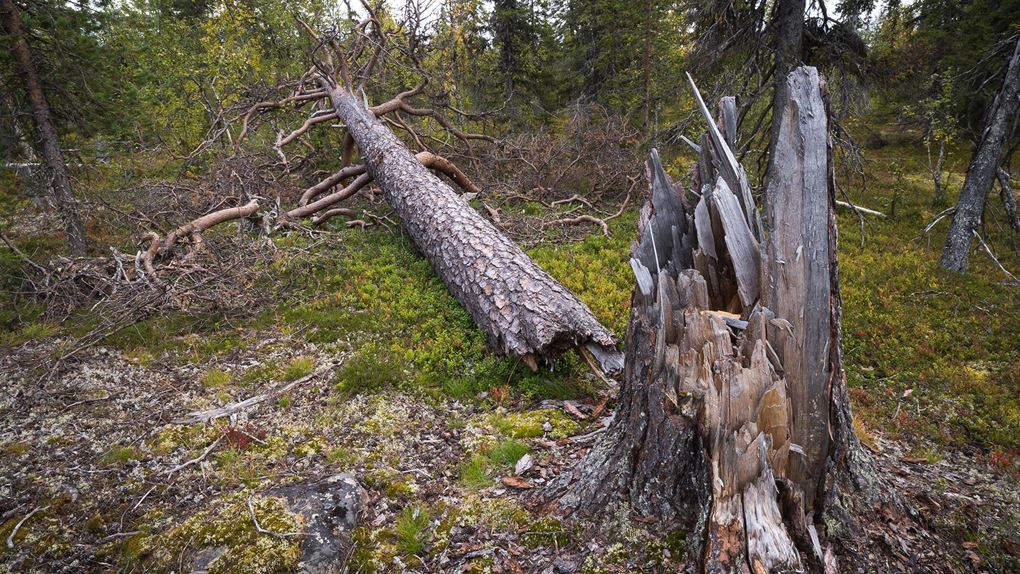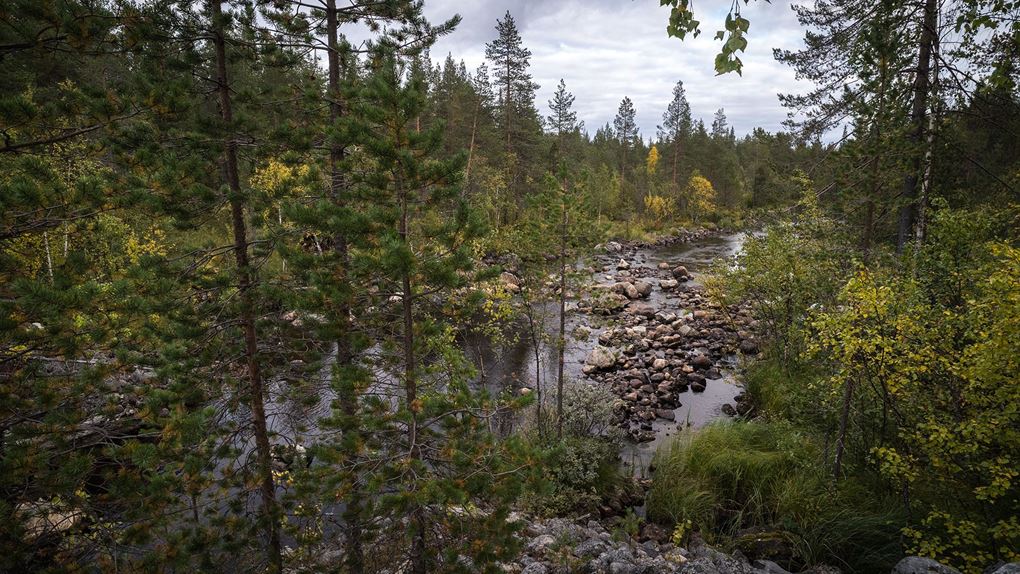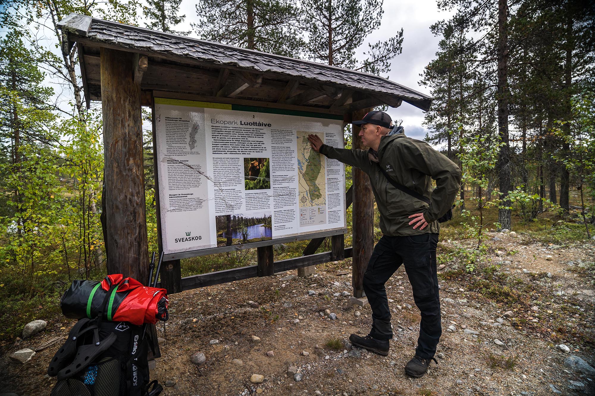 ”Ekopark Luottåive” står det på den stora informationsskylten. Här finns det ”urskogslika skogar med höga naturvärden och många hotade arter” läser jag, de äldsta tallarna är mer än 500 år gamla, och granarna 300 år. Gott om djur är det visst också. Björn, skogsmård och kungsörn nämns. Mäktigt.