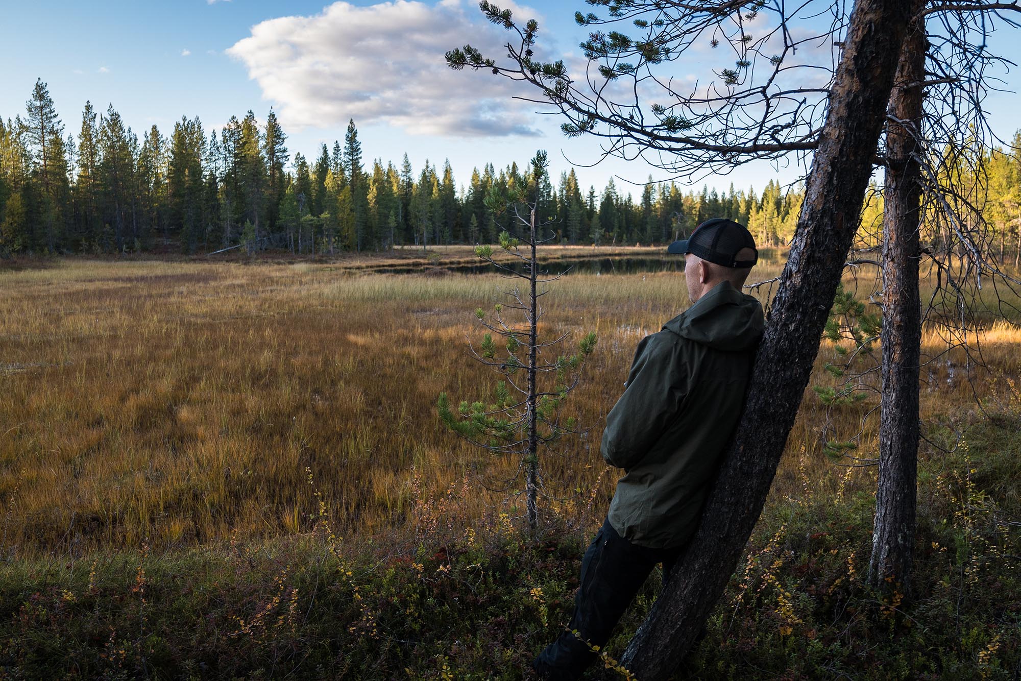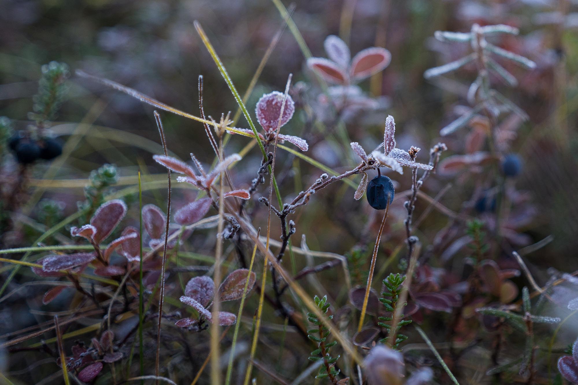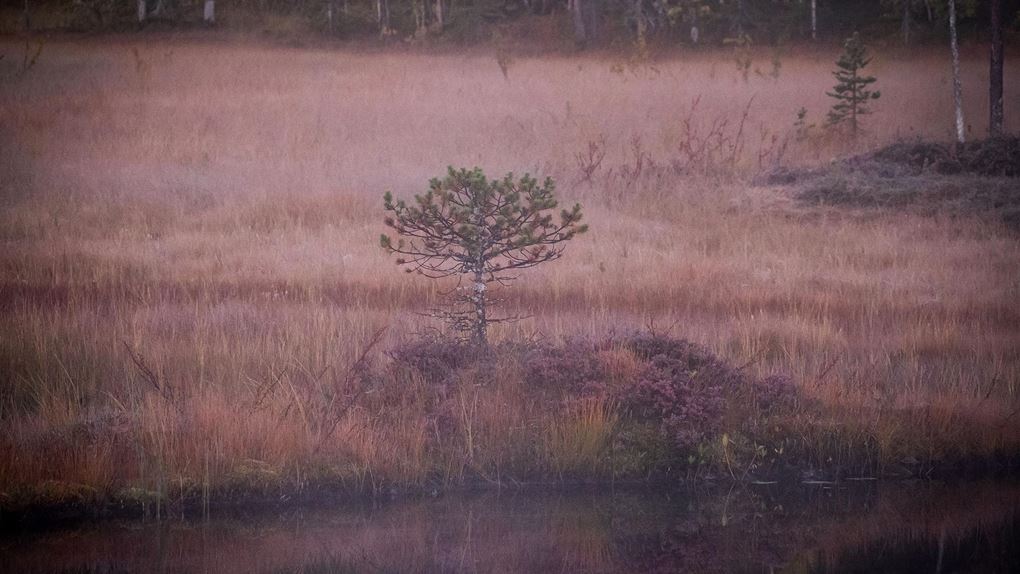 Det knastrar lite lätt när jag går över den gungande halvt frysta myrens mossa. Ljuset är fantastiskt, och jag ägnar nog en två timmar åt att springa runt och försöka fånga den magiska morgonen på bild. Sedan sover jag några timmar till, innan det är dags att packa ihop och traska de sista 3-4 kilometrarna tillbaka till bilen.