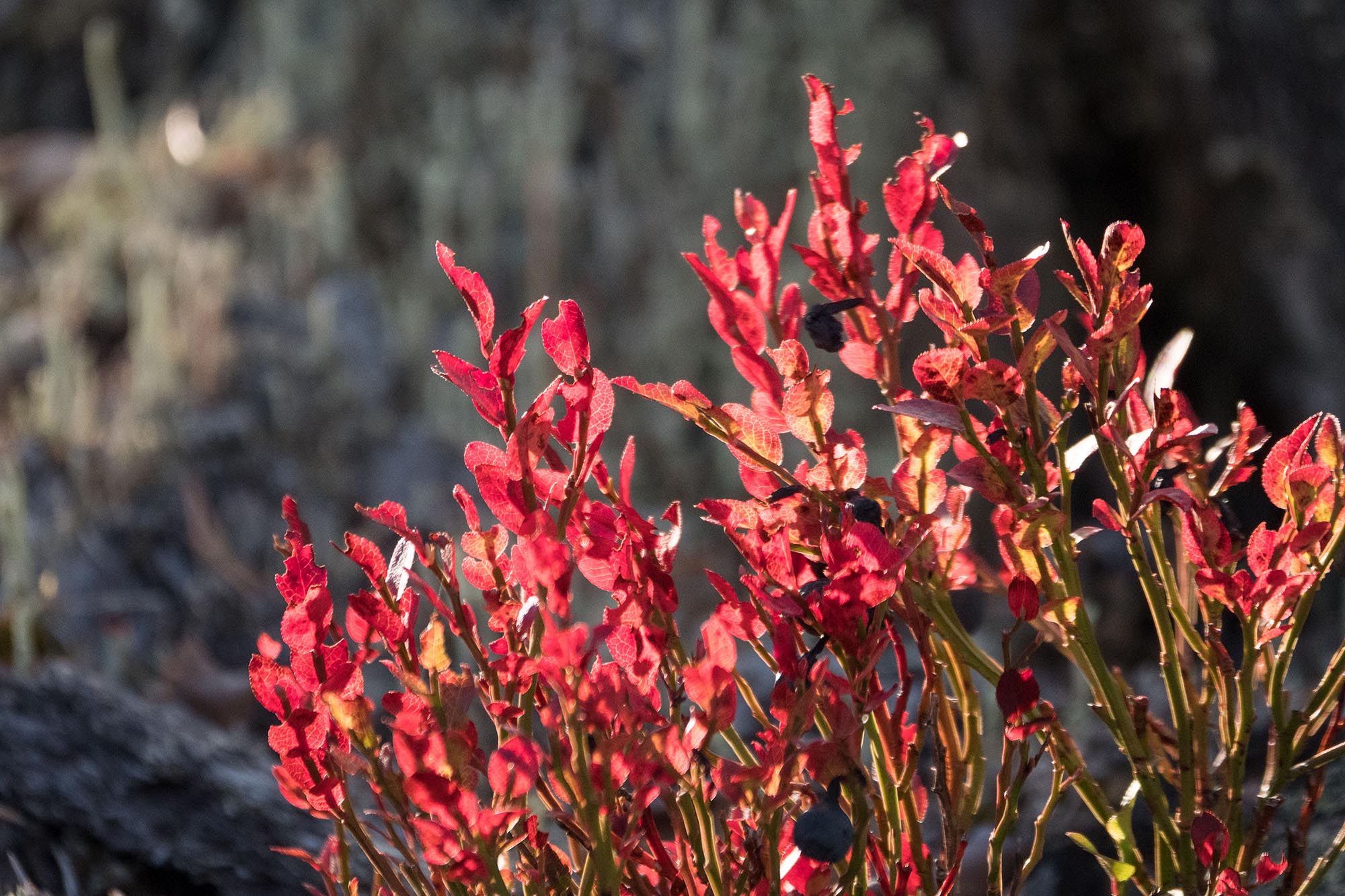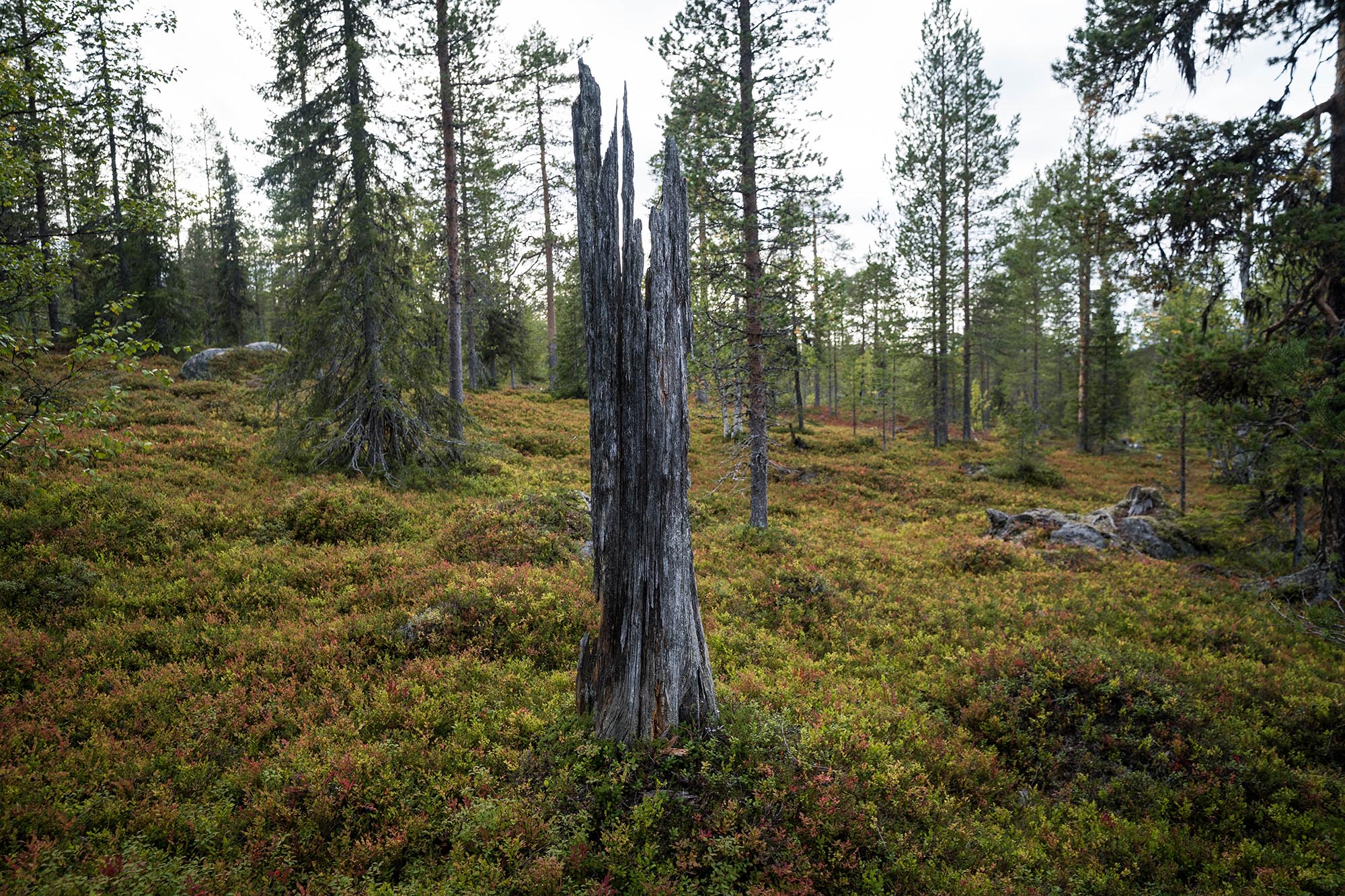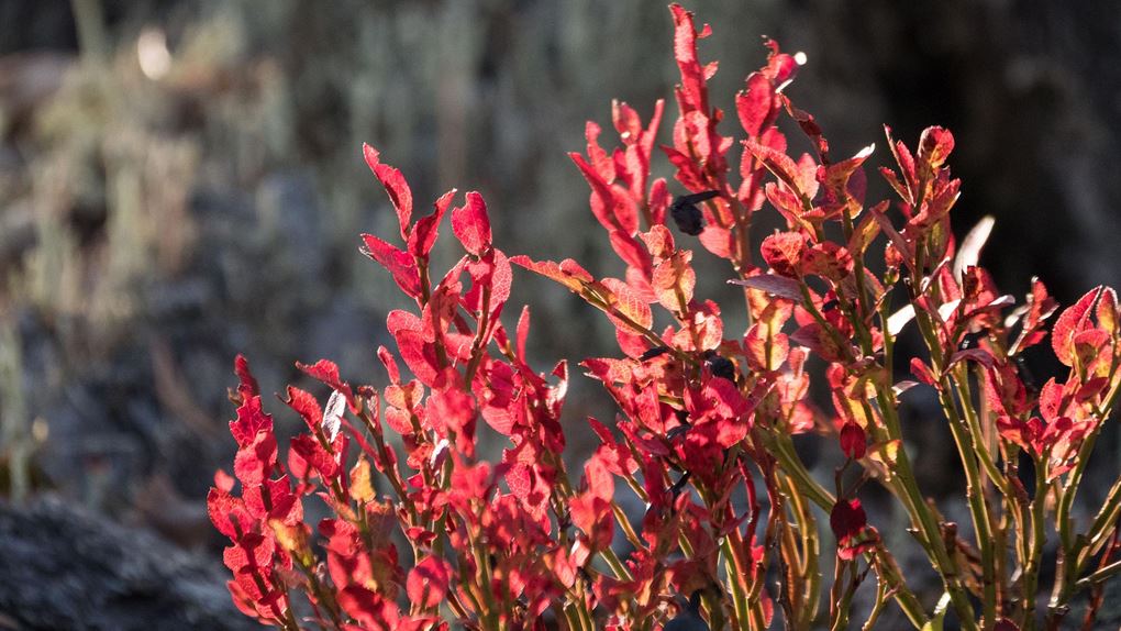 Mitt första vandringsmål är annars toppen på det lilla berget Dábmukoajvve, där det enligt kartan ska ligga en sjö som jag tror lämpar sig för en lunchpaus. Granskogen sluter sig runt mig när jag börjar klättra. Blåbärsriset skiftar i rött, och det ser ut att vara ett bra svampår. För den som behärskar fler sorter än de två kantarellvarianter som jag känner till går det nog att plocka ihop en lunch här.