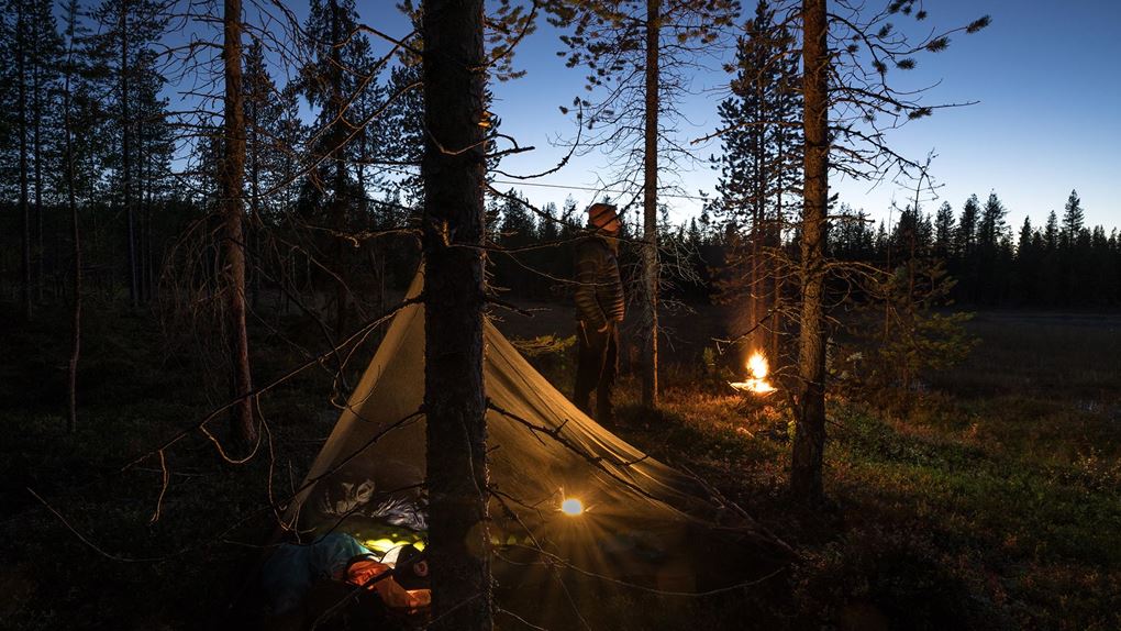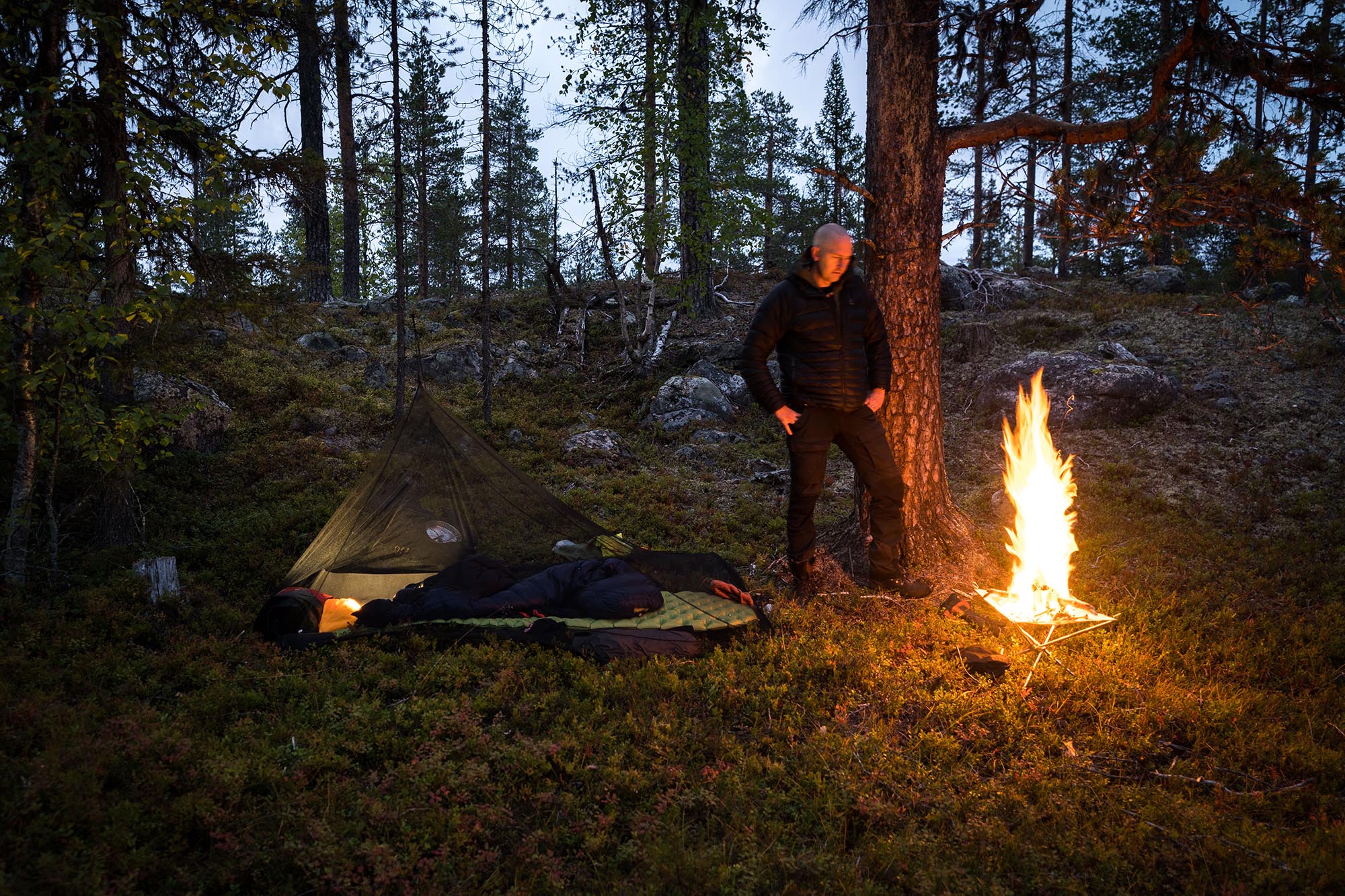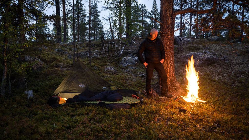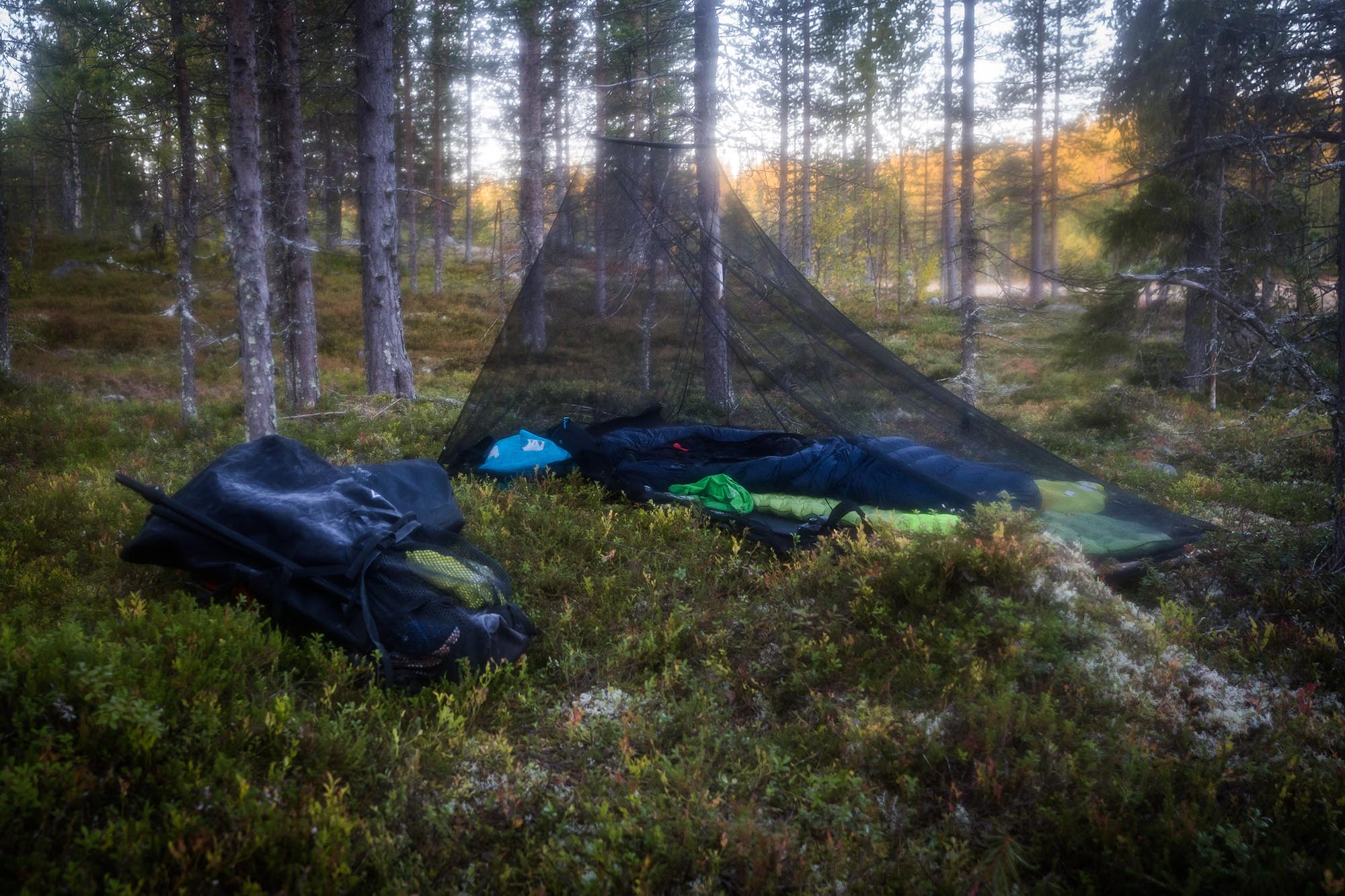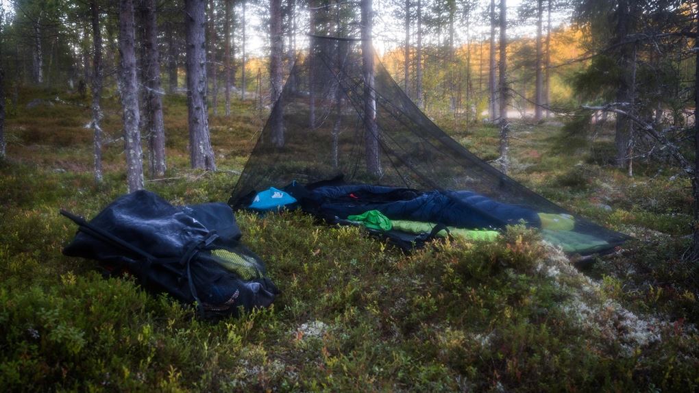 Jag slår läger vid kanten av en liten myr, nedanför en tallbevuxen ås. Vatten hämtar jag från en bäck en bit bort. Tanken är att jag ska sova under en tarp, alltså en liten presenning som man kan spänna upp för att få skydd från väder och vind. Men prognosen har varit så stabil att jag bestämmer mig för att det bli överflödigt. Jag nöjer mig med mitt lilla meshtält - ett myggnätstält som skyddar från just mygg, men i övrigt lämnar fri sikt.