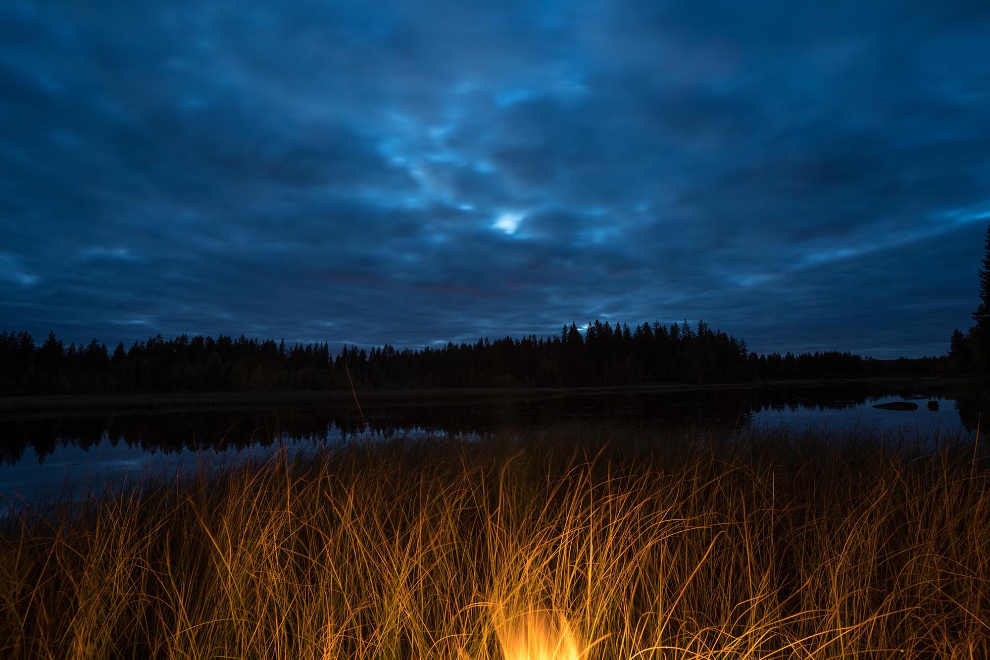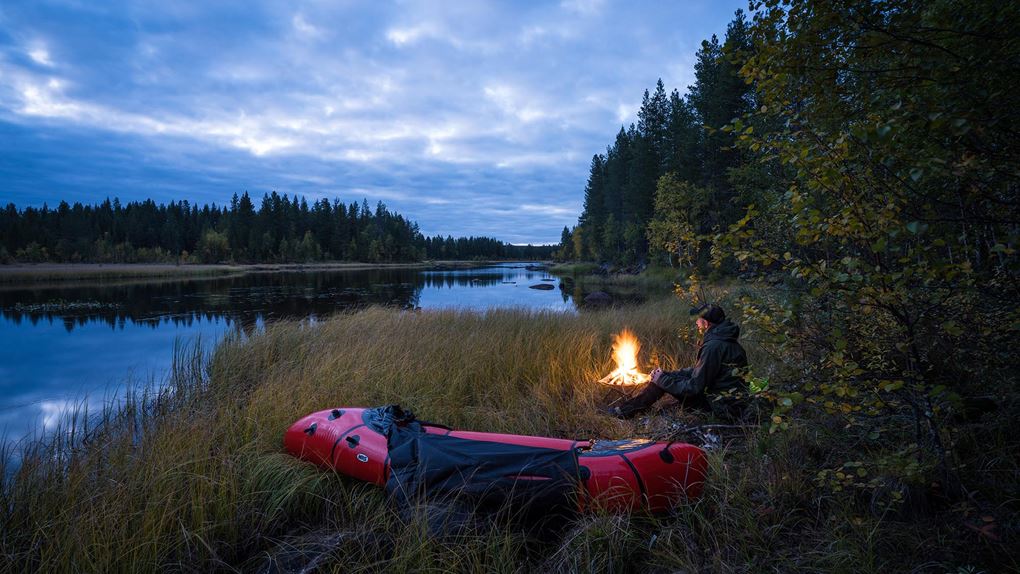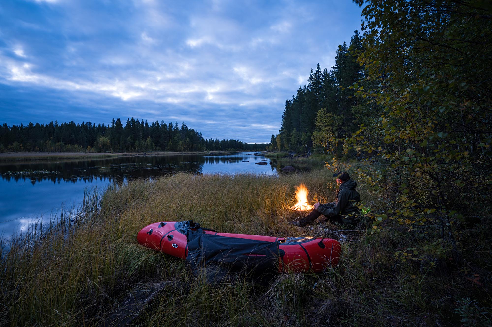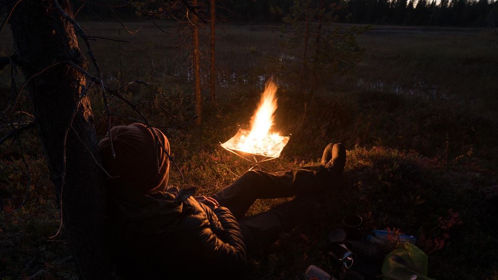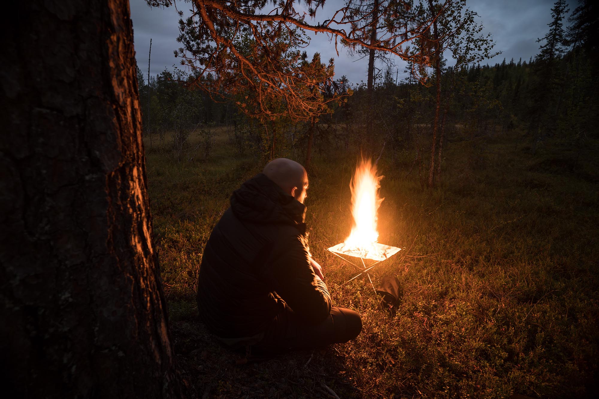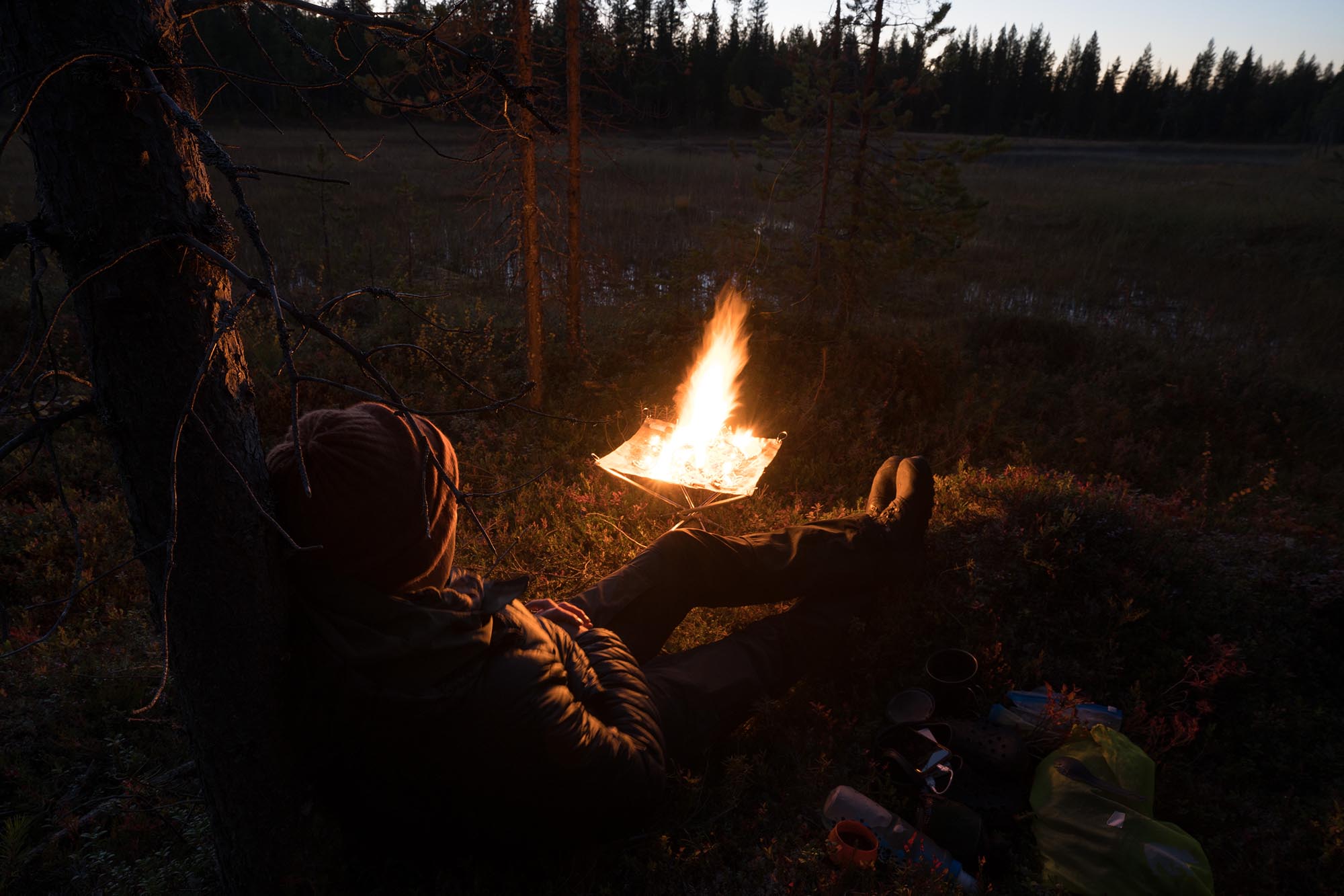 Vid åttatiden gör jag upp en eld, och med ryggen mot en tall sitter jag där och tittar in i elden medan mörkret runt mig blir allt mer kompakt. Kylan och röken skingrar myggen. Det doftar höst. Vid elvatiden nöjer jag mig och kryper ner i sovsäcken. Jag somnar ovaggad och sover gott, och länge.