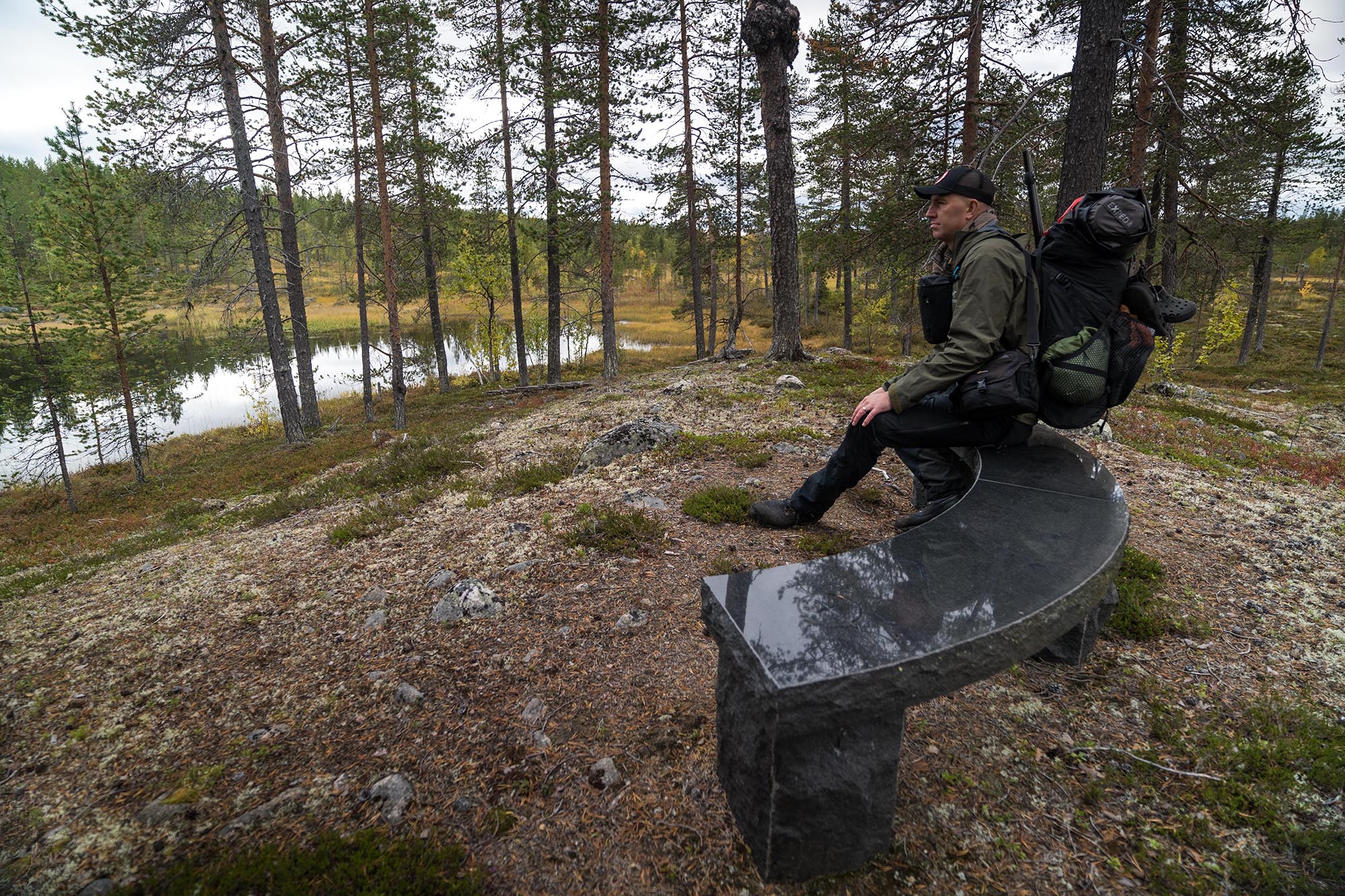 Jag slänger upp en välfylld ryggsäck på ryggen och vandrar österut. En stabil träspång tar mig några hundra meter över den första myren. Sedan är det jag och vildmarken. Inga stigar här inte. Men en stenbänk från ekoparkens invigning springer jag faktiskt på, och tar mig tid att inspektera.