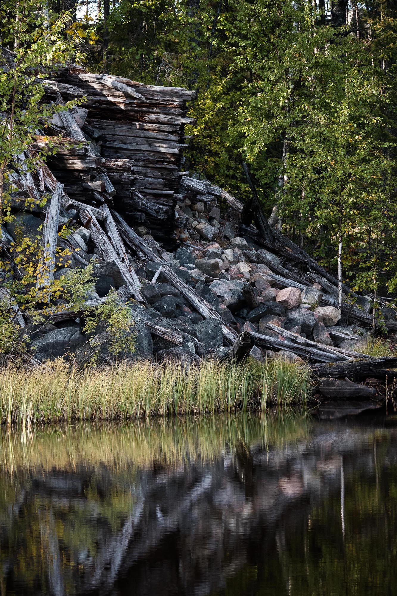 Efter ett par kilometer kommer jag fram till det första dämningsområdet. En plats där en damm en gång byggts för att möjliggöra ihopsamlandet av stora mängder timmer, för vidare flottning mot städer och industrier. Jag har läst på lite, och vet att flottningen faktiskt var det vanligaste sättet att transportera timmer fram till 1950-talet.