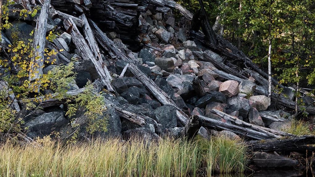 Sedan når jag, efter runt 12 km, ytterligare ett dämningsområde, och resterna av ännu en damm. Den här nedre anläggningen gjorde det möjligt att samla ihop timret innan flottningen på Vuollávrrebäcken skulle ta vid. Även det här området undersöker jag. Här är dammsidorna lägre, men vallarna som utgår ifrån dem desto längre. Här finns resterna av en större husgrund, och skärvor av ett dass som bitvis står upp fortfarande. Historiens vingslag är påtagliga, det är nästan lite spöklikt.