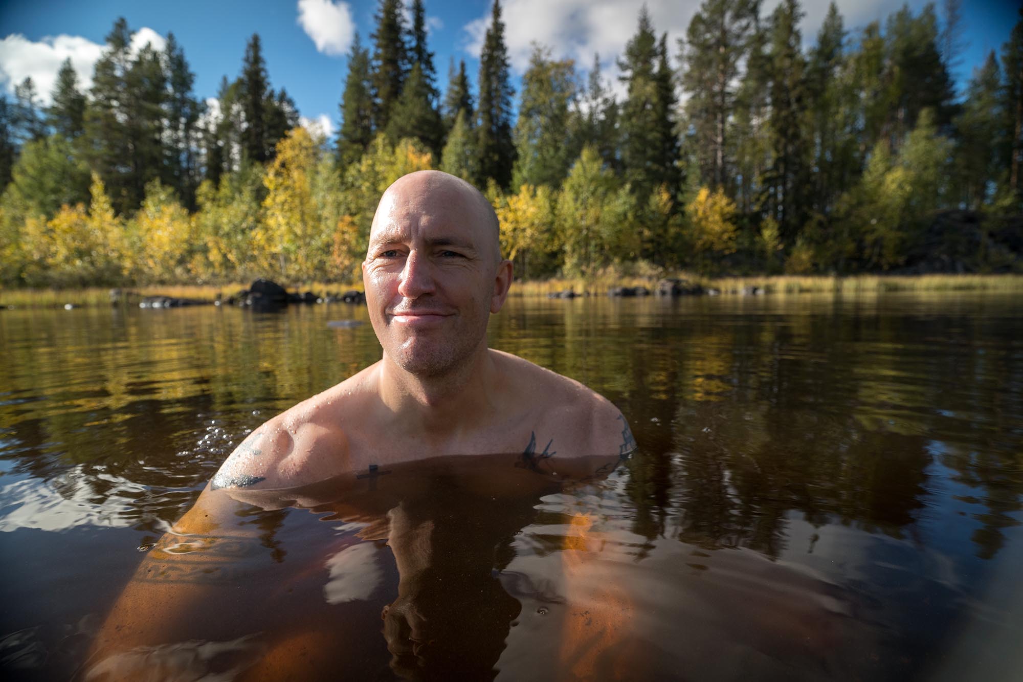 Jag vänder norrut igen efter frukost. Det är en magiskt fin höstdag, med strålande sol. Jag blir varm av paddlingen och min lite väl omfattande klädsel, och halvvägs tillbaka upp längs sjön passar jag på att ta ett lunchbad för att svalka mig lite. Mycket uppfriskande!