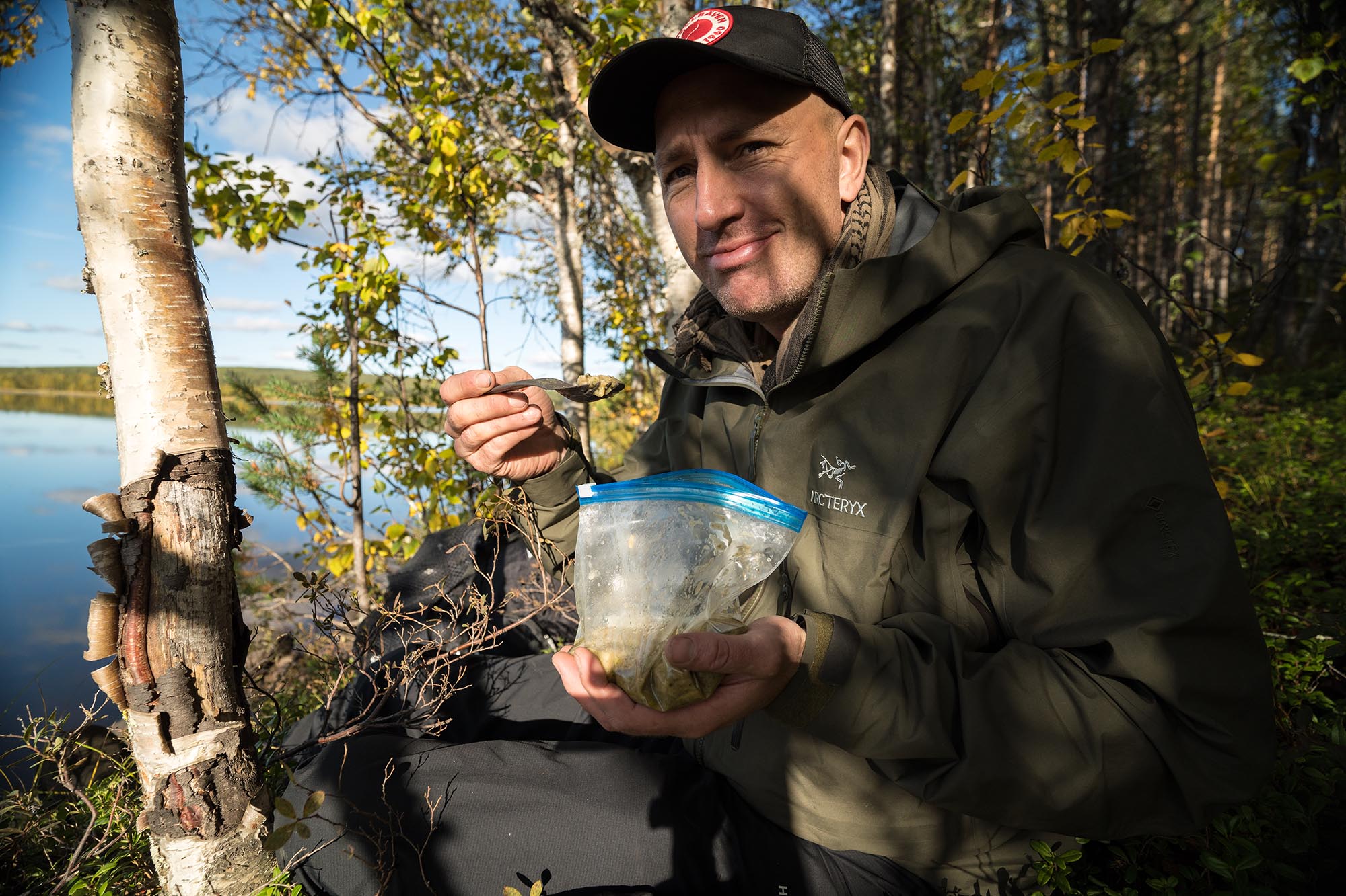 Jag vaknar till fågelsång och ett stämningsfullt bitterblekt höstljus. På andra sidan åsen porlar bäcken gemytligt. Det blir frukost i sovsäcken. Två koppar svart kaffe, ölkorv, torkat kött och lite knäckebröd. Som på ett bättre hotell. Men med förstklassigare utsikt och friskare luft.