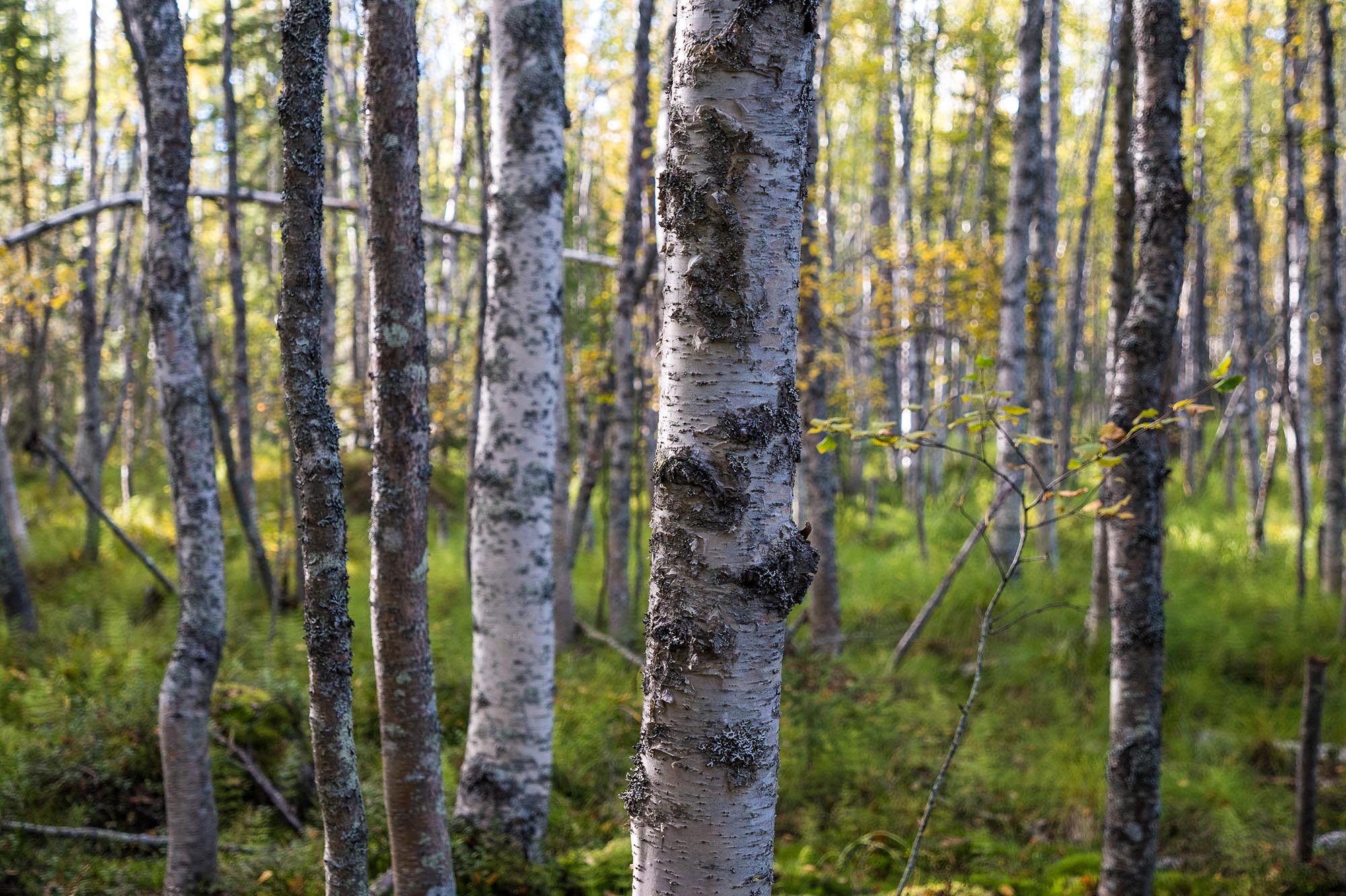 Efter lunchen tar jag ut en ny kurs och vandrar mot nordväst. Skogen glesnar lite innan det bär nedför igen, och mellan träden ser jag en milsvid utsikt. Skog och åter skog. Och några silverstrimmor här och där, bland annat sjösystemet Vuollávrre, där min plan är att paddla under morgondagen.
