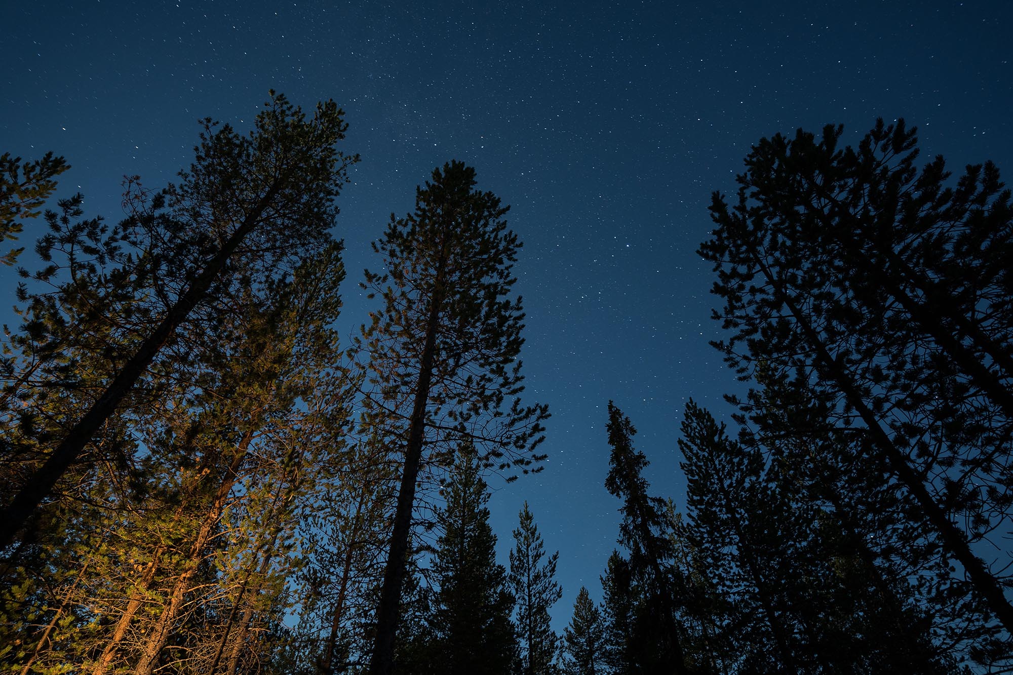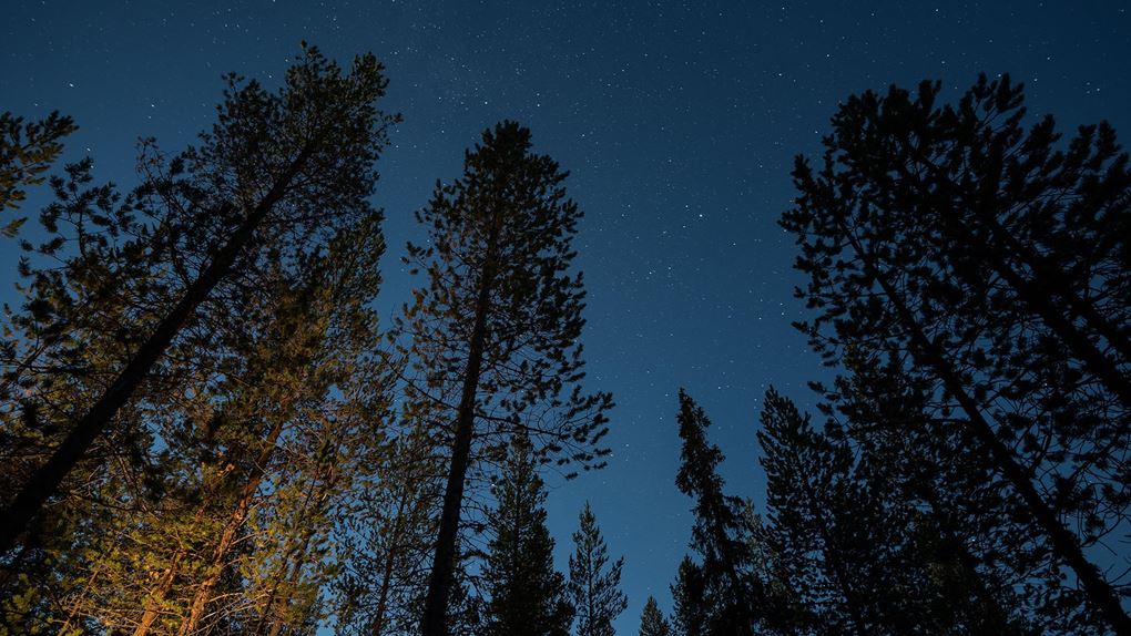 Det är en klar kväll. Kallare än de tidigare. När mörkret smyger sig på närmar sig temperaturen nollstrecket. Stjärnorna tittar fram, och månen - full, eller i det närmaste full - stiger sakta bakom trädtopparna. Ett tag tror jag nästan att det är någon som kommer med en stor strålkastare mellan träden, så starkt lyser den.