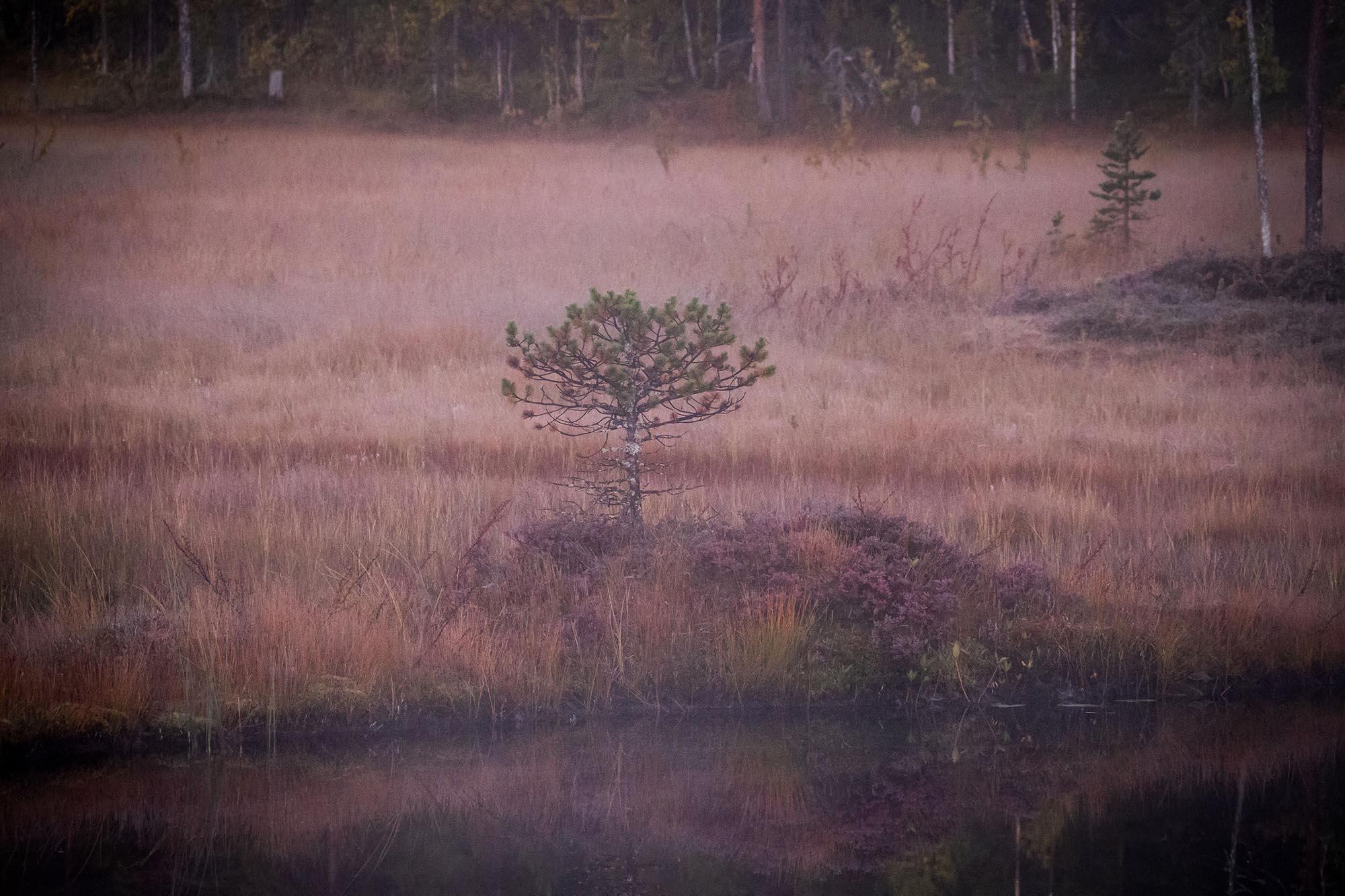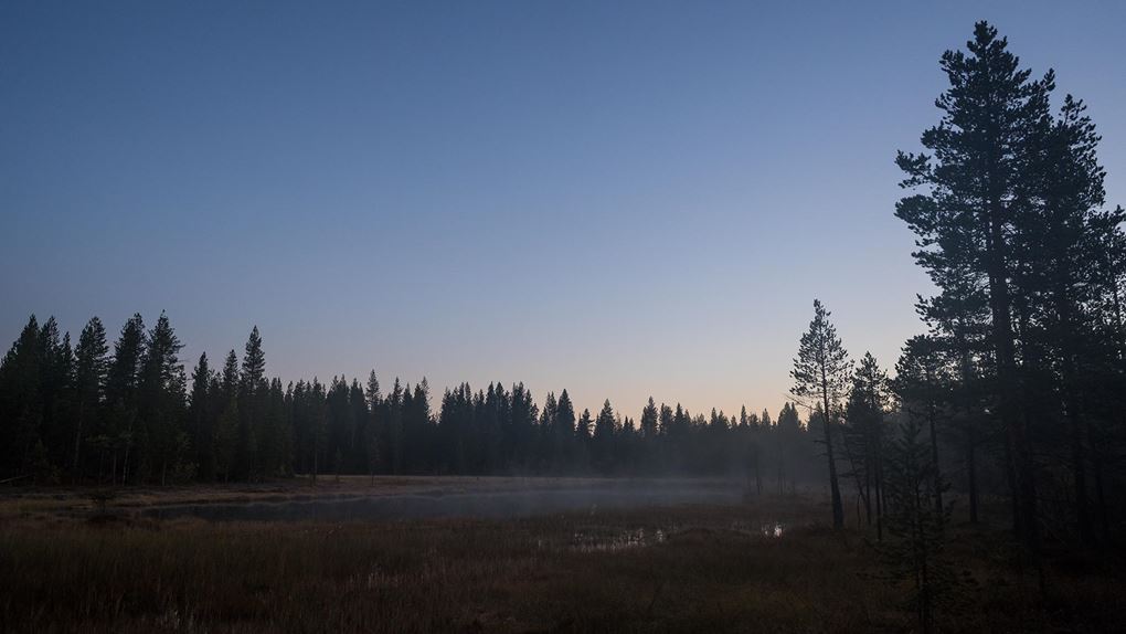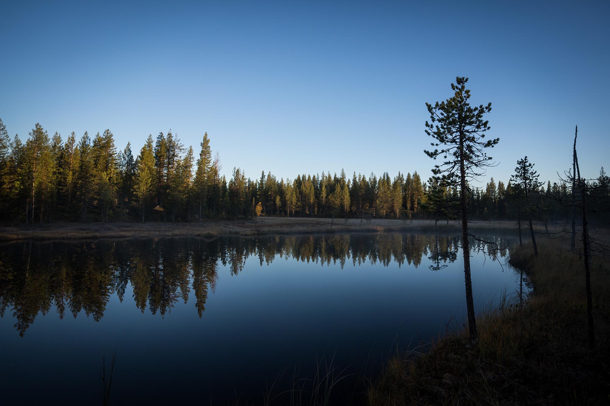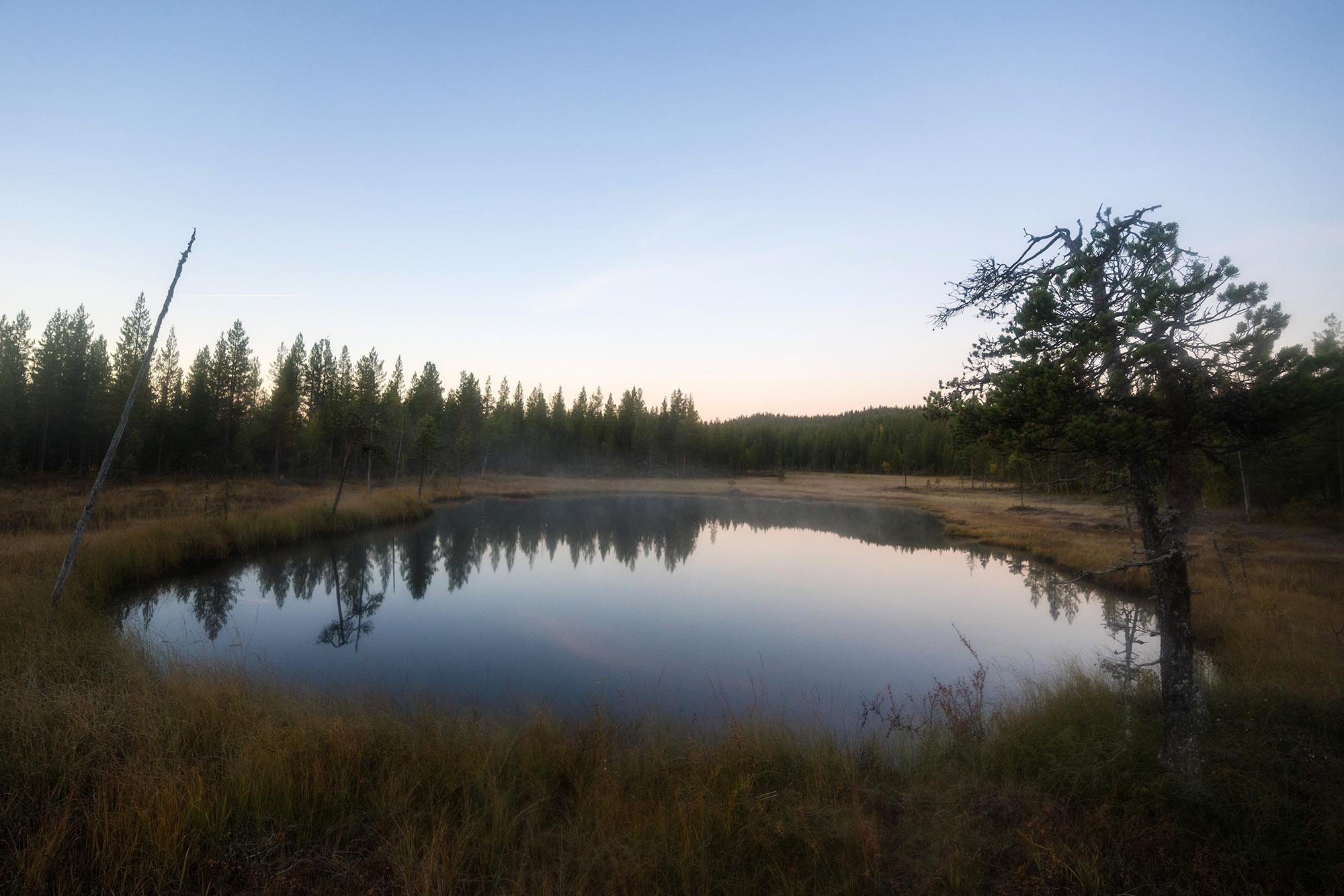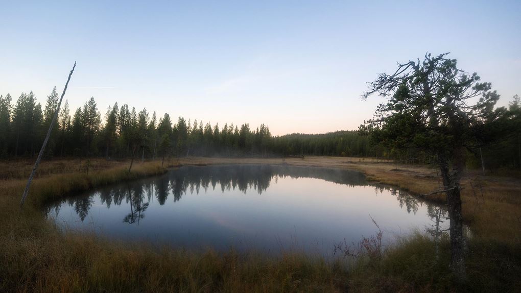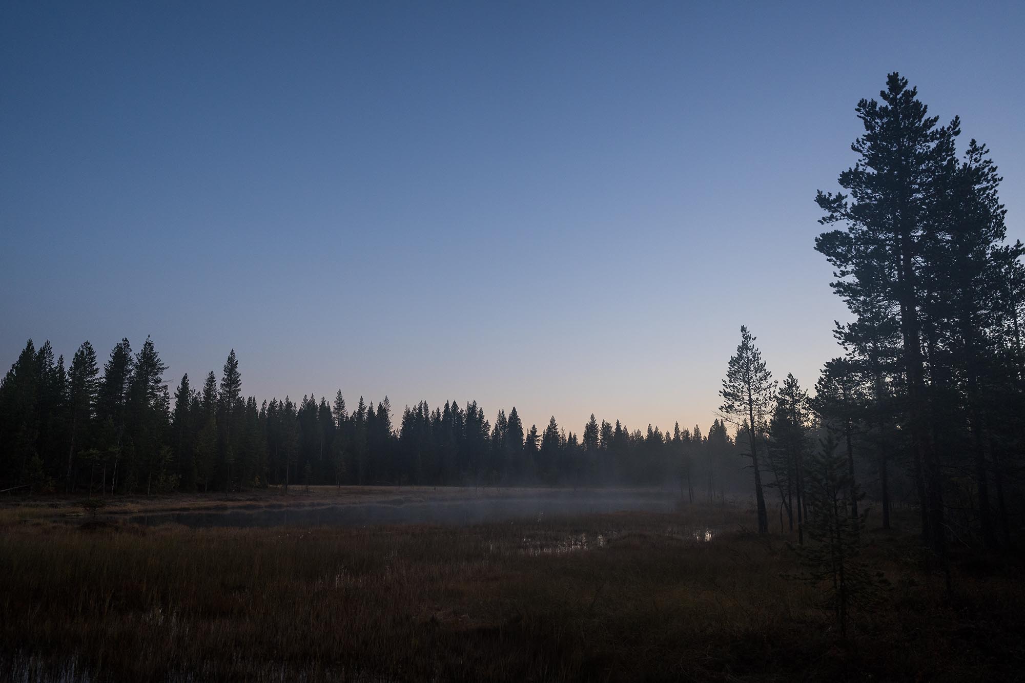 På turens sista dag ringer klockan vid femsnåret. Jag vill passa på att fota lite timmen före soluppgången, under blåtimmen när ljuset ofta anses vara som vackrast. Det krävs en liten mental kamp, men dimslöjorna över den lilla sjön fäller avgörandet och jag kämpar mig upp.