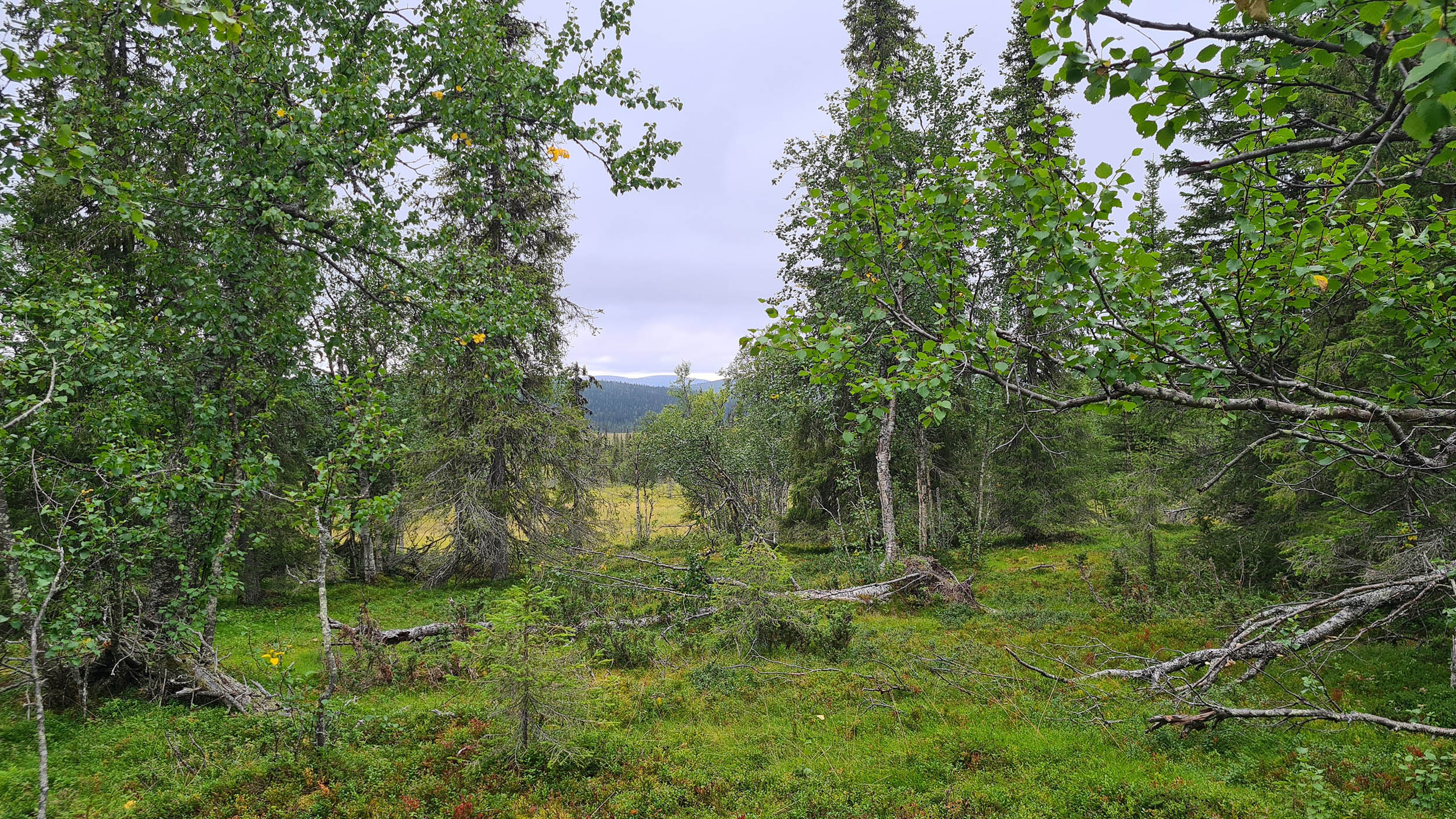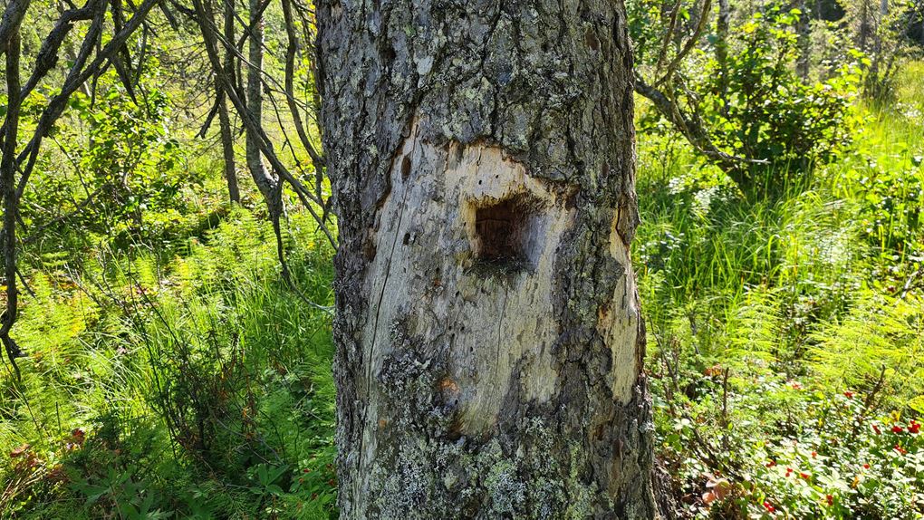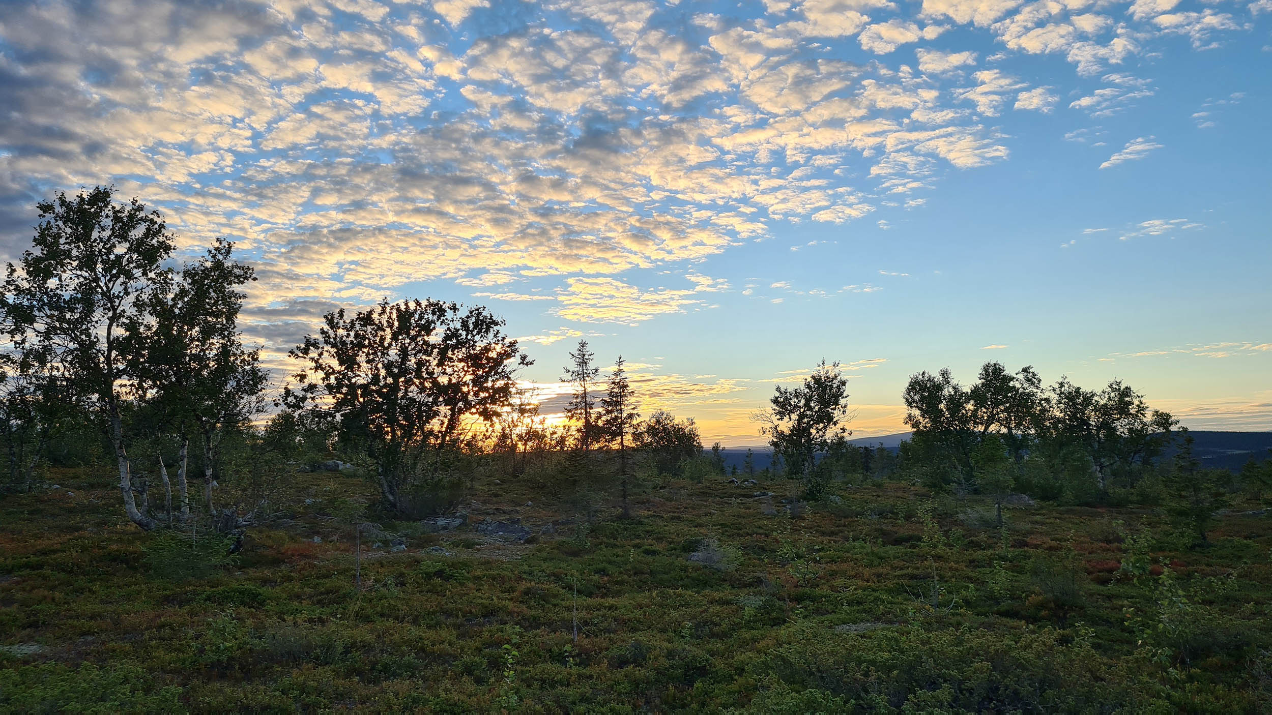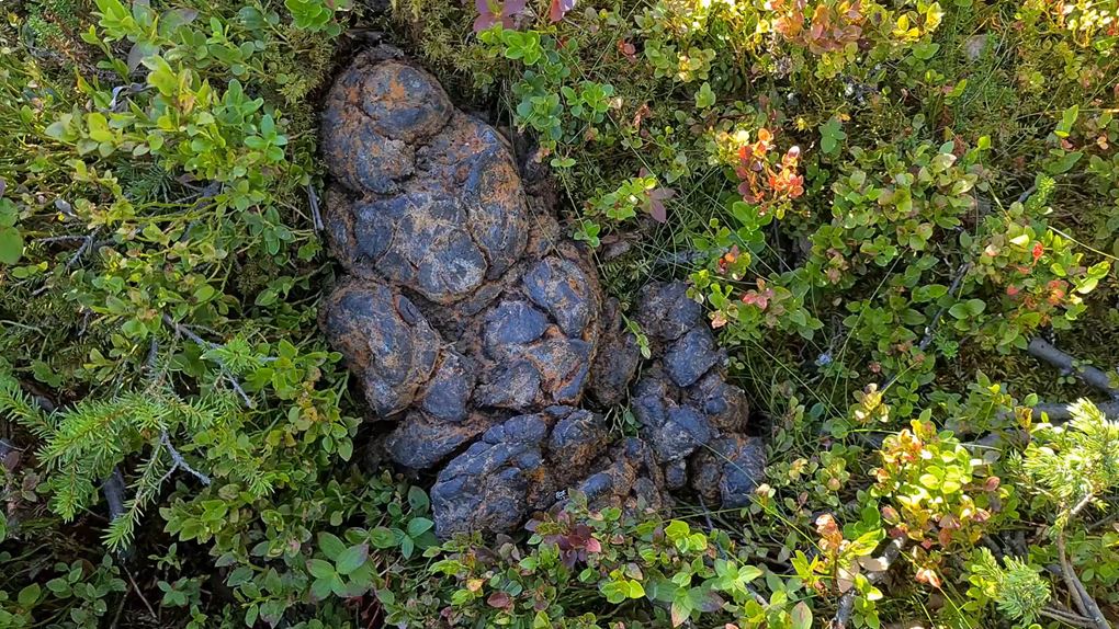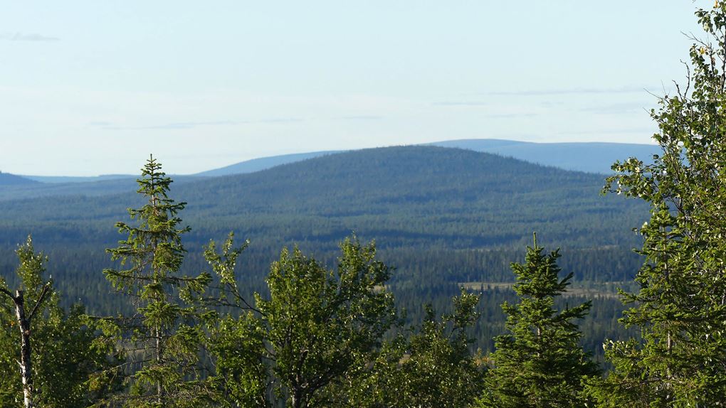 Så fortskrider dagen med att navigera sig genom skogen och de våta partierna. Jag planerar att sätta camp på toppen av Tossisvaara då jag tänker mig att skogen är glesare där. Börjar vandringen uppför och det är alltid lika förvånande hur mycket jobbigare det är att vandra upp för en brant. Väl uppe är det mycket riktigt betydligt glesare mellan träden och mera fjällikt. Björken är dominant och man bjuds på vackra vyer. Däremot tycker jag att det är om möjligt ännu mer björnspillning här.