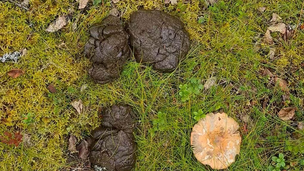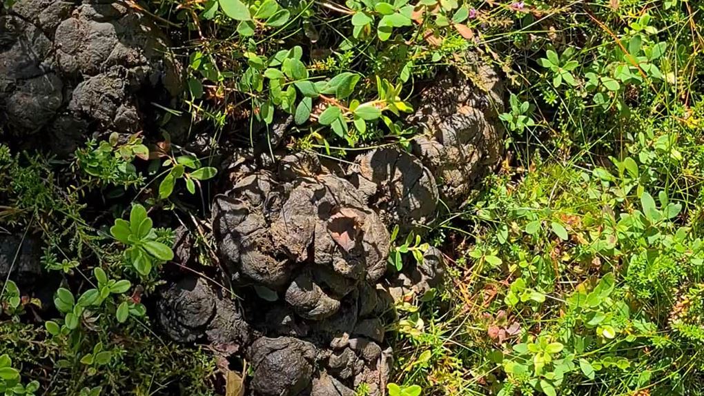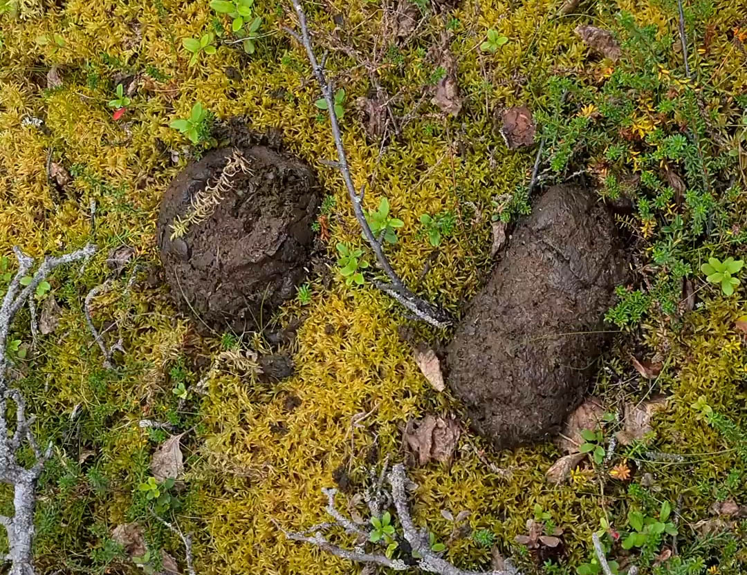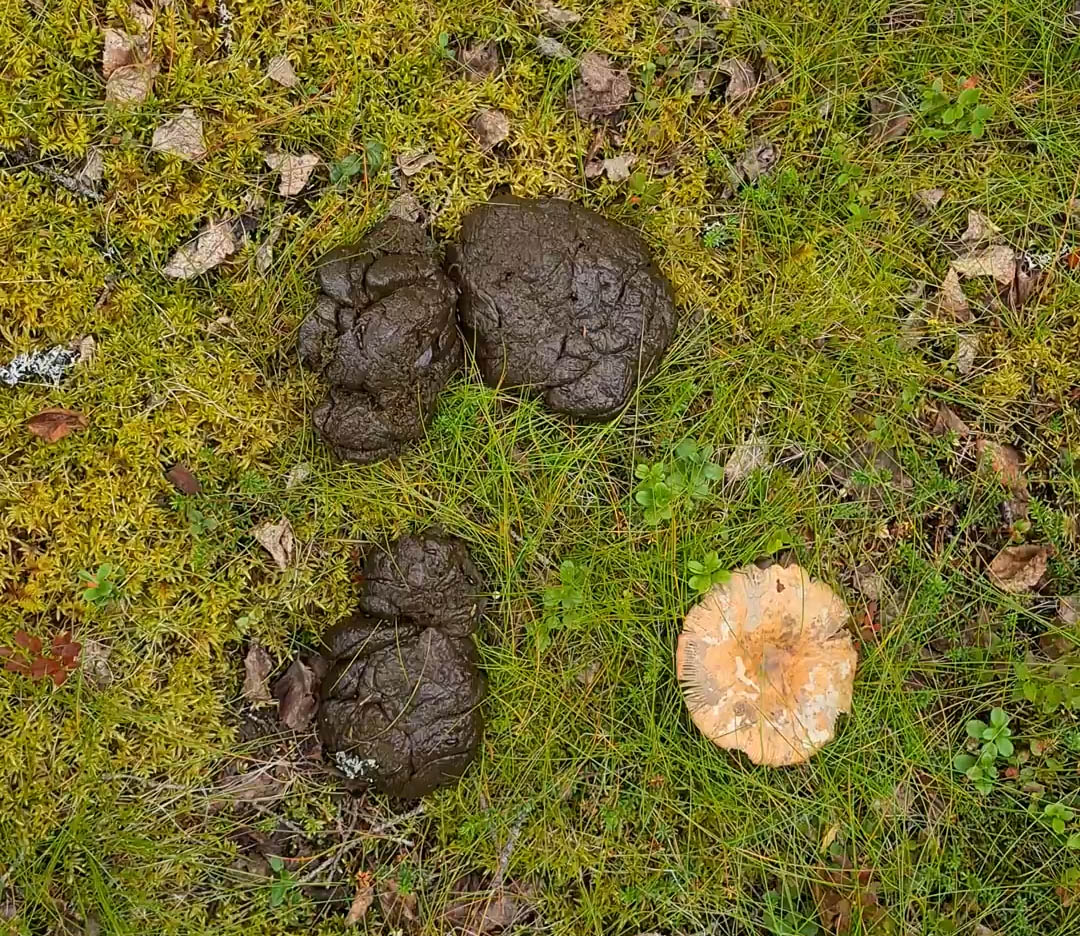 För spår ser jag. Björnspillning stöter jag på i stort sett hela tiden och överallt. En utriven myrstack och uppklösta träd är andra tecken som vittnar om björnens närvaro. Men allt mitt tjatter verkar fungera för ingen björn syns till under turen.