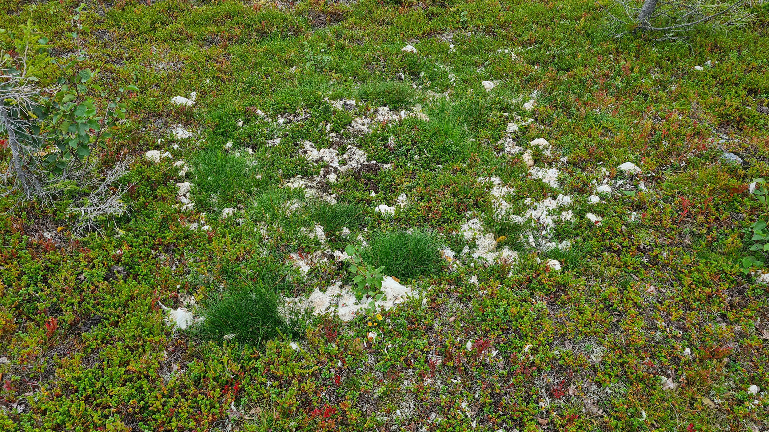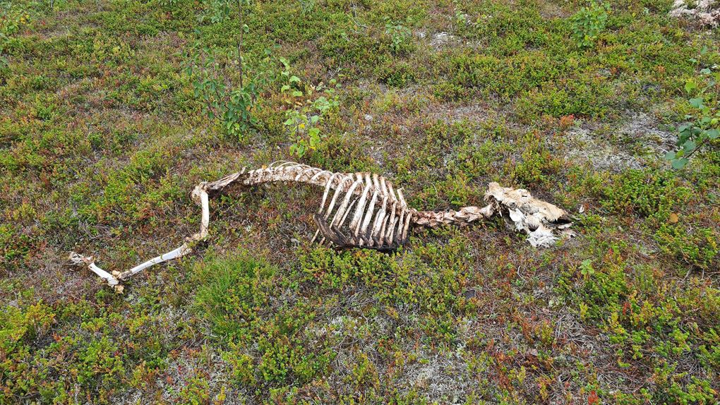 Hittar en stor platt yta där jag slår upp tältet. Passar på att undersöka närområdet när jag ser något misstänksamt. Närmar mig lite försiktigt tills jag ser att det är en död ren. Några meter från renen ligger tussar från pälsen. Jag är varken viltvårdare eller kriminalare men min slutsats är att det är en björn som har slagit renen. Det finns både brottsplats, fyndplats samt motiv.
