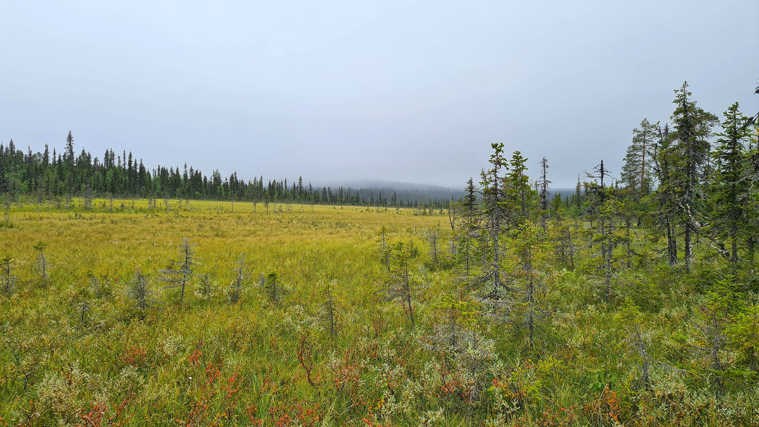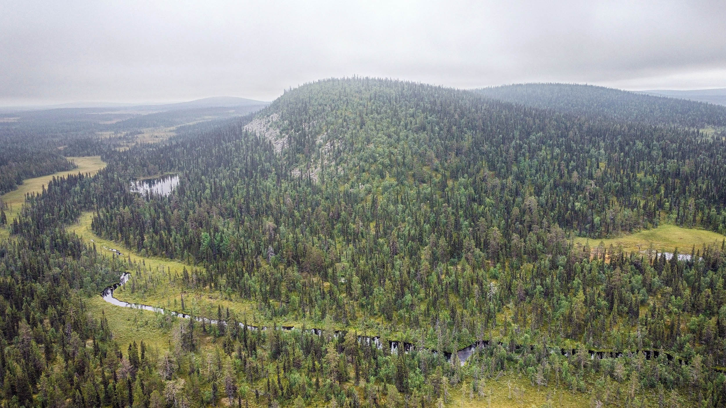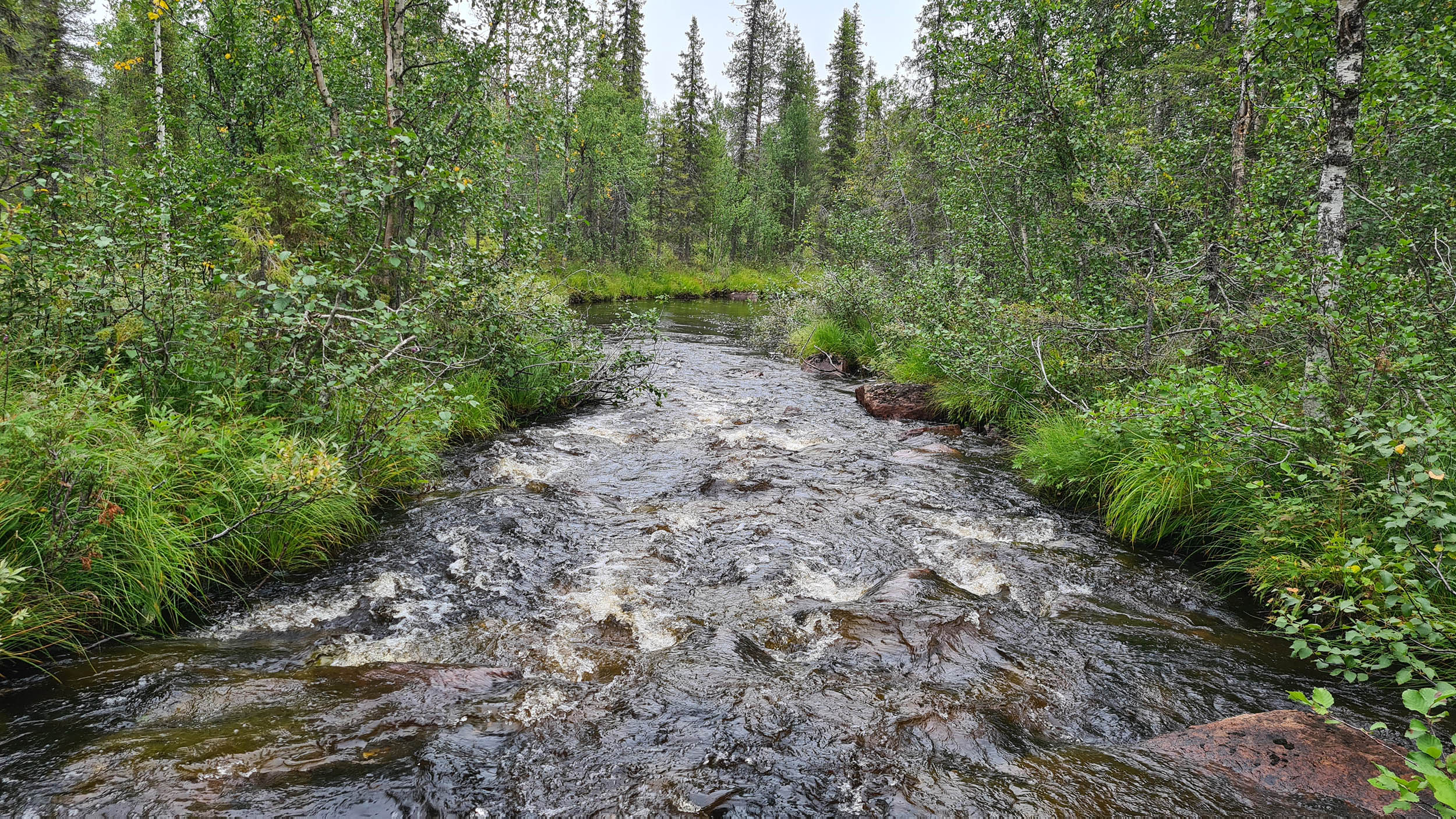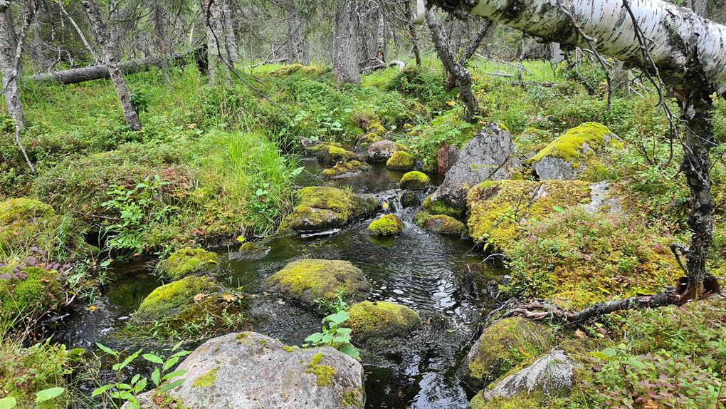 Väl över på berget Karhuvaara är terrängen aningen enklare och energinivån har nått nya höjder. Jag plöjer på i en så rak linje jag förmår. Dagen fortsätter ungefär så här ett bra tag. Vacker naturskog, som gjord att skogsbada i, blandat med blötare partier. Blåbär och hjortron finns det gott om. Lite fågelkvitter och några uppskrämda ripor flyger upp rakt framför en. Men framför allt är det tyst och lugnt. Timmarna flyter på och plötsligt står jag framför ytterligare en bäck väldigt snarlik den jag korsade igår. Vadet över bäcken sker lugnt och odramatiskt.