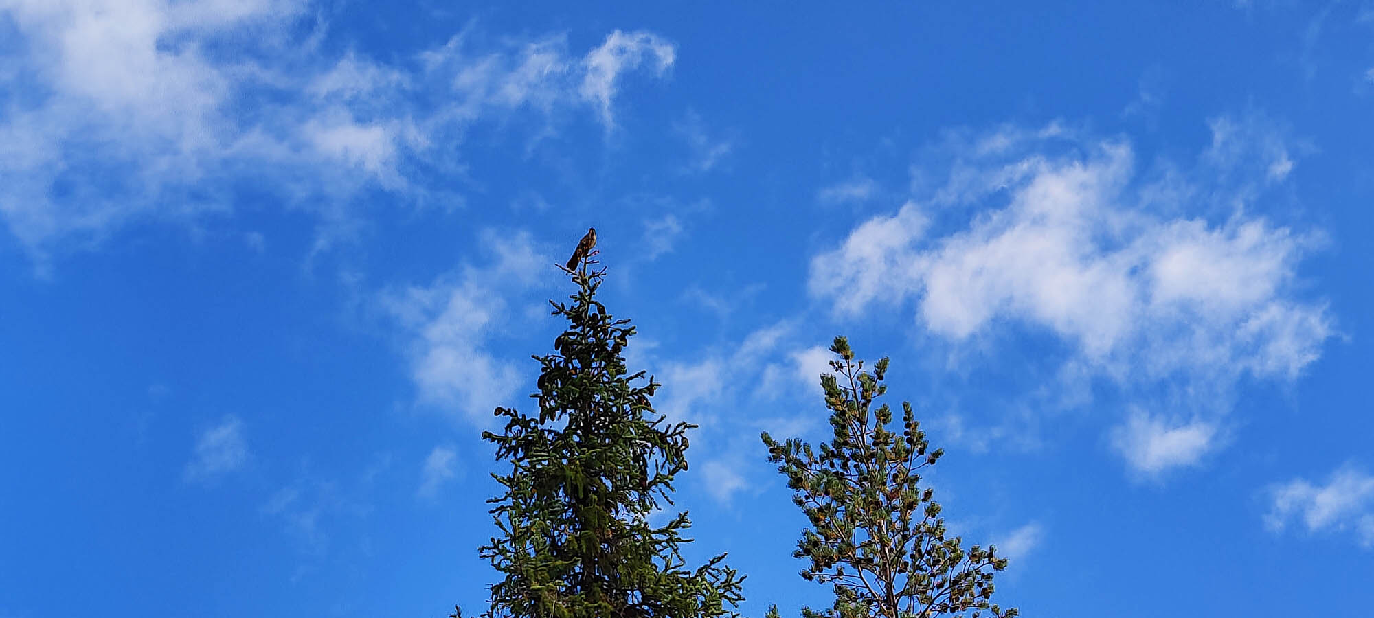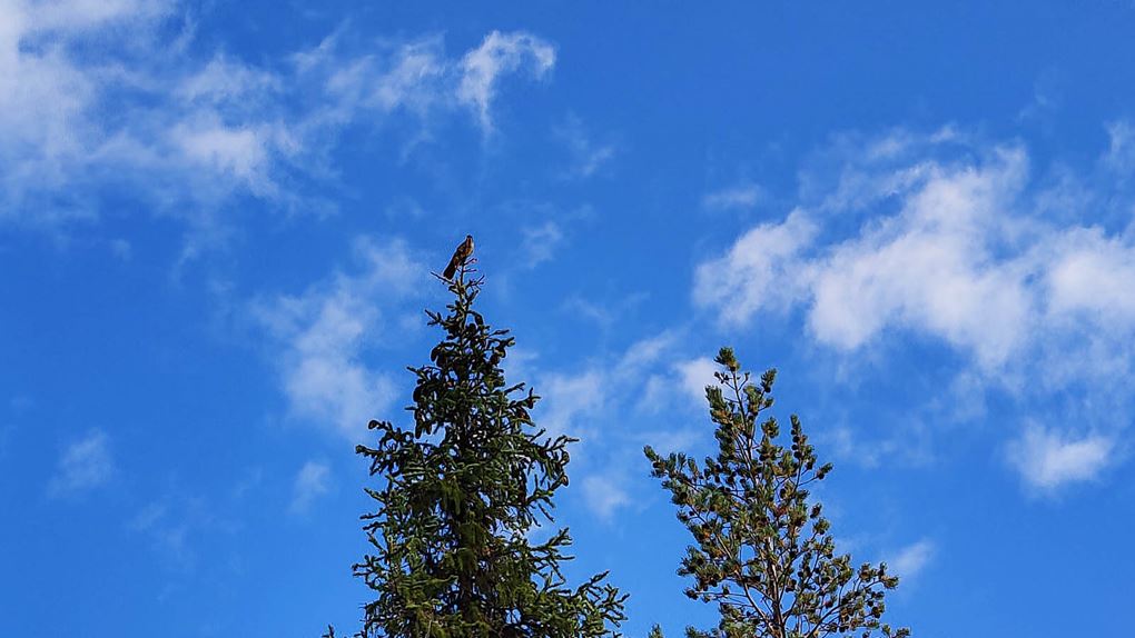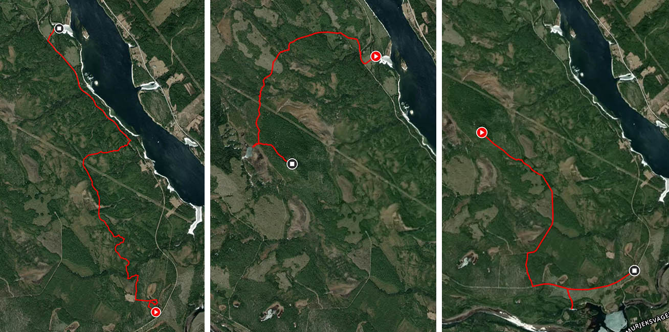 När vi stannar till ser vi två grodor som hoppar fram i riset. Något djur ska jag väl lyckas få på bild tänker jag, och skyndar fram med mobilen igen. Grodorna hoppar fram i sakta mak men täcks hela tiden av ris, någon bild blir det inte här heller. Solen värmer fortfarande och även här får vi sällskap av en nyfiken lavskrika som kommer närmre och närmre. Till slut sitter den bara någon meter ifrån oss innan den åter lämnar för ett säkrare avstånd. Äntligen lyckas vi fånga den på bild. När vi har ätit upp lunchen och packat ihop våra saker ser vi en glugg i skogen på andra sidan kraftledningsstråket. Vi kollar lite på karta och satellitbild och inser att gluggen är nog ett spår som går till Kainotjärn och vidare. Perfekt, det är ju det hållet vi är på väg mot!