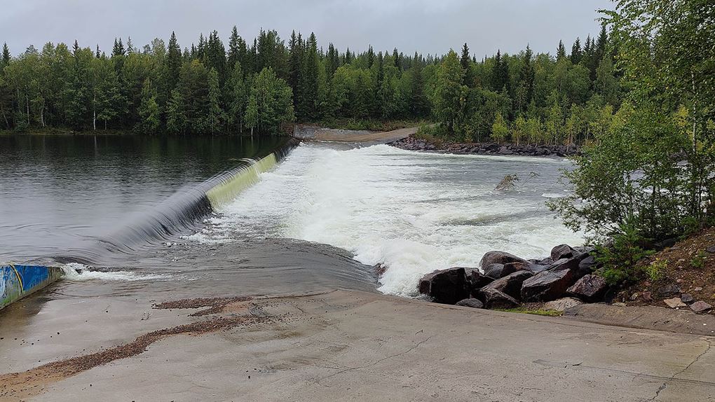 Då vi kommer längs riksväg 97 söderifrån är den naturliga vägen in till Ekopark Vuollerim genom byn och över spegeldammen. Men där var bommen för vägen och det tog stopp. I början av veckan har SMHI visat orange varning för höga vattennivåer i området. Nu är det nere på gul varning. Många vattenkraftverk i området står med öppna dammluckor vilket gör att vattnet forsar på ställen där det annars kan vara lugnt eller torrlagt. Spegeldammen är ett av de ställena.