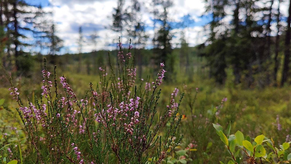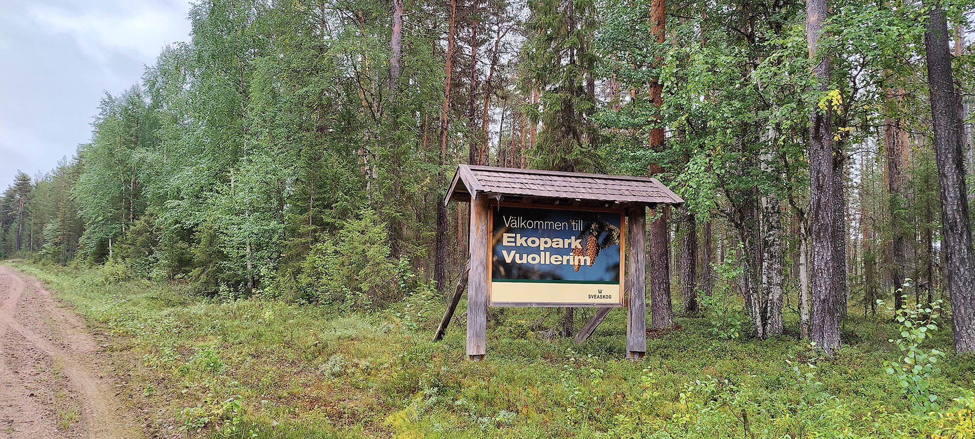 På ekoparkskartan benämns det här området som Fejferheden och är man här i rätt säsong ska man kunna hitta diverse olika ätbara svampar. Svårt för mig att veta, jag har gett mig själv diagnosen svampblind och får nöja mig med svamp från affären. Fejferheden består av sandtallskog så här är det lätt och fort att gå. På håll ser vi en stor flock småfåglar som flyger mellan träden framför oss. Vi kommer ut på bilvägen som går i ytterkant av ekoparken, samma väg vi kom med bilen igår. Äventyret börjar närma sig sitt slut men på väg till bilen ska vi svänga förbi Vuollerimselet och kika på ekoparksbänken.