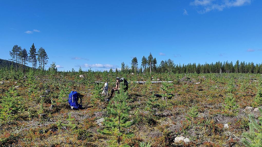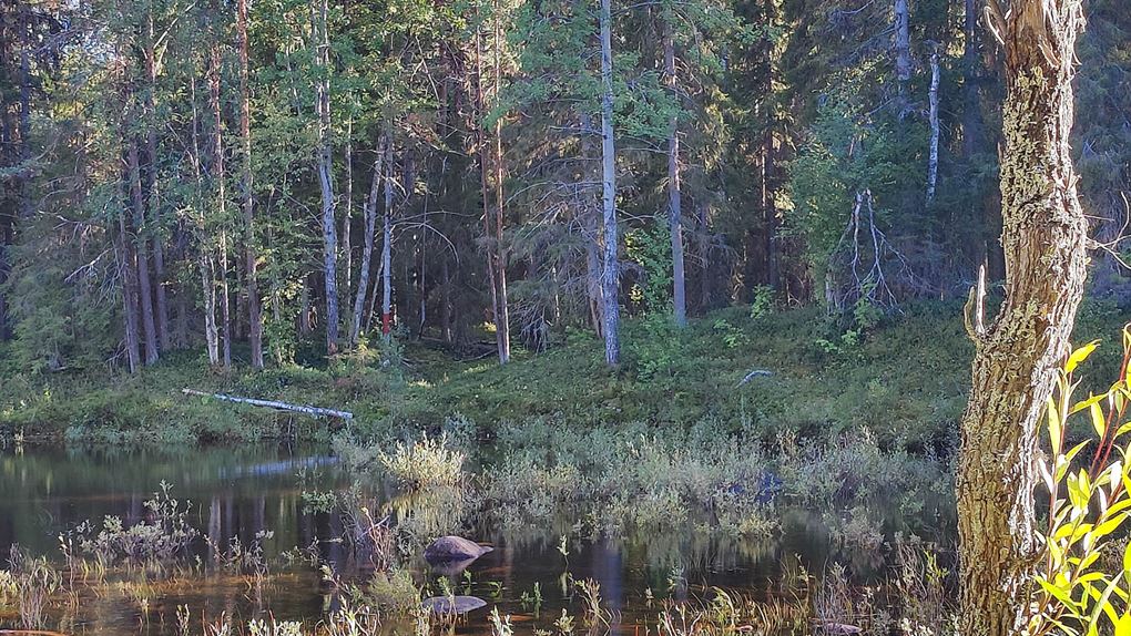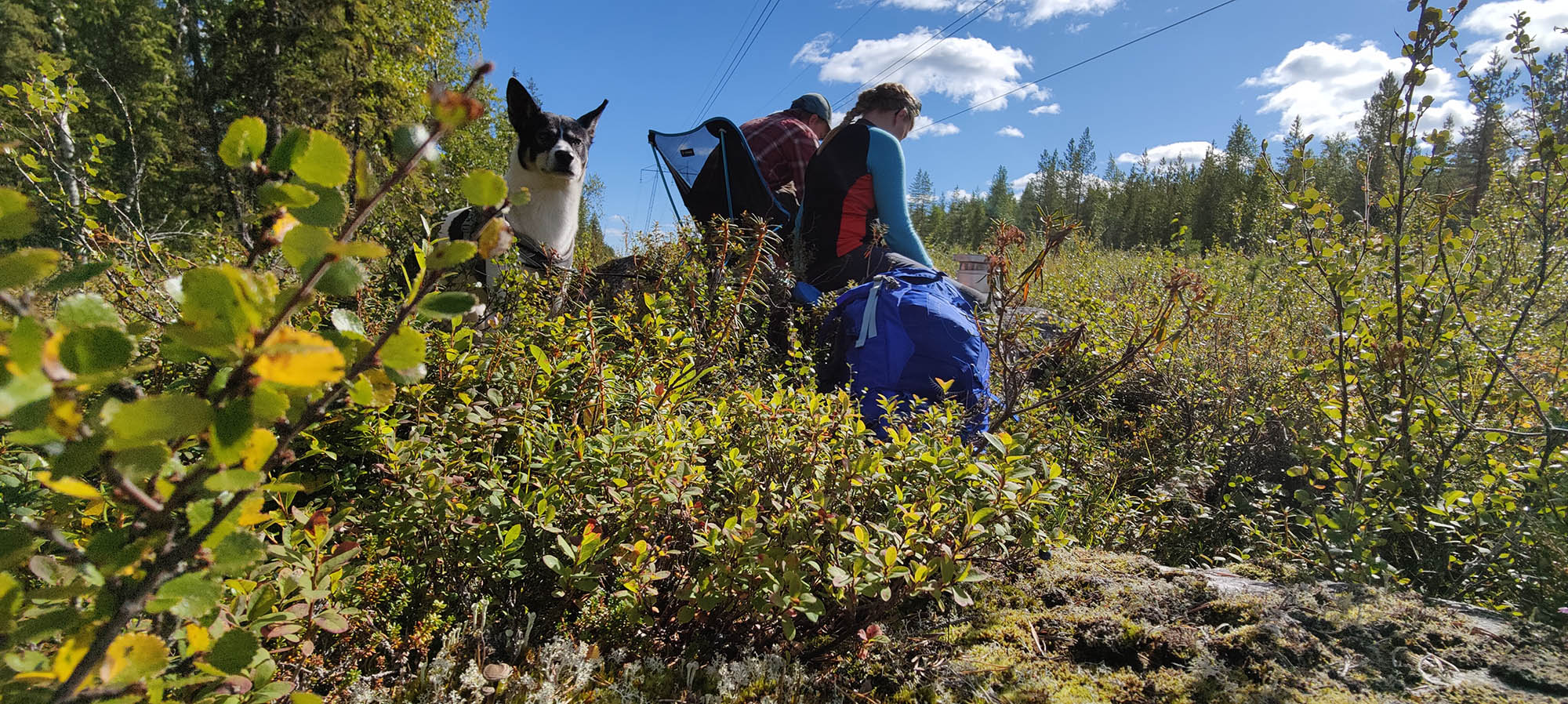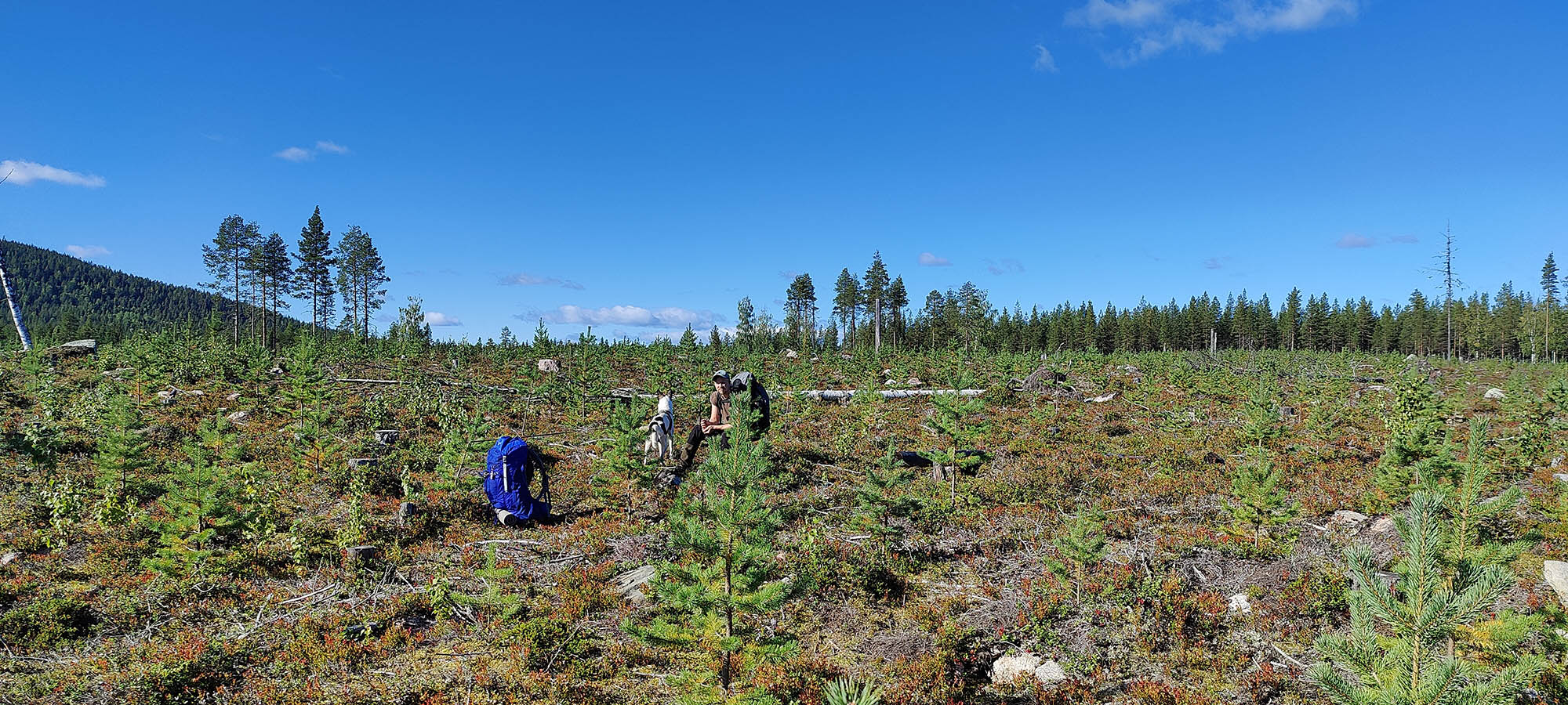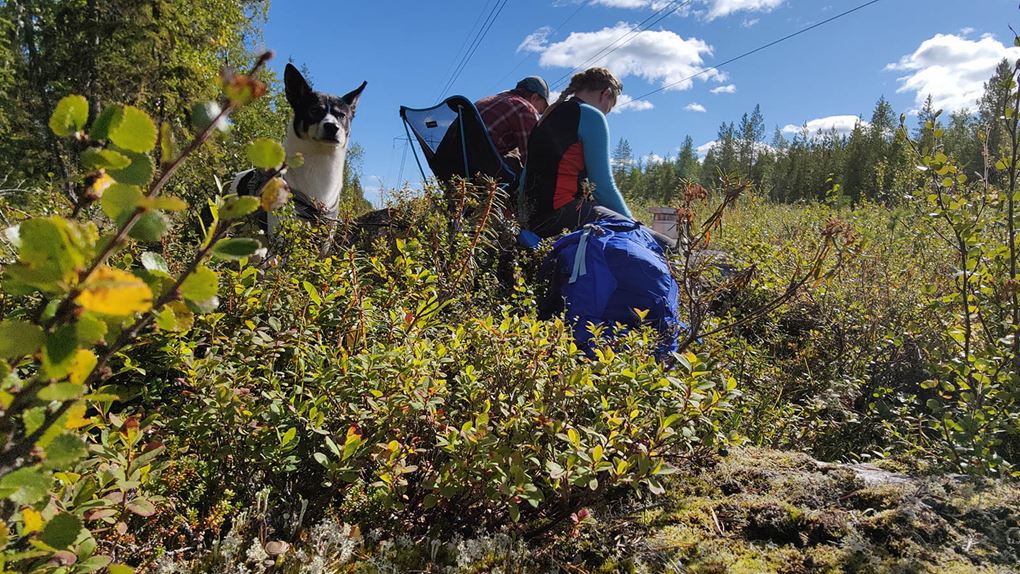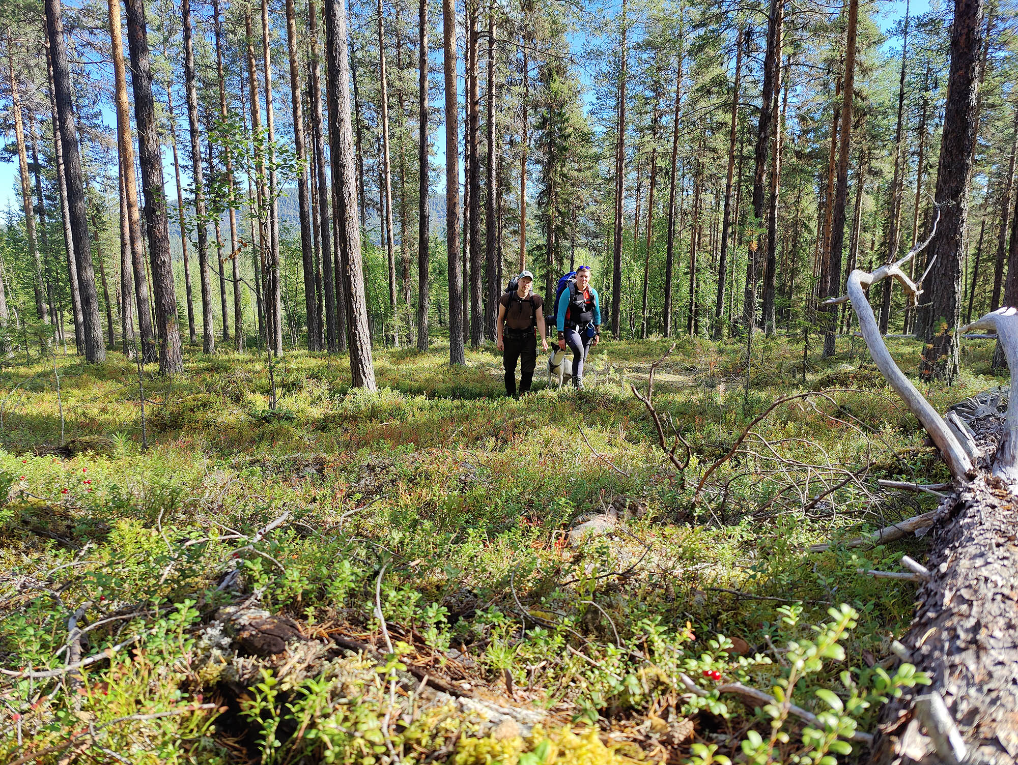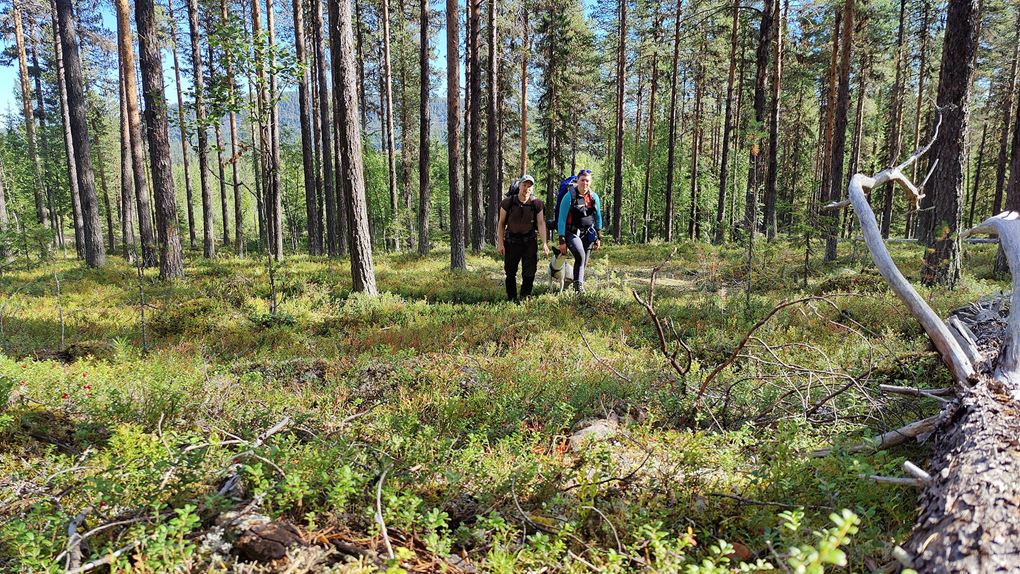 Det börjar bra, gles tallskog och lång sikt. Skogen kryllar av lingon som hänger i stora klasar i riset. Varje gång vi stannar till för att kolla hur vi ska gå eller dricker lite vatten passar Niják på att äta både lingon och blåbär. Snart är vi framme vid ett blötare område igen. Grästuvorna är nästan midjehöga på sina ställen och vi får vara noga med var vi sätter fötterna för att inte snubbla. Vi korsar första bäcken för dagen och kan konstatera att alla bäckar vi korsat i skogen har varit ganska små, bara ett långt kliv så är man över. Efter den första bäcken kommer vi fram till ett hygge, solen ligger på och det blir riktigt varmt och skönt. Vi gör ett kortare stopp och äter lite snacks. Lingonen lyser röda på marken och vi kan inte hålla oss. En tom matlåda i väskan fylls snabbt på med lingon som får följa med hem.
