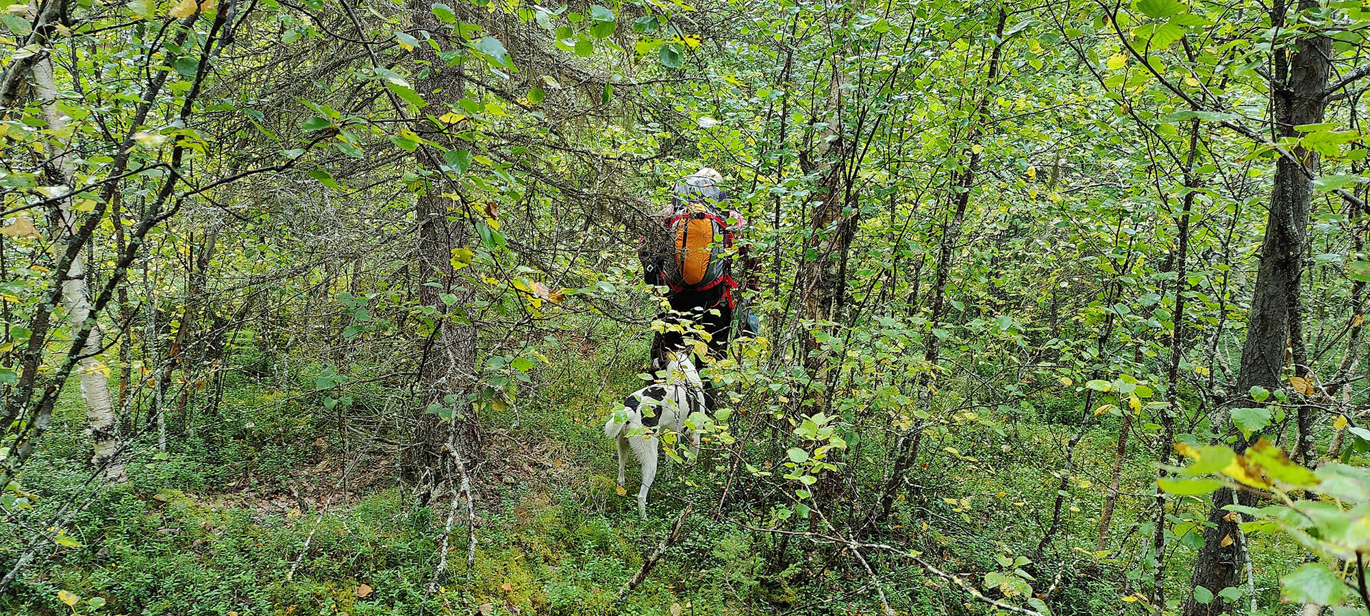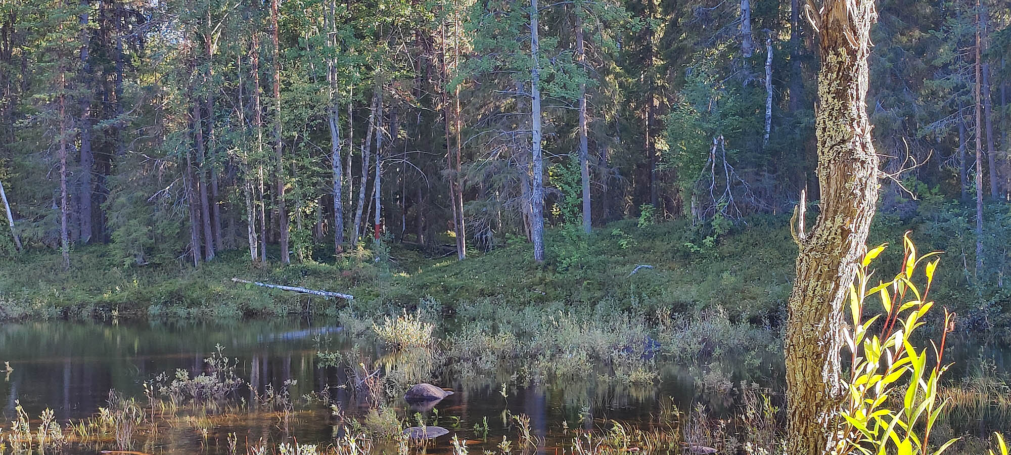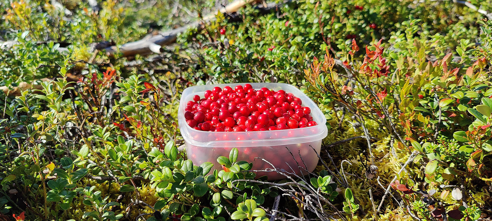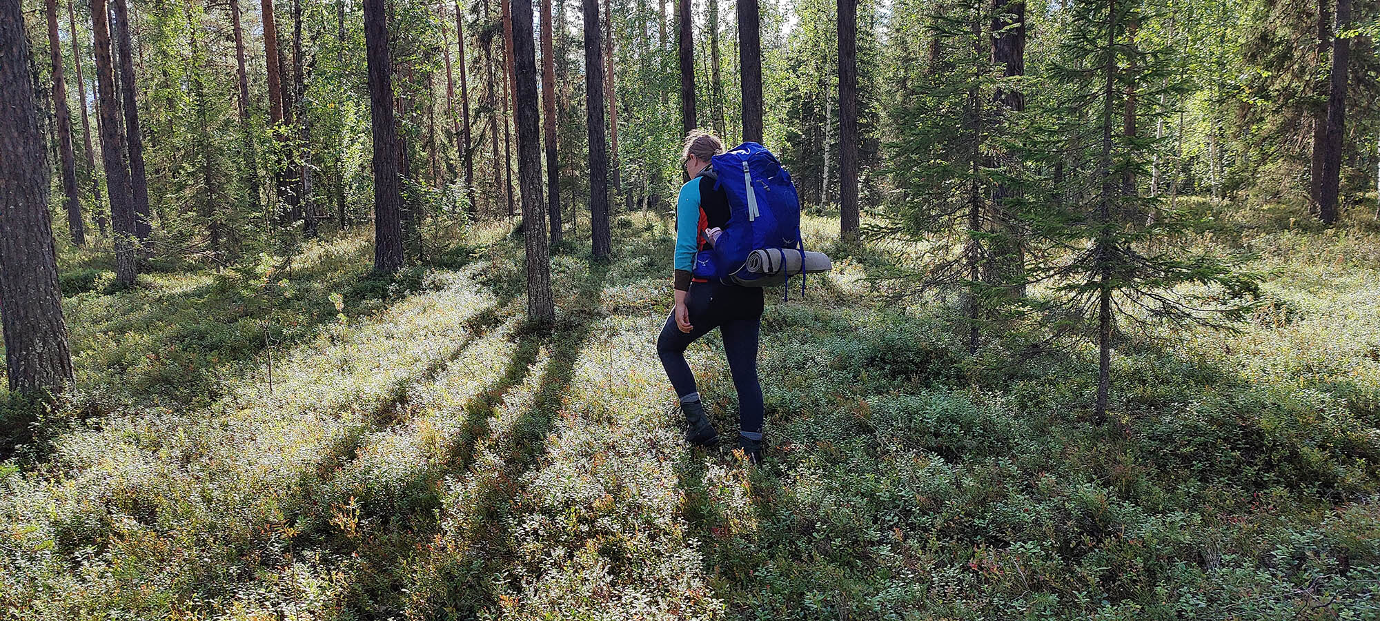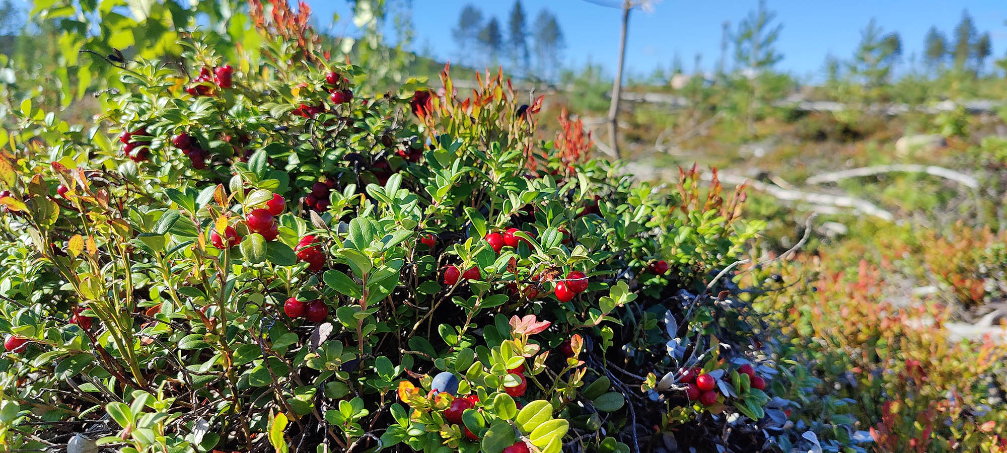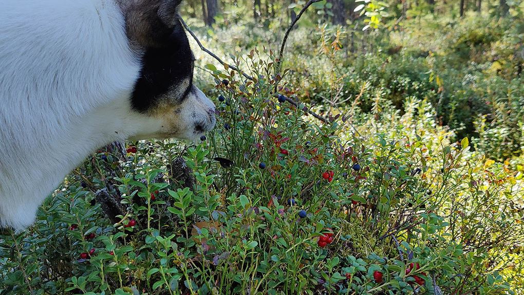 Det börjar bra, gles tallskog och lång sikt. Skogen kryllar av lingon som hänger i stora klasar i riset. Varje gång vi stannar till för att kolla hur vi ska gå eller dricker lite vatten passar Niják på att äta både lingon och blåbär. Snart är vi framme vid ett blötare område igen. Grästuvorna är nästan midjehöga på sina ställen och vi får vara noga med var vi sätter fötterna för att inte snubbla. Vi korsar första bäcken för dagen och kan konstatera att alla bäckar vi korsat i skogen har varit ganska små, bara ett långt kliv så är man över. Efter den första bäcken kommer vi fram till ett hygge, solen ligger på och det blir riktigt varmt och skönt. Vi gör ett kortare stopp och äter lite snacks. Lingonen lyser röda på marken och vi kan inte hålla oss. En tom matlåda i väskan fylls snabbt på med lingon som får följa med hem.