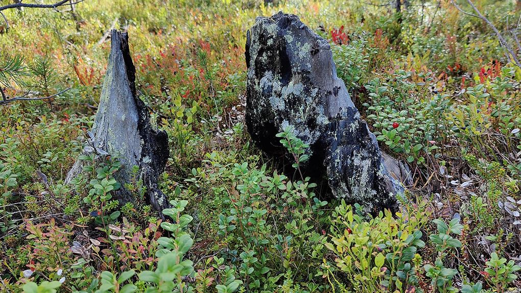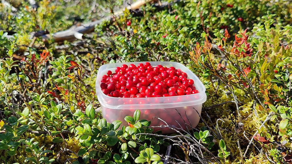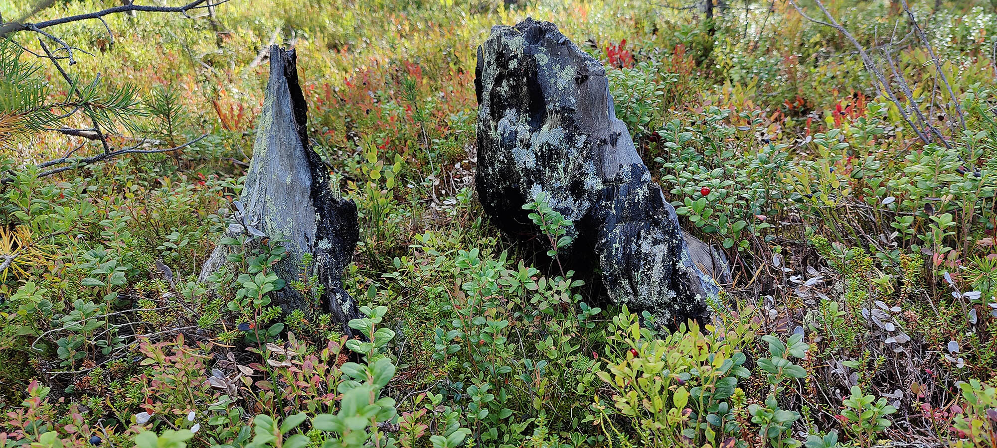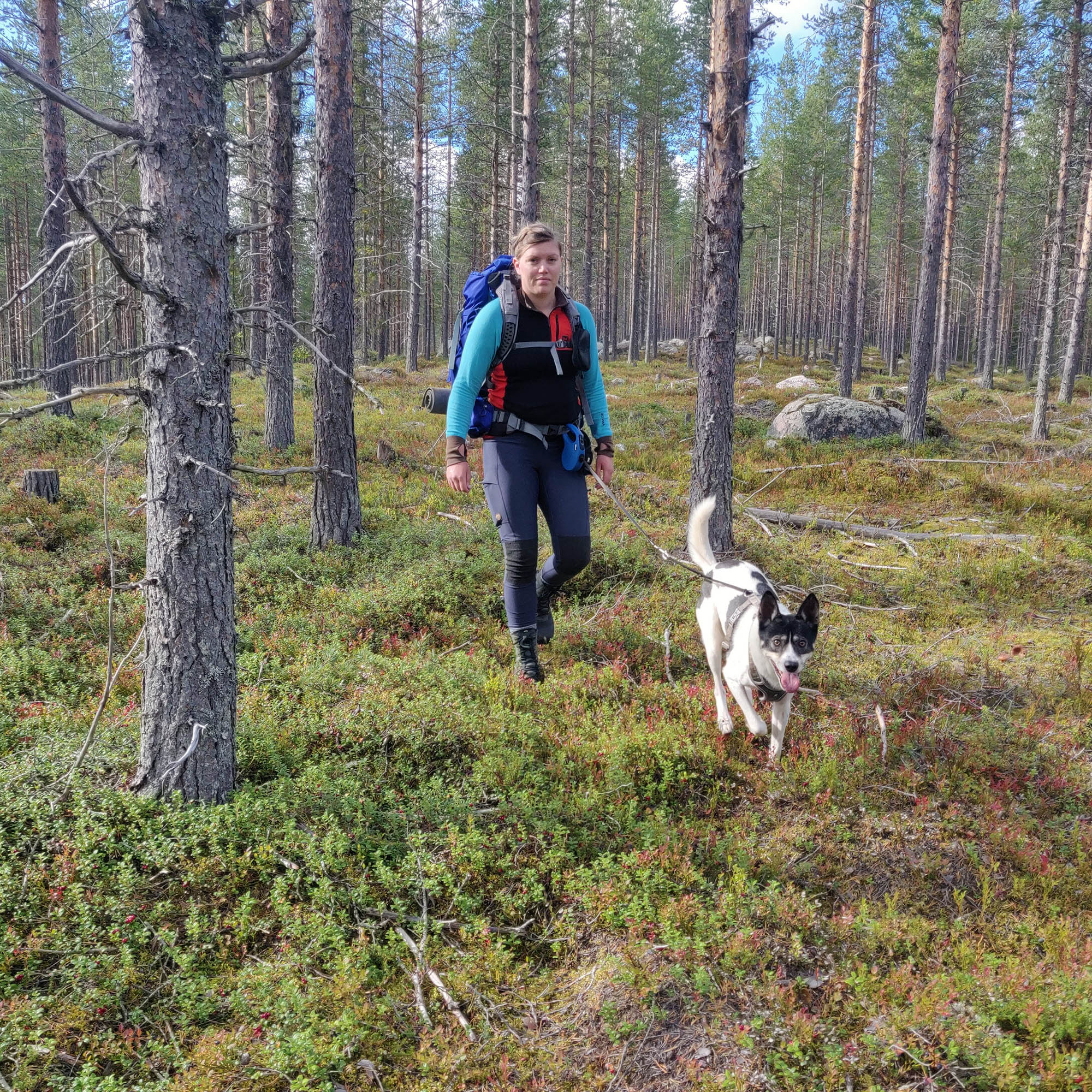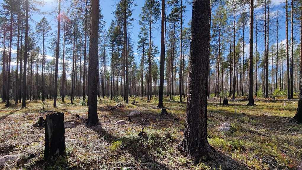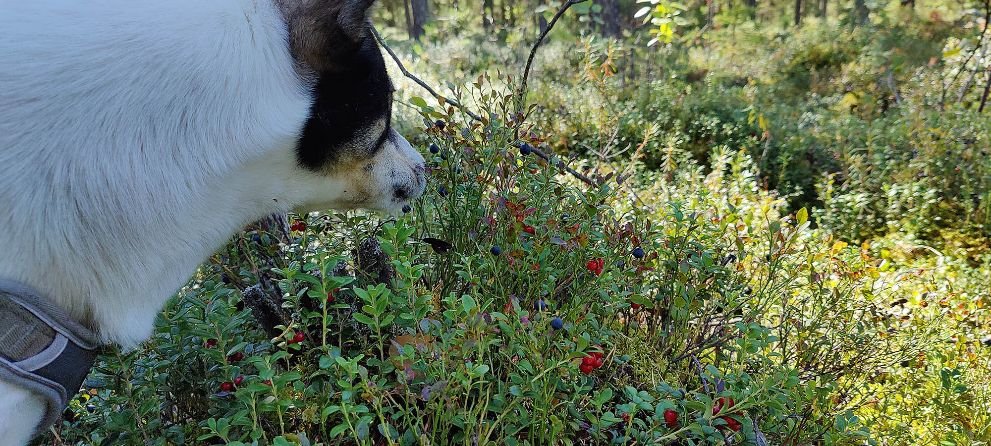 Det börjar bra, gles tallskog och lång sikt. Skogen kryllar av lingon som hänger i stora klasar i riset. Varje gång vi stannar till för att kolla hur vi ska gå eller dricker lite vatten passar Niják på att äta både lingon och blåbär. Snart är vi framme vid ett blötare område igen. Grästuvorna är nästan midjehöga på sina ställen och vi får vara noga med var vi sätter fötterna för att inte snubbla. Vi korsar första bäcken för dagen och kan konstatera att alla bäckar vi korsat i skogen har varit ganska små, bara ett långt kliv så är man över. Efter den första bäcken kommer vi fram till ett hygge, solen ligger på och det blir riktigt varmt och skönt. Vi gör ett kortare stopp och äter lite snacks. Lingonen lyser röda på marken och vi kan inte hålla oss. En tom matlåda i väskan fylls snabbt på med lingon som får följa med hem.
