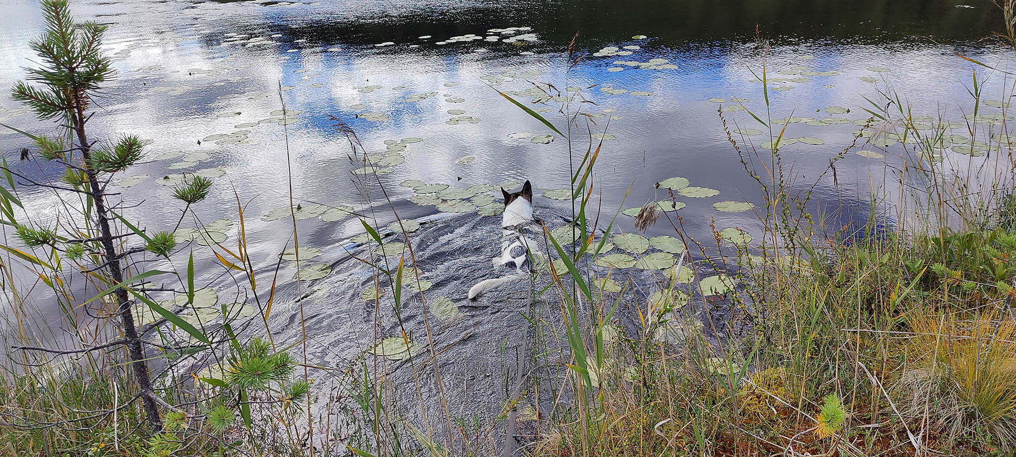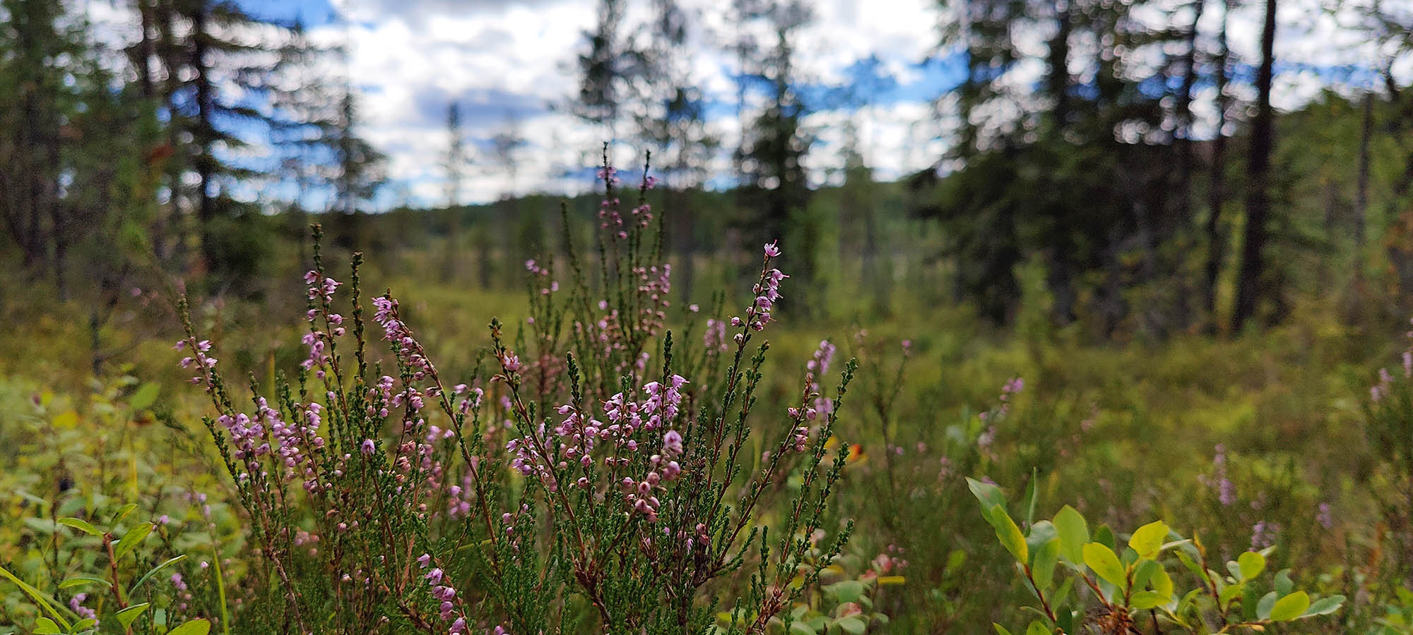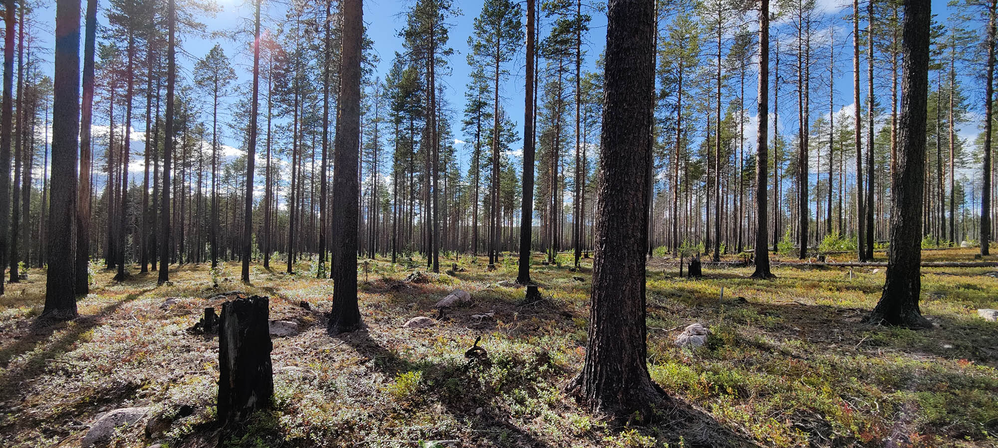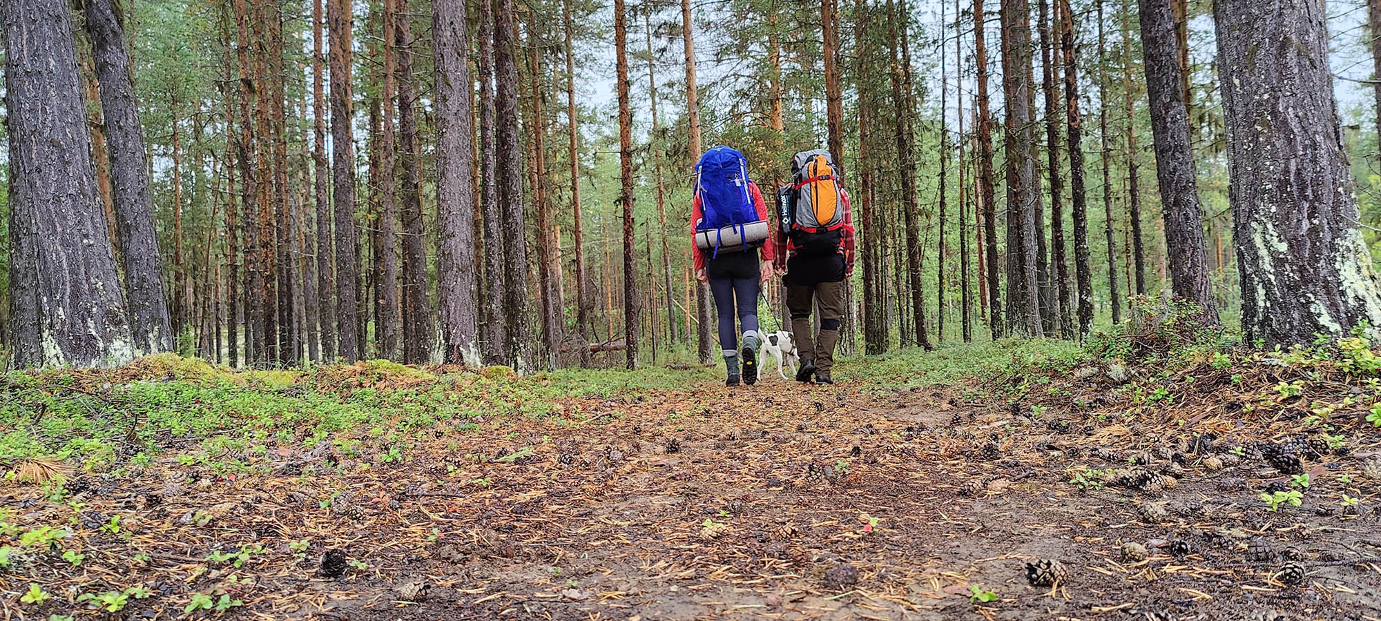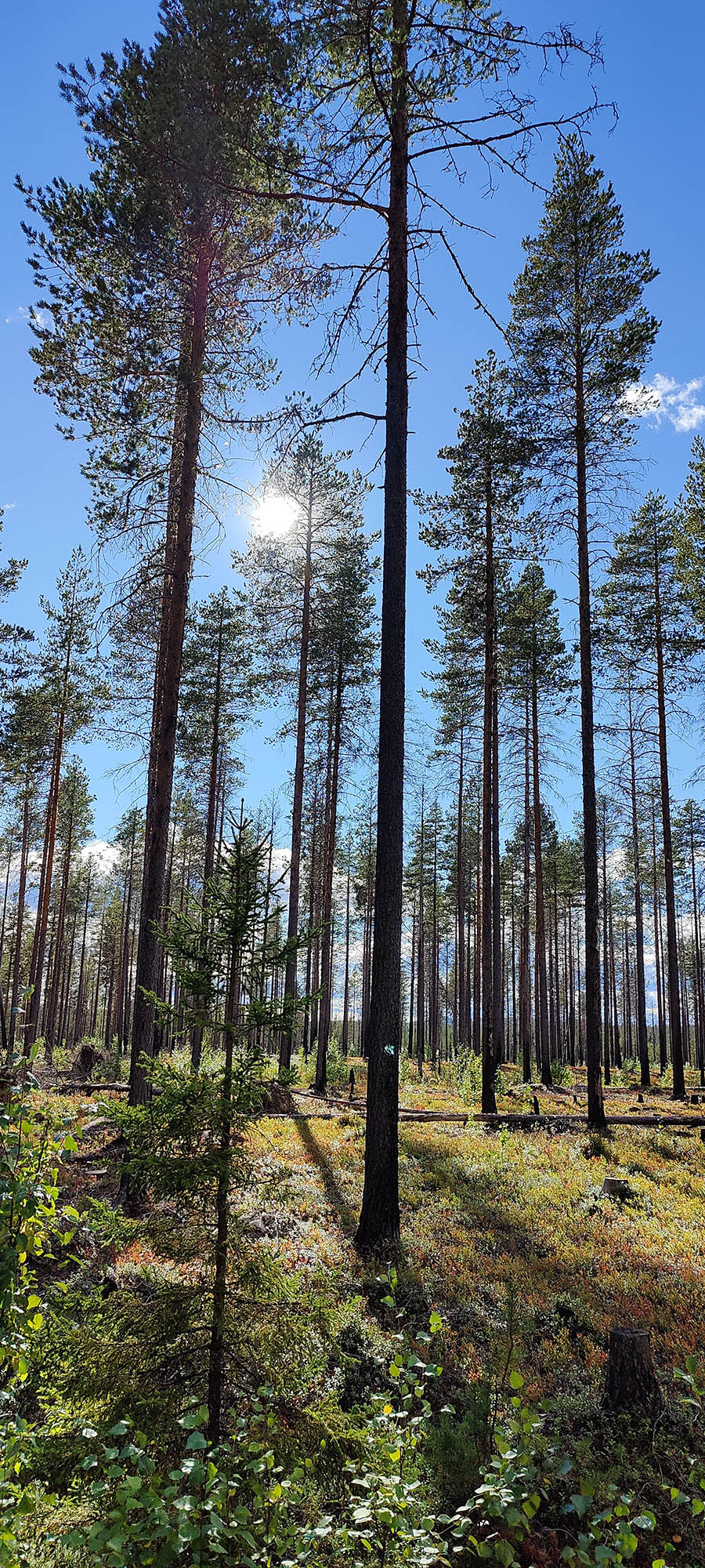 Det börjar bra, gles tallskog och lång sikt. Skogen kryllar av lingon som hänger i stora klasar i riset. Varje gång vi stannar till för att kolla hur vi ska gå eller dricker lite vatten passar Niják på att äta både lingon och blåbär. Snart är vi framme vid ett blötare område igen. Grästuvorna är nästan midjehöga på sina ställen och vi får vara noga med var vi sätter fötterna för att inte snubbla. Vi korsar första bäcken för dagen och kan konstatera att alla bäckar vi korsat i skogen har varit ganska små, bara ett långt kliv så är man över. Efter den första bäcken kommer vi fram till ett hygge, solen ligger på och det blir riktigt varmt och skönt. Vi gör ett kortare stopp och äter lite snacks. Lingonen lyser röda på marken och vi kan inte hålla oss. En tom matlåda i väskan fylls snabbt på med lingon som får följa med hem.