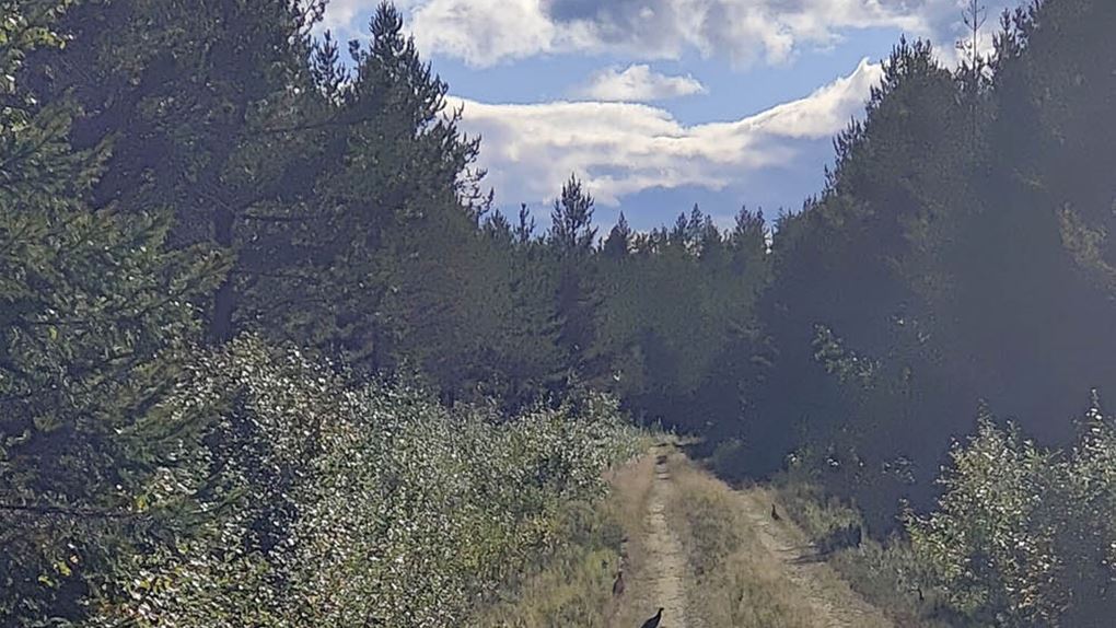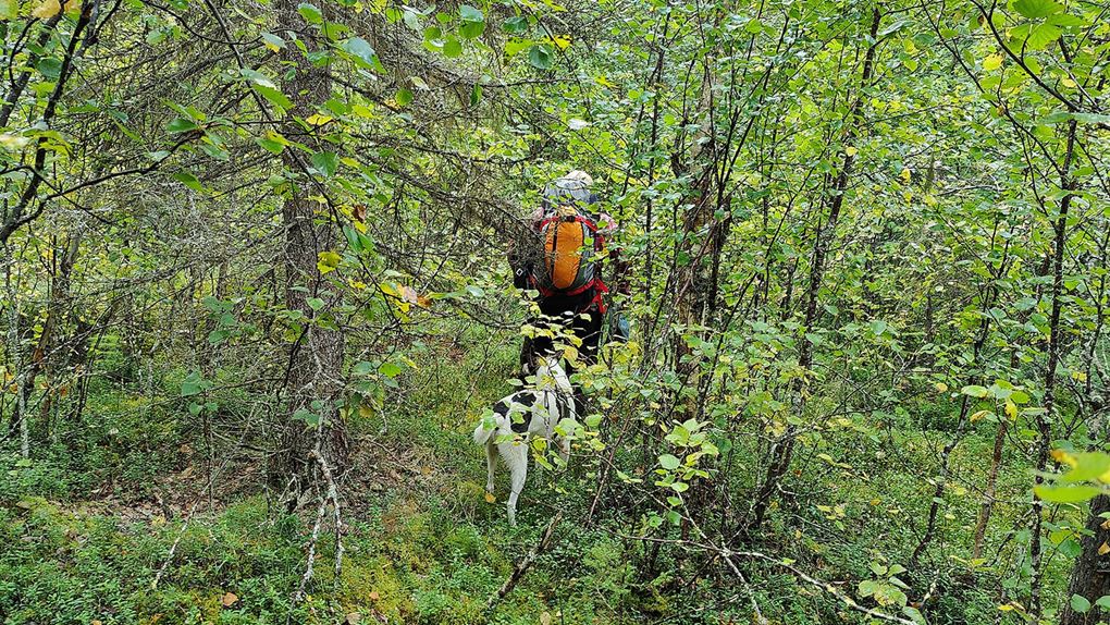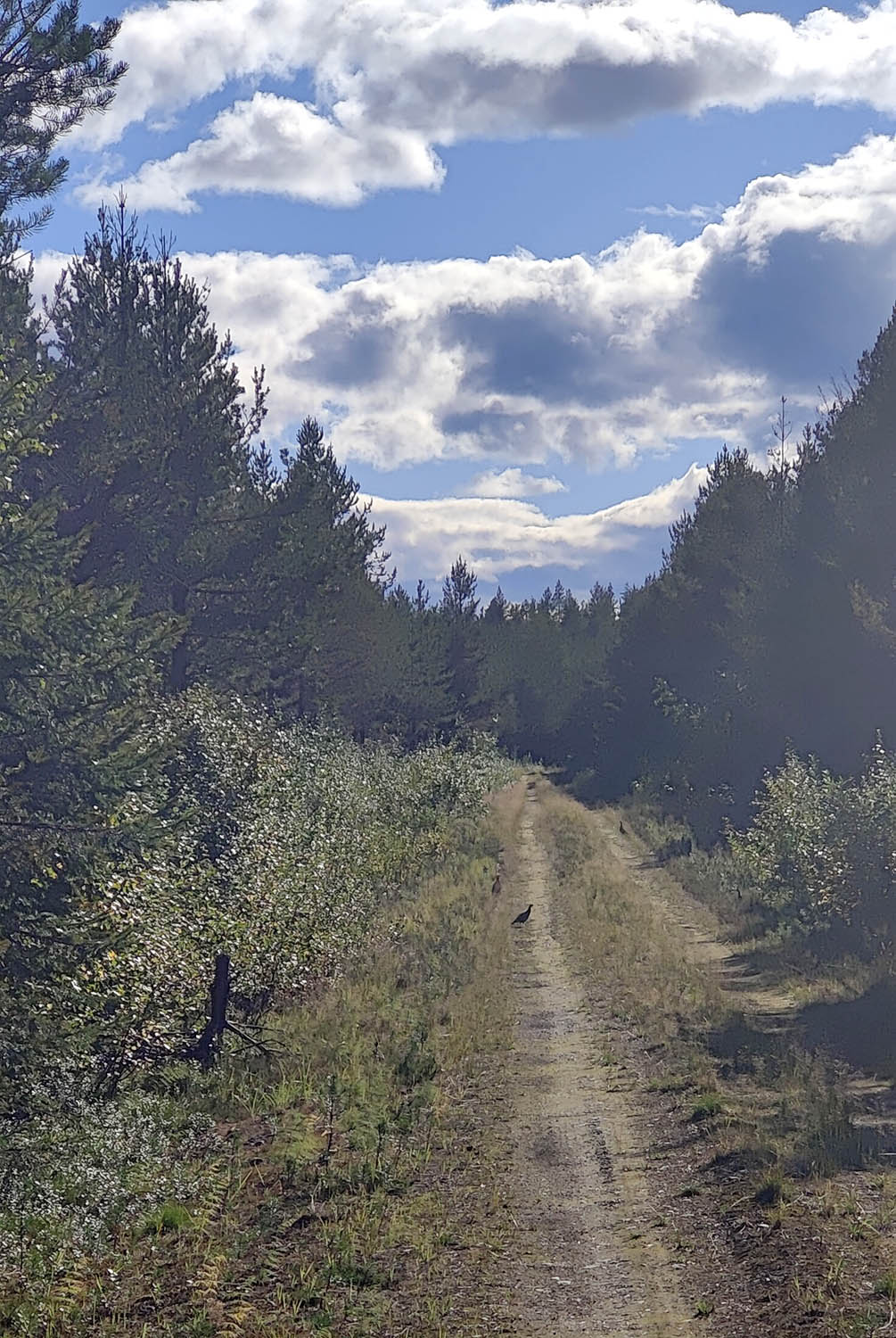 Den här sidan av berget är betydlig brantare än där vi gick upp, men nu går det ju nedför så det är skönt. Vi siktar på att komma fram till grusvägens vändplan. Skogen varierar mellan blandskog, tallskog och ungskog. Men överlag är det lätt att gå. Väl framme vid grusvägen får vi syn på en morkulla som sitter mitt på vägen. Vi saktar in och försöker komma närmare för att få den på bild, men till slut tycker den att vi är för nära, den flyger iväg och tar med sig fem morkullor till. Efter ett tag gör vägen en krök och skogen öppnar upp sig, det är gles, fin tallskog och vi väljer att vandra rakt genom den istället för att följa vägen.