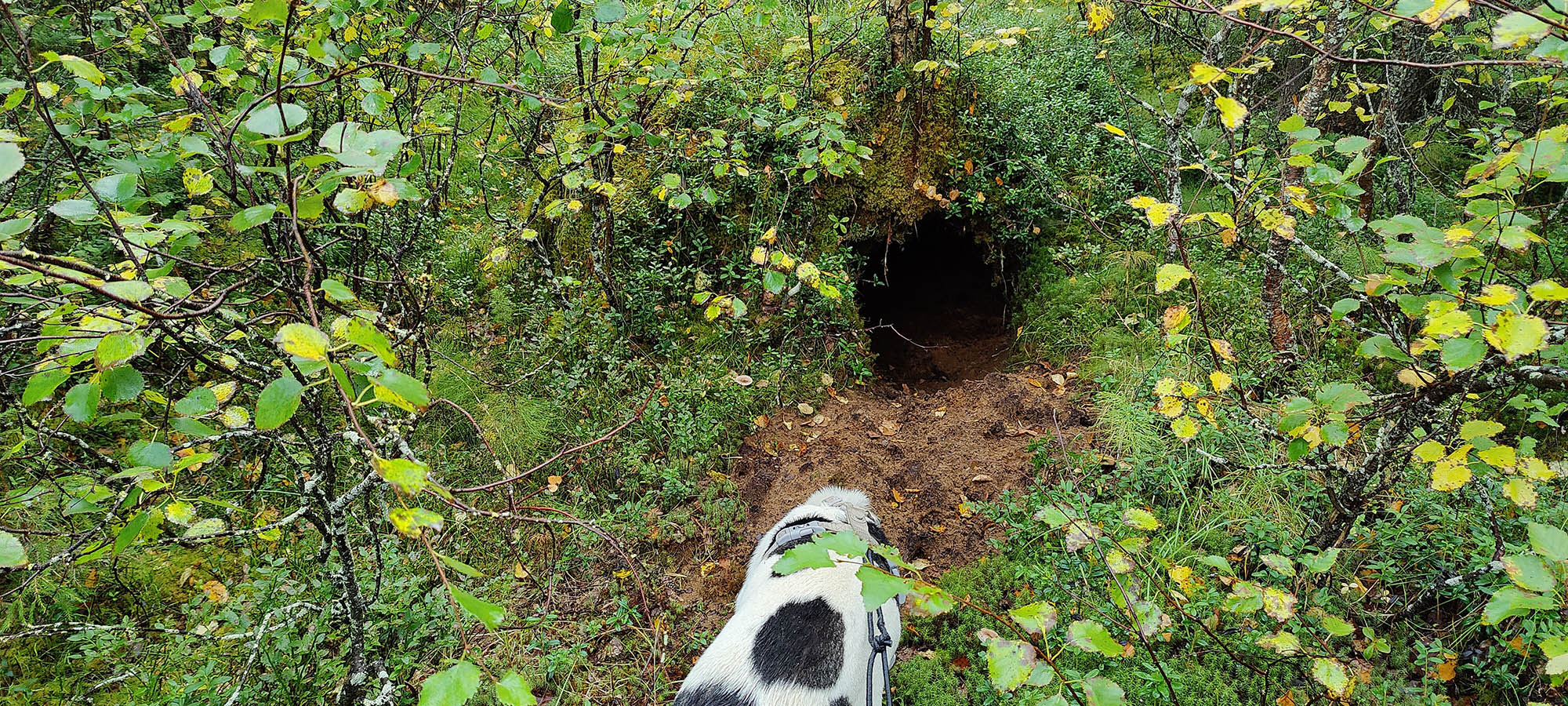 Vi sicksackar fram mellan träden, helt plötsligt försvinner Nijàk åt sidan så långt kopplet räcker. Han har blivit nyfiken på ett hål i marken. Det visar sig vara ett björnide men vi kan inte se några färska spår av björn och blir lättade. Den här gången var det ingen hemma men i vintras sov det nog en björn här.