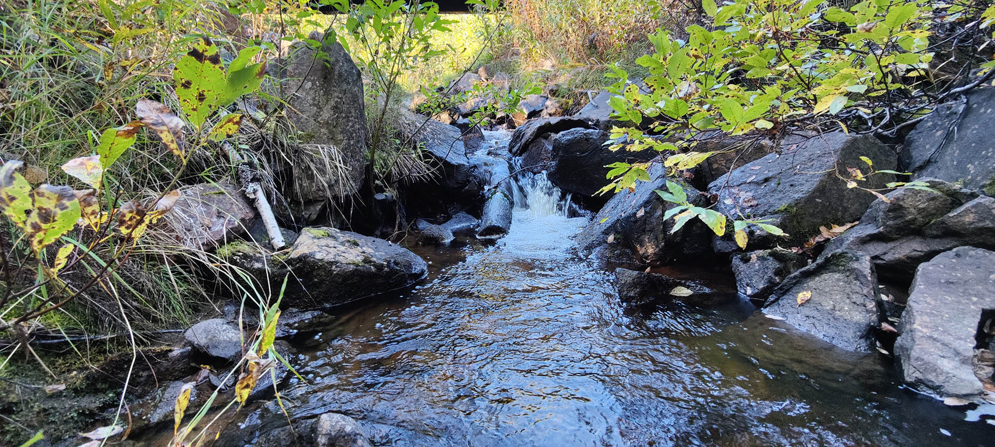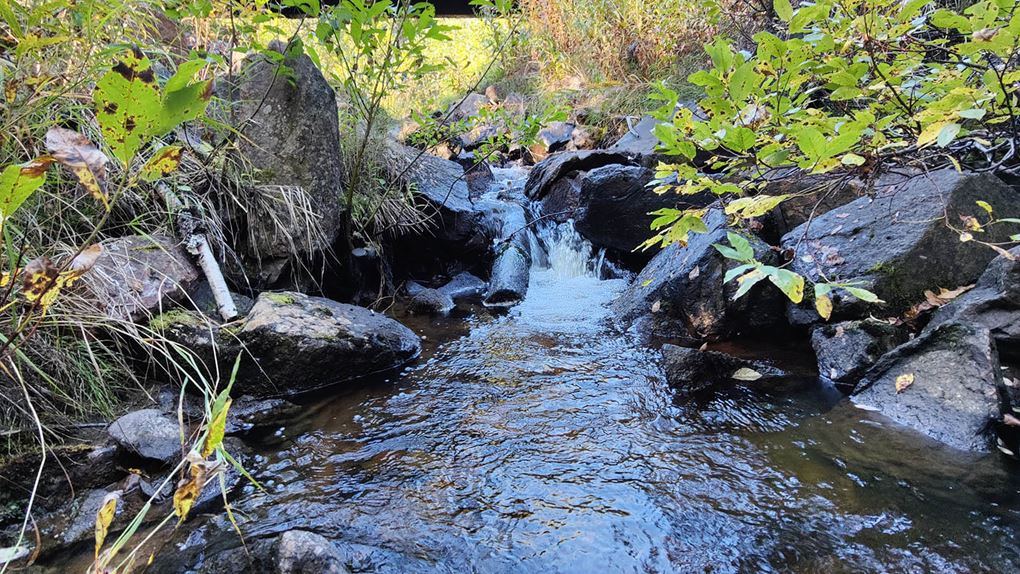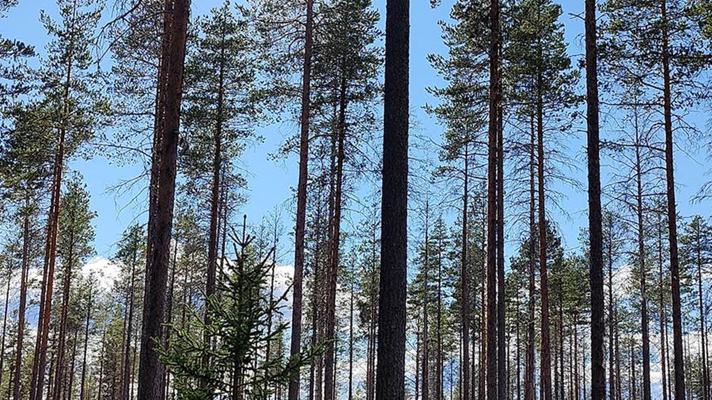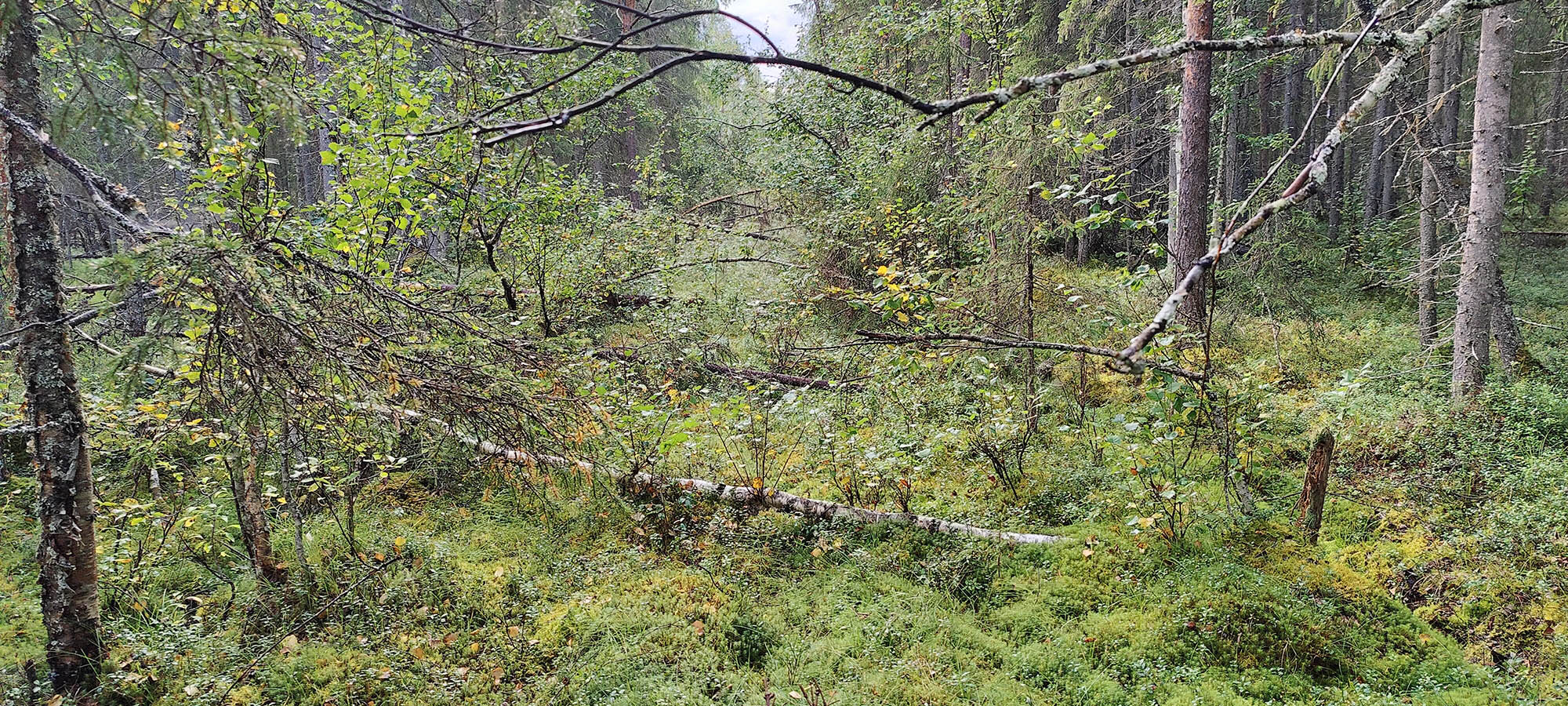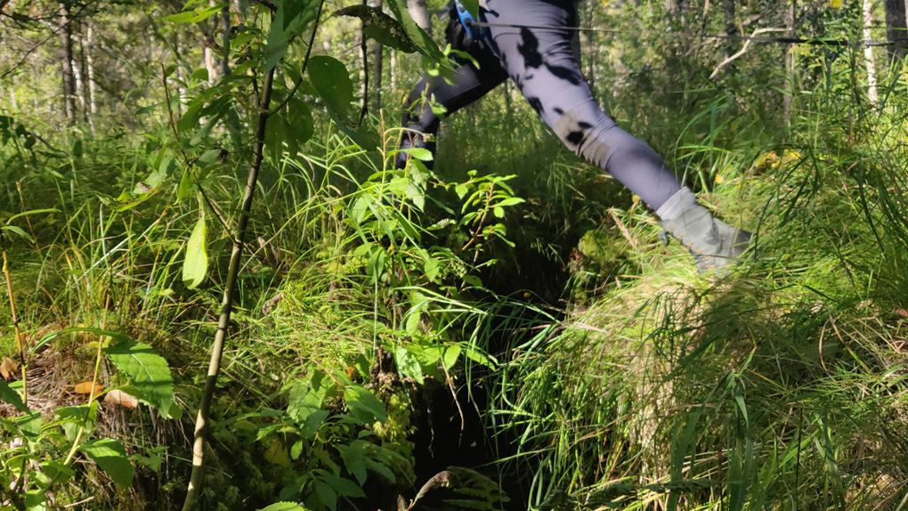 Planen är att vi ska gå genom skogen, korsa några bäckar, passera en gammal slåttermyr, via kraftledningen och ner till Stora Luleälven. I den här delen av ekoparken är skogen tät, träden är små och marken är blöt. Men vi kämpar på. Förmiddagens regnskur gör att vi trots uppehåll blir blöta av att gå genom den täta skogen.