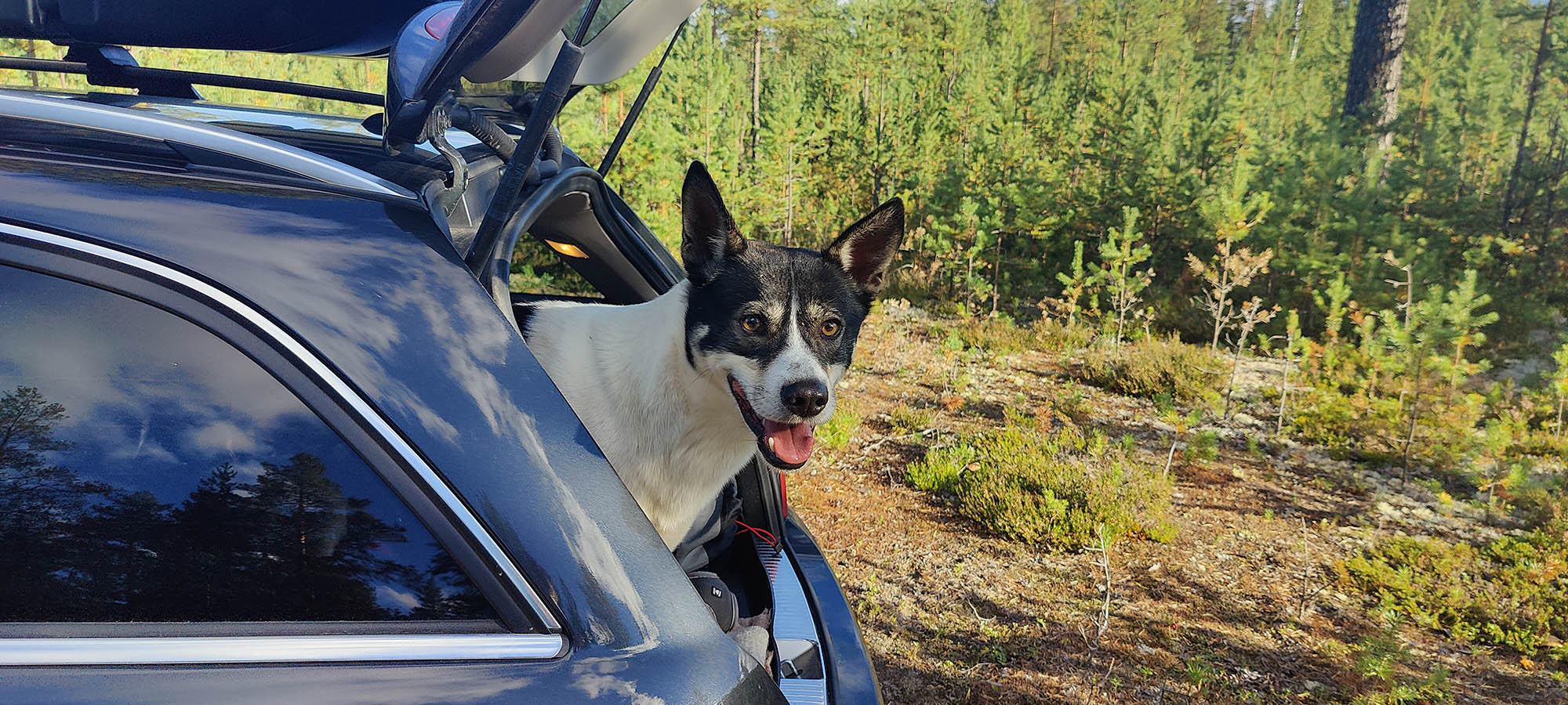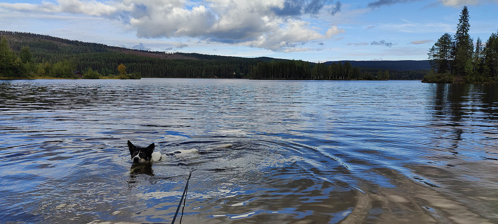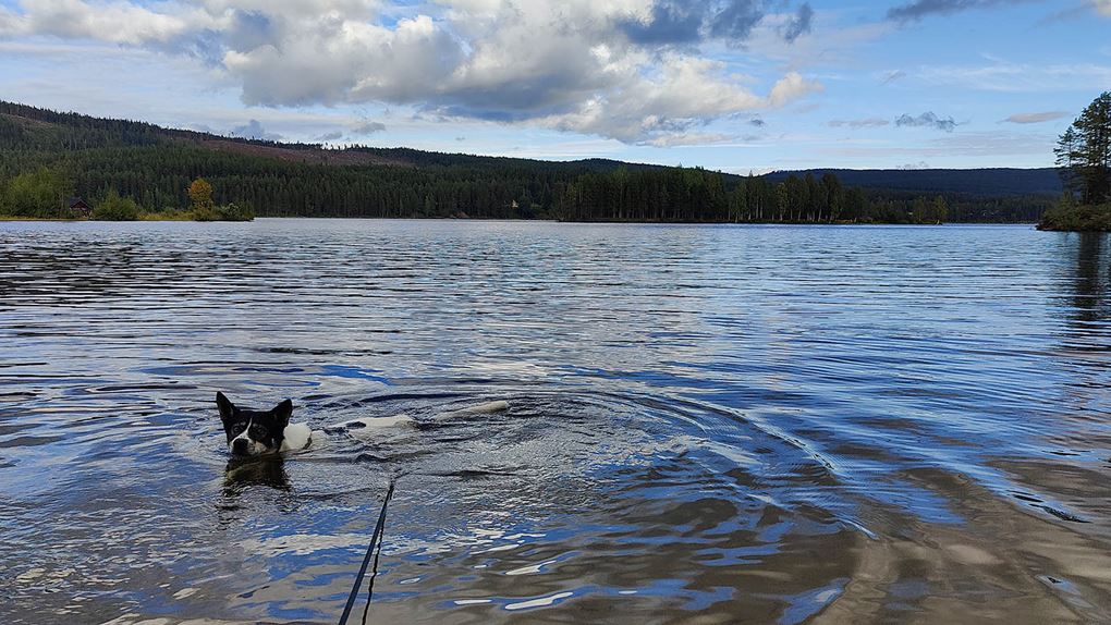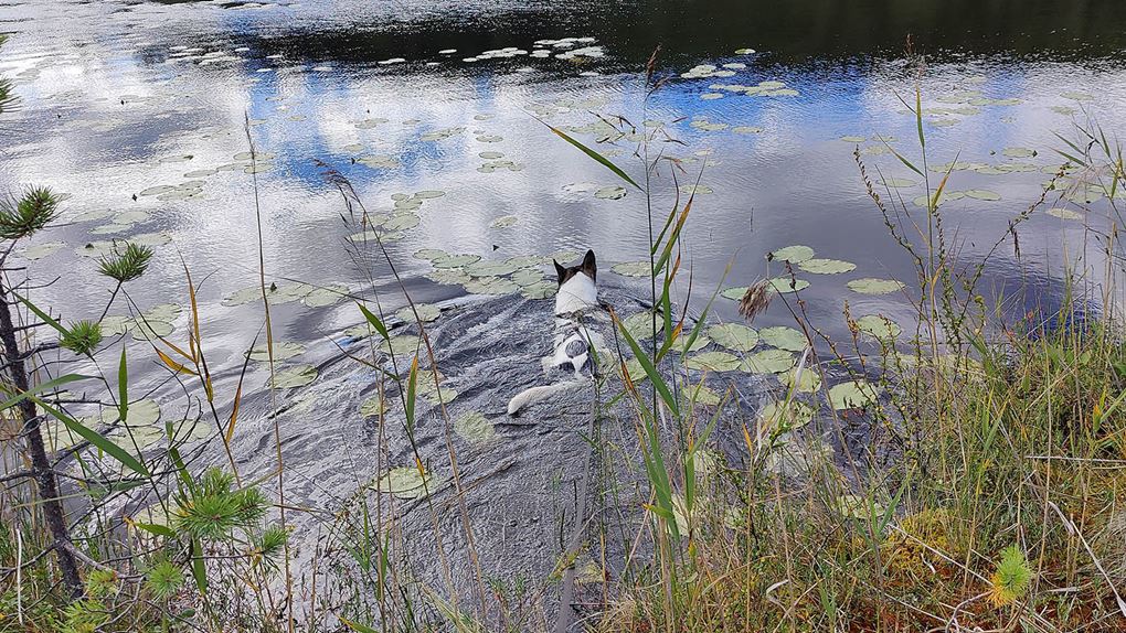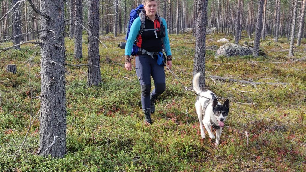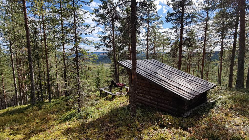 Sträckan mellan kraftledningen och Kainotjärn är fin och lätt att gå på, vi följer spåret fram till tjärnen och även här tar Niják ett dopp. Vi stannar inte kvar här utan vänder på klacken och siktar in oss på Kainoberget istället. Vi går upp längs den nordvästra sidan av berget, det går stadigt uppför. Pulsen stiger och andhämtningen ökar, jag har det bra med draghjälp från Niják. Men snart är vi uppe på toppen, skogen växer runt hela berget men är glesare på sina ställen. Det går att få fina glimtar av Stora Luleälven och söderut ser man ut över myrar och Padjerimsberget. På den södra sidan av berget finns det flera klippor och branter, man får ha koll på var man sätter fötterna om man går åt det hållet. Vi har siktet inställt i sydostlig riktning istället och när vi passerat toppen får vi syn på ett vindskydd med eldstad och bänkar. Riktigt fint läge med utsikt mot Lilla Luleälven.