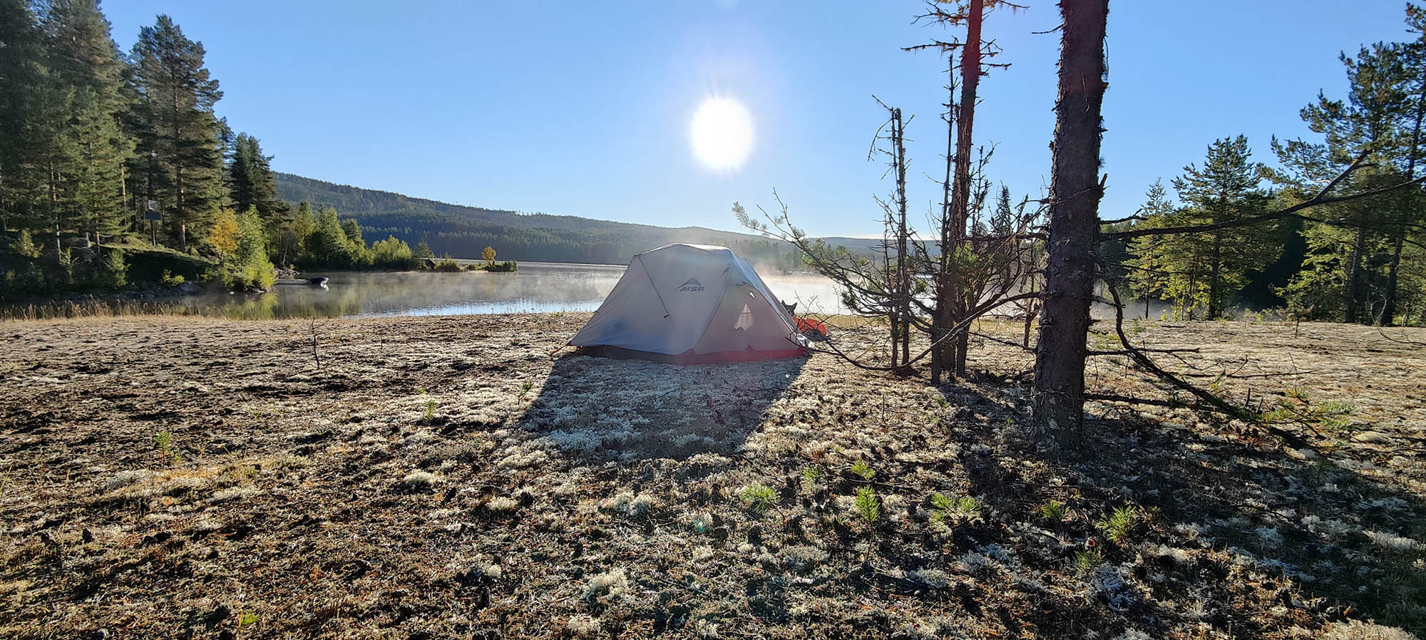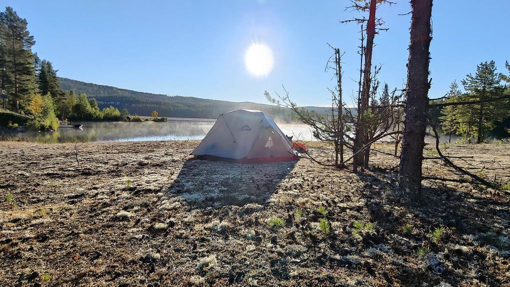 Nästa morgon vaknar vi av solstrålar som lyser upp tältet. Det syns tydligt hur vattnet rör sig då stråk av dis följer med längs vattenytan. Solen går upp tidigt men det blir inte varmt ännu på ett tag. Vi tar en lugn morgon, tänder ytterligare en brasa på stranden och diskuterar hur dagens tur ser ut. Vi hoppas och tror på bättre terräng än igår men det kommer också vara en längre sträcka och fler höjdmeter. Redan innan vi börjar gå har vi planerat om vår rutt. Vi bestämmer oss för att följa vägen som går upp mot Dalheden upp på höjd innan vi viker av in i skogen och hoppas med det att få ha torra fötter ett tag i alla fall. Efter cirka 1,5 km längs vägen ser vi en rågång som går i rätt riktning så vi viker av längs den.