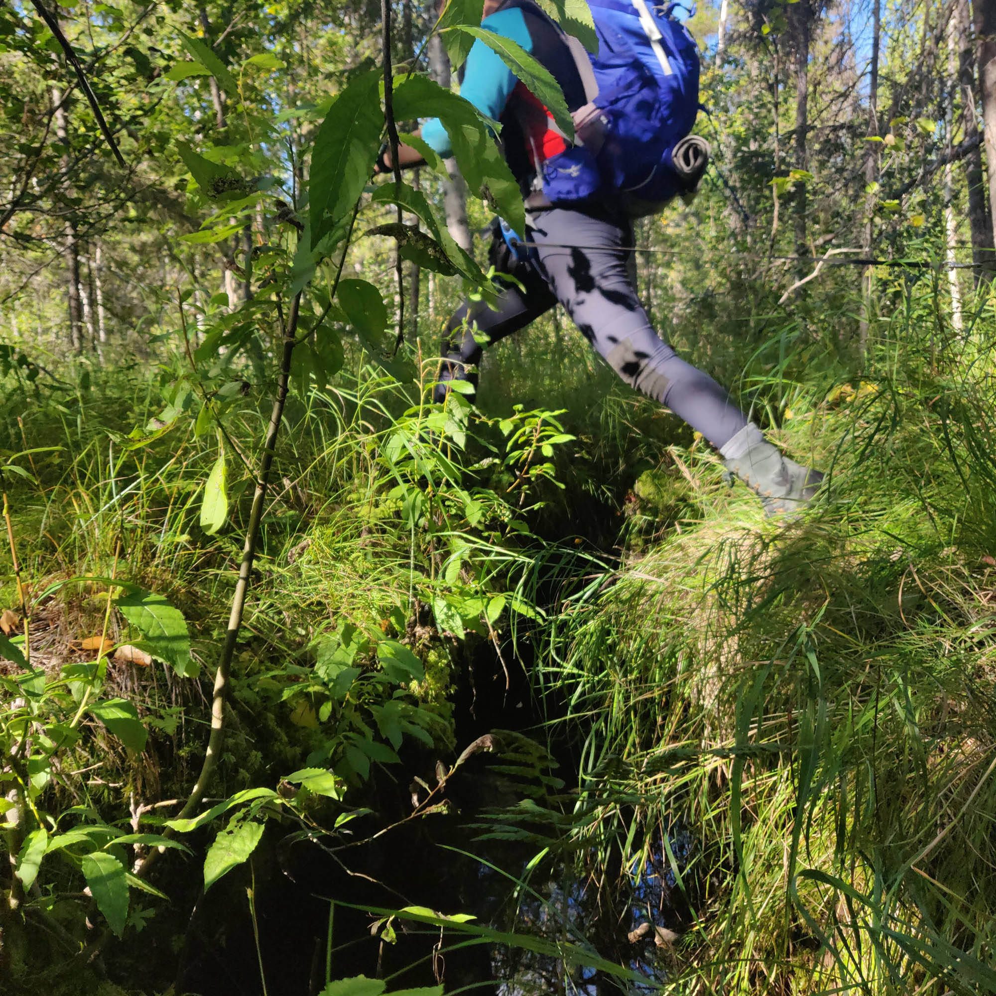 Jag hade hoppats att det skulle fungera att gå mellan myrarna och blötområden som syns på kartan, men i verkligheten är inte gränserna lika tydliga. Vi får hoppa mellan tuvor och över vattenpölar medans molnen hänger lågt över våra huvuden. Skogen vi vandrar i nästan hela första dagen är jobbig, framförallt eftersom vi har ganska stora ryggsäckar på oss, tempot är lågt och vi rör oss framåt i sakta mak.
