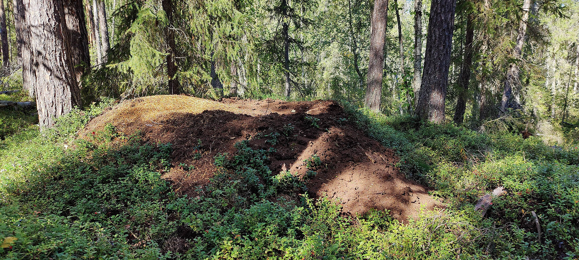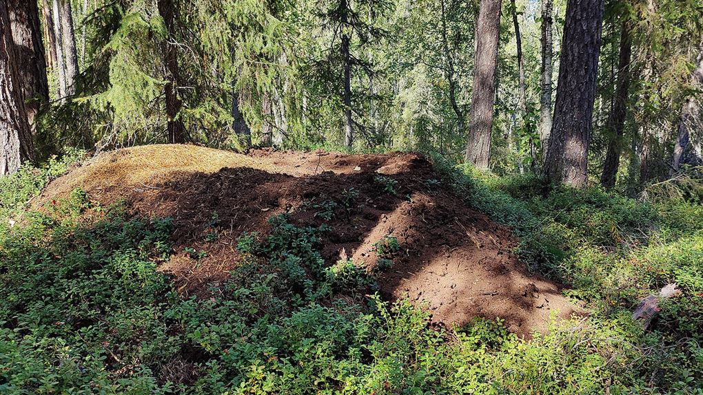 Efter hygget har vi en bäck till att korsa innan vi kommer fram till kraftledningen. När vi letar ett torrt stråk över ser vi en myrstack som någon har varit och grävt i. Kanske samma björn som hade bott i idet vi såg igår? Vi stannar vid kraftledningen och äter lunch, bara där kommer vinden åt så knott och mygg försvinner.