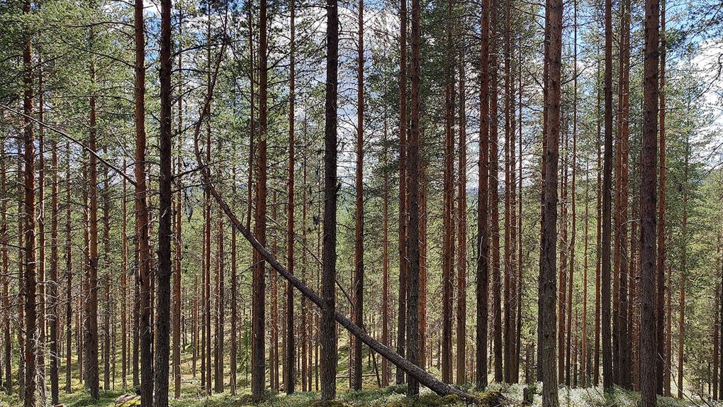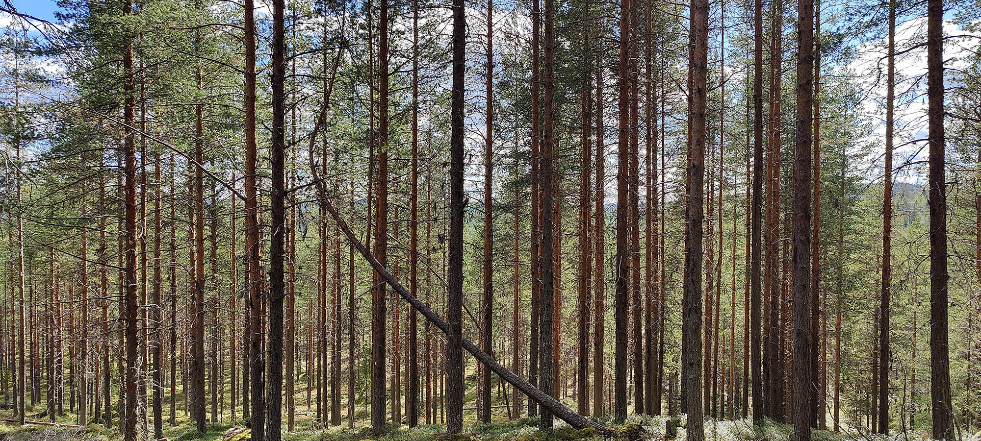 Vi fortsätter genom skogen och tar ut riktningen mot kraftledningen som korsar parken. En tydlig påminnelse om alla vattenkraftverk som finns i närområdet som påverkar naturen på alla möjliga sätt med infrastruktur och skiftande vattennivåer. Hur hade det sett ut här utan dem? Från kraftledningen fortsätter vi ner mot vägen, här är det lättare att gå. Inte lika tät skog och lite nedförsbacke.