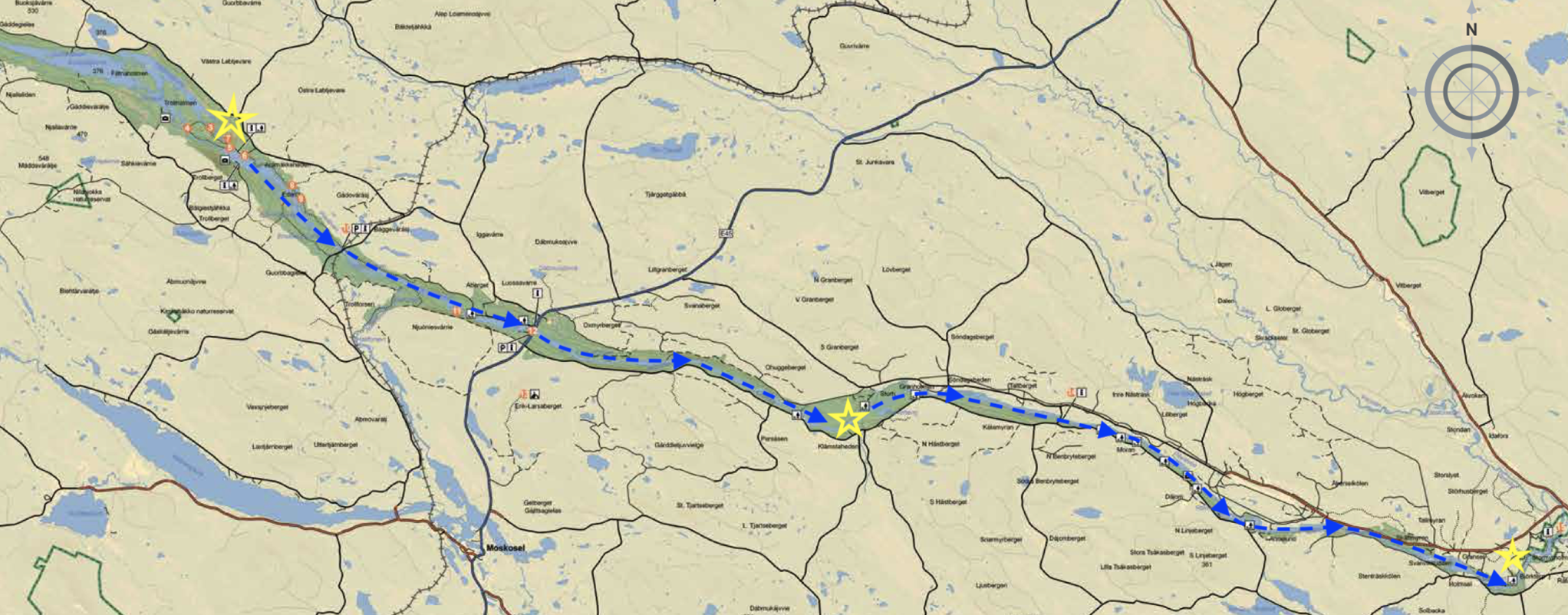 Eftersom jag ska paddla själv har jag av säkerhetsskäl valt att starta min paddling strax ovanför där väg 45 korsar Piteälven. I grunden är det en grundregel att man ska vara två när man paddlar, men jag har medvetet valt att frångå det vid några tillfällen. Detta medför att jag väljer att endast paddla de forsar som jag vet att jag verkligen klarar av utifrån min kompetens och erfarenhet.