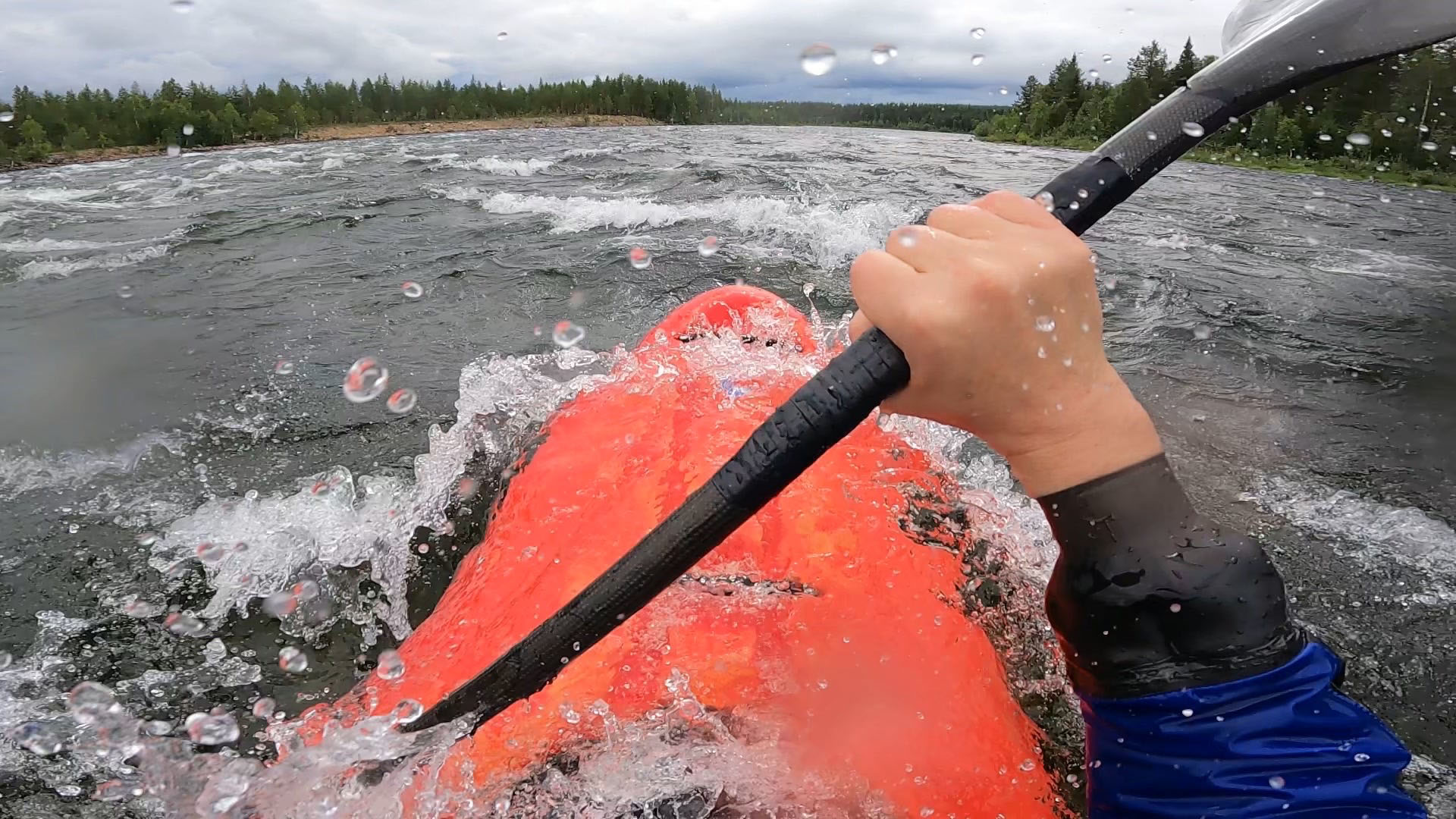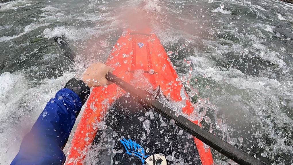 Paddlingen visar sig bli helt fantastisk! Det är bra fart på vattnet mellan forsarna och forsarna är absolut utmanande men inte alls skrämmande. Håller man en rekad linje visar det sig vara väldigt fina forsar, bitvis ett par meter höga vågor med fina bryt samt bra fallhöjd som gör att det verkligen går undan genom landskapet.