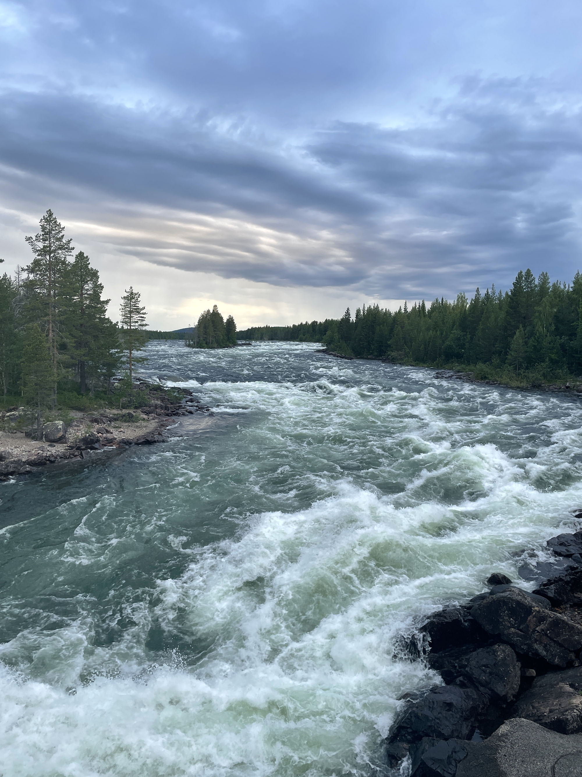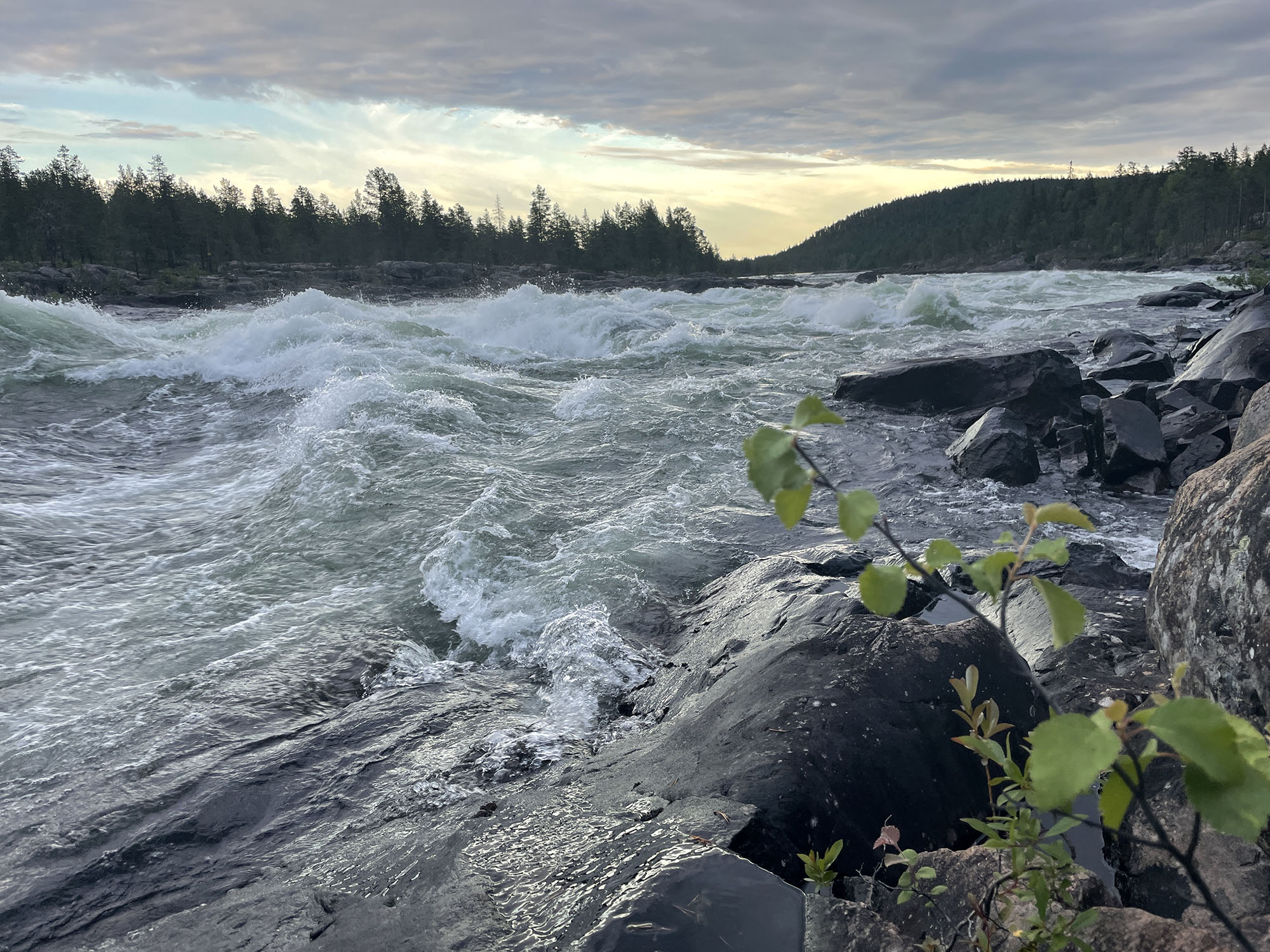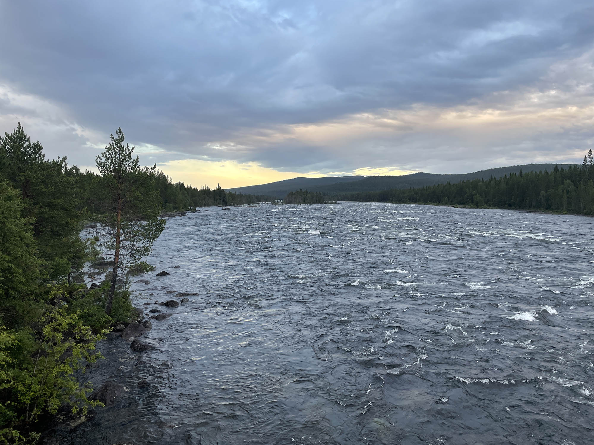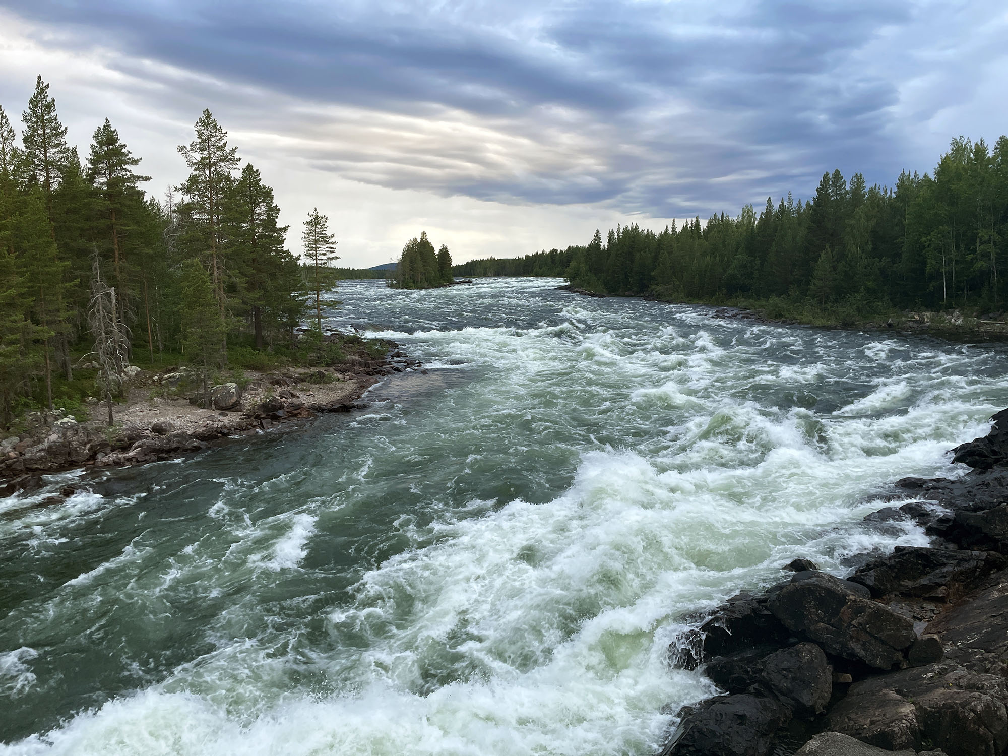 En kortare paddling idag gör att jag startar något senare än gårdagen. Strax före lunch sätter jag mig i kajaken i slutet av Benbryteforsen. Dagens etapp kommer att sluta vid Brudforsen som ligger precis ovanför Storforsen. Det är en viss utmaning att ta in så nära ovanför Storforsen, men jag känner mig trygg i det valet. Jag kommer ligga långt till vänster i sista forsen vilket gör att även om jag går runt och måste simma av någon anledning kommer jag att hinna in till land innan Storforsen.