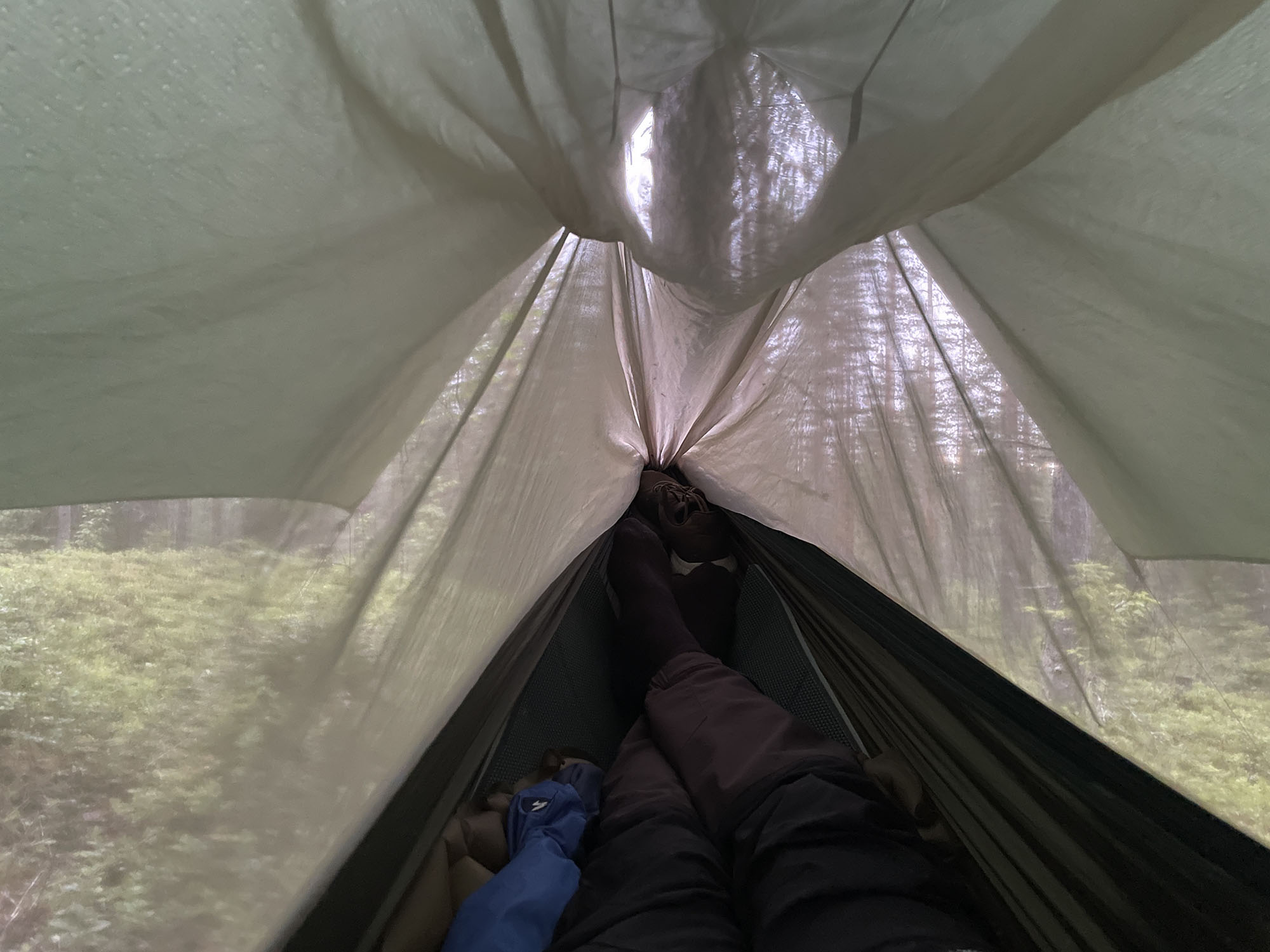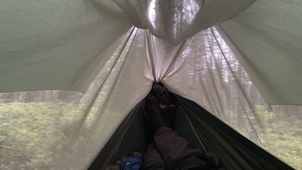 Väl framme vid älven sätter jag upp min hängmatta och spänner upp min tarp som skydd för regn och vind. Tyvärr hjälper tarpen föga mot mygg!