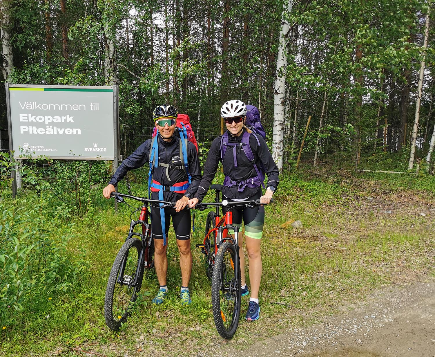 Snabbt gick vi upp och kokade gröt - för det behöver man innan långa träningspass - för att sedan snabbt packa ihop allt som kunde tänkas behövas. In med cyklarna, fjällryggsäckarna och löpryggsäckarna i bilen och sedan drog vi. Pappa lämnade av oss på södra sidan älven vid Ekopark-skylten vid "Stuor Giddon" där vårt äventyr startade.