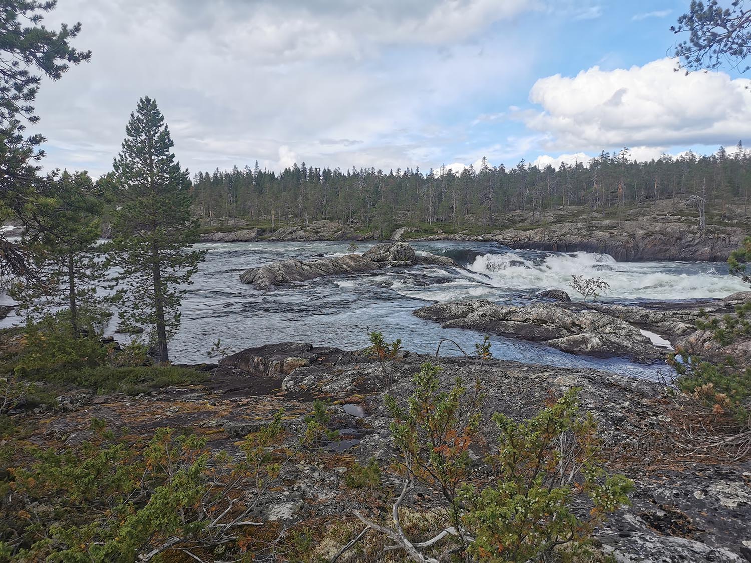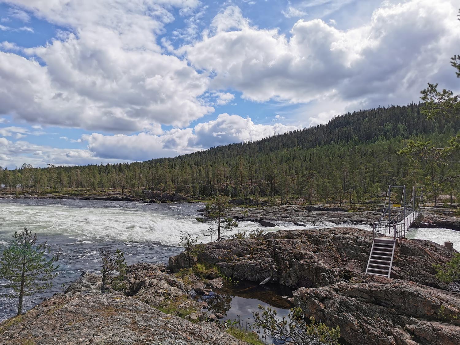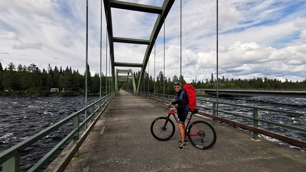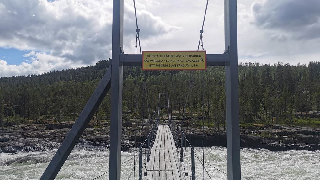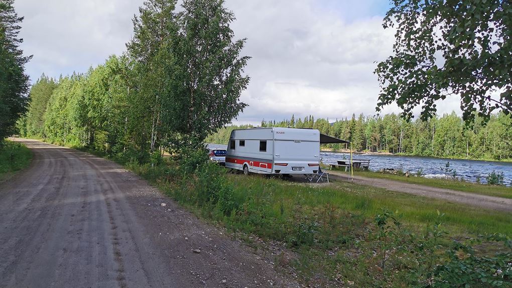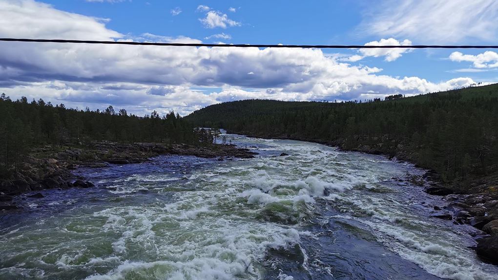 Vi cyklade på i lugn takt förbi Benbryteforsens fricamping där många husvagnar stod uppställda och förbi till Benbryteforsen som var vårt första mål. Mäktig fors där vi tog någon bild. Väldigt mycket vatten i Piteälven nu. Är det fortfarande smältvatten från fjällen eller har det regnat mycket? var något vi funderade på. Vi cyklade vidare en liten bit och tänkte att "det här kan ju inte ta så lång tid", när vi hunnit en fjärdedel av cykelfärden på mindre än en timme.
